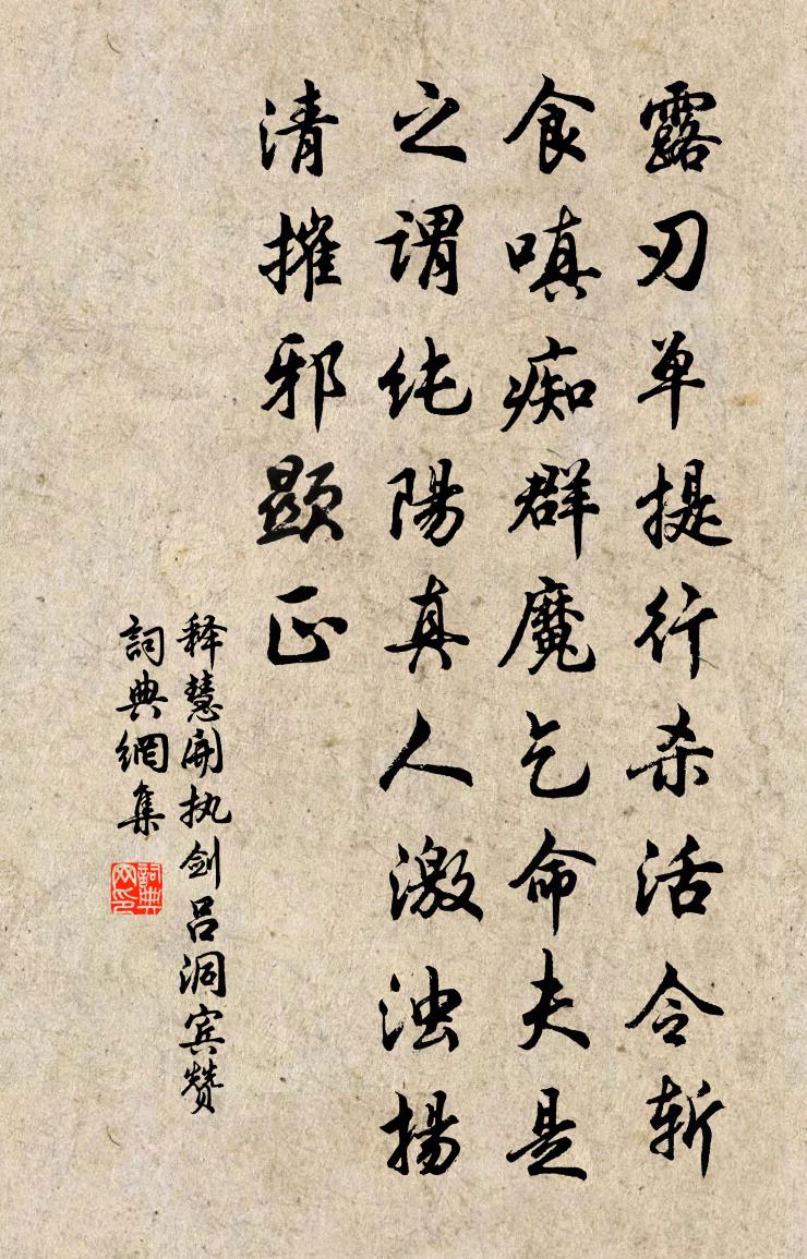 詩詞名句歷史字典書法欣賞書法字典國語詞典說文解字康熙字典古漢語字典標 題 作 者 詩 句 執劍呂洞賓贊作者:釋慧開 朝代:宋代執劍呂洞賓贊原文露刃單提,行殺活令。斬食嗔痴,群魔乞命。夫是之謂,純陽真人。激濁揚清,摧邪顯正。詩詞問答問:執劍呂洞賓贊的作者是誰?答:釋慧開問:執劍呂洞賓贊寫於哪個朝代?答:宋代釋慧開執劍呂洞賓贊書法欣賞執劍呂洞賓贊書法作品詩詞推薦浣溪沙(科辛卿壁間韻)韓淲〔宋代〕只恐山靈俗駕回。海鷗飛下莫驚猜。機心消盡重徘徊。宿雨乍晴千澗落,曉雲微露兩山排。新苗時翼好風來。郁孤台(再過虔州,和前韻)蘇軾〔宋代〕吾生如寄耳,嶺外亦閒遊。贛石三百里,寒江尺五流。楚山微有霰,越瘴久無秋。望斷橫雲嶠,魂飛咤雪洲。曉鍾次韻宋尚書山居十五詠竹徑方岳〔宋代〕此君老去更風猷,冰雪生寒我輩流。穿徑略容攜客共,交情疇昔雅相投。答仲章別後見寄韓維〔宋代〕會合非素期,追歡得同好。旅情忘郁約,春事入吟嘯。子行反崤鞏,我去旁嵩少。悵望洛陽花,金樽不同倒。贈天台王處士林嵩〔唐代〕深隱天台不記秋,琴台長別一何愁。茶煙岩外雲初起,新月潭心釣未收。映宇異花叢發好,穿松孤鶴一聲幽。赤城寄許師孟宋庠〔宋代〕鶗鴃三驚楚澤秋,迴腸更用斛添愁。燕台市駿千金骨,漢客逃名九罭鰌。木斷華樽俱失性,瓢空陋巷獨堪憂。夏畦隔浦蓮白居易〔唐代〕隔浦愛紅蓮,昨日看猶在。夜來風吹落,只得一回採。花開雖有明年期,復愁明年還暫時。又和王灼〔宋代〕風來雲度屋,雨過水盈科。懶覺詩篇少,閒看景趣多。垣間生薜荔,床下長娑羅。空法銷諸漏,端如迦葉波。冬至念母虞儔〔宋代〕兒行十里程,母心千里逐。昔昔子曾子,不忍離一宿。今我獨何為,旅食久輦轂。來時月中秋,坐待陽初復。薄命孟府判令嗣求法名興璞釋崇岳〔宋代〕真璞無瑕,實際無涯。心空及第,需 * 家。緣識宋太宗〔宋代〕承平無事上元節,絲竹歌聲更互發。自從雨後最晴明,不似往年今歲別。死來無意在遨遊,常愧三光明皎潔。千門清音亭陳洵直〔宋代〕水石何曾有古今,如絲如竹度高深。自疑扁榜通塵聽,百代潺潺無賞音。鄰園花成欲具旬會病未果二首王洋〔宋代〕矯春意謂已堅牢,次第千林散錦袍。恐有天魔妒妍好,遽連風雨作粗豪。讀趙氏淳化詩集李覯〔宋代〕少年曾誦習,誤認古人詩。風雅世不重,姓名誰得知。高情如隱者,薄宦過明時。地下尋才鬼,應逢陸與皮。虎川史堯弼〔宋代〕暴虎鬚袒裼,馮河必褰裳。想公川上嘆,誰與共行藏。一言感人邵雍〔宋代〕為女不嫁,為士不官。齊人一言,田子辭焉。中齋生朝陳杰〔宋代〕當家勛閥舊巍煌,天女裁云為制裳。胸飽治朝周典禮,篋余內苑漢詞章。經行禾黍關河遠,指點蓬萊日月長。故國送黃夢得文同〔宋代〕去年輕舳過巫山,今日羸驂度劍關。孤客每嗟隨斷梗,慈親常把夢連環。蘭陔歲晚雖堪采,桂窟春深正好攀。決取步虛四章白玉蟾〔宋代〕帝在蕊珠殿,騫林白鶴翔。方會琪花宴,遽聽青鸞歌。雲籠六六天,下界徒嗷嗷。爾不慕玉府,輪迴復奈何。上權郡孫承議黃庭堅〔宋代〕公家簿領如雞棲,私家田園無置錐。真成忍罵加餐飯,不如西江之水可樂飢。他人勤拙猶相補,身無功狀堪上府。名句推薦日落謝家池館,柳絲金縷斷。韋莊《歸國遙·春欲晚》 蓄疑敗謀,怠忽荒政佚名《尚書·周書·周官》 不要人夸好顏色,只留清氣滿乾坤。王冕《墨梅》 絲長魚誤恐,枝弱禽驚踐。崔護《五月水邊柳》 滿腹詩書漫古今,頻年流落易傷心。宇文虛中《在金日作·選二》 生事且瀰漫,願為持竿叟。綦毋潛《春泛若耶溪》 竹樹無聲或有聲,霏霏漠漠散還凝。杜荀鶴《春日山中對雪有作》 君子以同道為朋,小人以同利為朋脫脫《宋史·列傳·卷七十八》 雲拼欲下星斗動,天樂一聲肌骨寒。劉禹錫《八月十五夜桃源玩月》 稱是秦時避世人,勸酒相歡不知老。李白《山人勸酒》