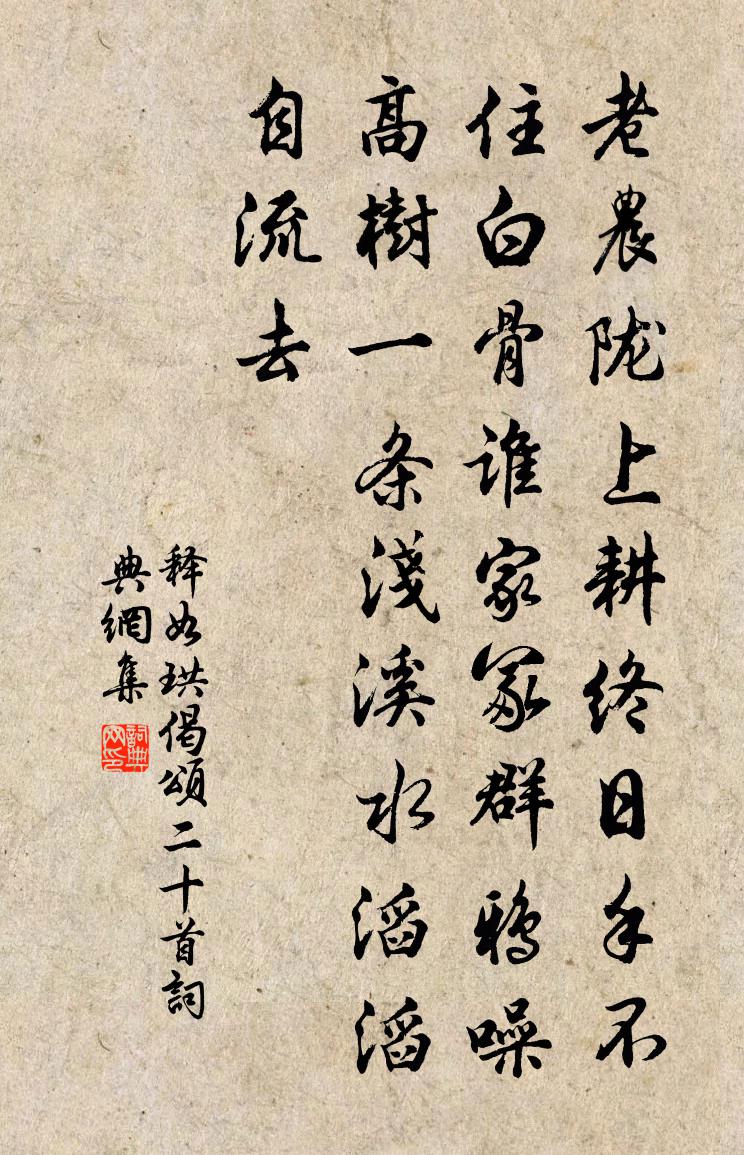 詩詞名句歷史字典書法欣賞書法字典國語詞典說文解字康熙字典古漢語字典標 題 作 者 詩 句 偈頌二十首作者:釋如珙 朝代:宋代偈頌二十首原文老農隴上耕,終日手不住。白骨誰家冢,群鴉噪高樹。一條淺溪水,滔滔自流去。詩詞問答問:偈頌二十首的作者是誰?答:釋如珙問:偈頌二十首寫於哪個朝代?答:宋代釋如珙偈頌二十首書法欣賞偈頌二十首書法作品詩詞推薦謝諸友移且游德及亭劉宰〔宋代〕老去疏文會,朋來愜素公。結廬慚遠引,挈榼荷親臨。反旆孤成約,臨池得勝尋。鳥飛青嶂遠,魚戲碧波深。揮塵贈越客趙嘏〔唐代〕故國波濤隔,明時心久留。獻書雙闕晚,看月五陵秋。南棹何當返,長江憶共游。定知釣魚伴,相望在汀州。次韻子瞻記十月十六日所見蘇轍〔宋代〕君不見天高后土黃,變化出入唯陰陽。旋凝細霧作飛雹,復遣震雷追日光。可憐萬物甚微細,坐聽百變隨顛僵。深晚次湖口有懷劉長卿〔唐代〕靄然空水合,目極平江暮。南望天無涯,孤帆落何處。頃為衡湘客,頗見湖山趣。朝氣和楚雲,夕陽映江樹。帝鄉過江陵和黃虛舟韻四首李曾伯〔宋代〕達人樂所樂,小智憂其憂。平生見飛鳶,常憶馬少游。門前車騎喧,孰與園林幽。虛舟苟欲去,鷗鷺猶當留。病癒寄友法振〔唐代〕哀樂暗成疾,臥中芳月移。西山有清士,孤嘯不可追。搗藥晝林靜,汲泉陰澗遲。微蹤與麋鹿,遠謝求羊知。王德言樞密生日十首曹勛〔宋代〕露華澄澹月痕秋,灝氣儲神侍帝猷。暫握元樞均造化,蒼生原看濟川舟。宮詞王仲修〔宋代〕艾虎釵頭映翠翹,菖蒲泛酒舞宮腰。不須更鑄江心照,皇帝聰明一似堯。臨江仙晏幾道〔宋代〕夢後樓台高鎖,酒醒簾幕低垂。去年春恨卻來時。落花人獨立,微雨燕雙飛。記得小苹初見,兩重心字羅衣。琵琶舟泊五聖祠前薛琦〔宋代〕葉落古祠前,村安許宿船。人聲齊到客,月色獨歸禪。野火明秋渚,山鍾出寺煙。推蓬不成寐,霜氣覽江天。請游山之日於黎廣文二首寺有萬竹劉學箕〔宋代〕此君原不俗,幽趣逼蒼官。濁世三庚熱,空山六月寒。何尤懷抱隘,便{左扌右監}水雲寬。敬請游盤日,追隨杖蝶戀花歐陽修〔宋代〕簾幕東風寒料峭。雪裡香梅,先報春來早。紅蠟枝頭雙燕小。金刀剪彩呈纖巧。旋暖金爐薰蕙藻。酒入橫波,困不淳熙已酉二月二日皇帝登寶位鎡獲廁廷紳輒成張鎡〔宋代〕聖父移居太母傍,鑾輿躬待襲龍香。乍從黃繖窺天表,愈覺英資似壽皇。題李山人幽居張籍〔唐代〕襄陽南郭外,茅屋一書生。無事焚香坐,有時尋竹行。畫苔藤杖細,踏石筍鞋輕。應笑風塵客,區區逐世名。次劉子野送別韻項安世〔宋代〕賈誼莫思行說背,陳湯空想郅支頭。子規枝上三更覺,白鷺山前萬事休。櫜矢戢戈歌四夏,帶牛佩犢免防秋。一犂三伏不熱郭印〔宋代〕三伏元無暑,連旬雨復陰。朝朝閒舊扇,夜夜擁重衾。日晦浮雲翳,天愁沴氣侵。烽煙猶未息,一念一傷心。郊廟歌辭。享龍池樂章。第六章崔日用〔唐代〕龍興白水漢興符,聖主時乘運斗樞。岸上丰茸五花樹,波中的皪千金珠。操環昔聞迎夏啟,發匣先來瑞有虞。風色自嘆虞儔〔宋代〕明經青史不難收,怪底依然處士裘。誰謂封侯安事筆,我聞定霸必焚舟。驥騰夷路須聯轡,鰲負三山好擲鉤。對策雜詠十首酬汪鎮卿林景熙〔宋代〕老來屏人事,北窗寄高眠。飄飄御風遠,銀闕開九天。虎豹不見嗔,豈予有仙緣。玉座覆紅雲,香爐霏紫煙。黃冠舫齋信筆范成大〔宋代〕燕居故可樂,病臥翻可憐。身閒儻更健,其人半神仙。既無揚州鶴,龍鍾任吾年。南齊深而明,略似西江船。船中名句推薦漠漠蕭蕭,香凍梨花雨。吳大有《點絳唇·送李琴泉》 淺不足與測深,愚不足與謀智,坎井之蛙,不可與語東海之樂。荀子《荀子·正論》 江山如畫,一時多少豪傑蘇軾《念奴嬌·赤壁懷古》 父兄教子弟,必正其身以率子,無庸徒事言詞也。王永彬《圍爐夜話·第三三則》 蠶無夏織桑充寨,田廢春耕犢勞軍。杜荀鶴《題所居村舍》 月落烏啼霜滿天,江楓漁火對愁眠。張繼《楓橋夜泊 / 夜泊楓江》 闌風伏雨催寒食,櫻桃一夜花狼藉。納蘭性德《菩薩蠻·闌風伏雨催寒食》 人生不可安閒,有恆業,才足收放心王永彬《圍爐夜話·第八三則》 蜀國曾聞子規鳥,宣城還見杜鵑花。李白《宣城見杜鵑花 / 子規》 柳垂江上影,梅謝雪中枝。晏幾道《臨江仙·身外閒愁空滿》