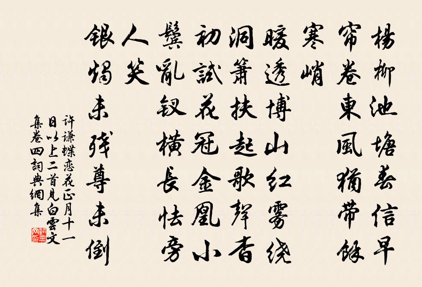 詩詞名句歷史字典書法欣賞書法字典國語詞典說文解字康熙字典古漢語字典標 題 作 者 詩 句 蝶戀花 正月十一日 以上二首見白雲文集卷四作者:許謙 朝代:元代原文楊柳池塘春信早。簾卷東風,猶帶餘寒峭。暖透博山紅霧繞。洞簫扶起歌聲杳。初試花冠金凰小。鬢亂釵橫,長怯旁人笑。銀燭未殘尊未倒。詩詞問答問:《蝶戀花 正月十一日 以上二首見白雲文集卷四》的作者是誰?答:許謙問:該詩寫於哪個朝代?答:元代問:該詩是什麼體裁?答:詞書法欣賞蝶戀花 正月十一日 以上二首見白雲文集卷四書法作品詩詞推薦春日雜興四首秦觀〔宋代〕潭潭故邑井,猗猗上宮蘭。不食自清渫,莫服更幽閒。志士恥弱植,卷跡甘饑寒。佳晨追良覿,觸物懸悲端。川途山行寄程帥陳造〔宋代〕雨餘支徑濕平沙,恰稱卑官下澤車。雜樹暝煙森立槊,亂峰迎客儼排衙。水禽時弄蹁躚影,野草爭開細碎花。久憶偈頌六十七首釋原妙〔宋代〕一葉落,天下秋。一塵起,大地收。有意氣時添意氣,不風流處也風流。摸魚兒(楊教之齊安任)鄧剡〔宋代〕笑平生、布帆無恙,堂堂穩送君去。江聲悲壯崖殷血,曾是英雄行處。今亦古。甚一點東風,天不周郎與。城幡夜出塞四首借用秦少游韻陸游〔宋代〕北伐下遼碣,西征取伊涼。壯士凱歌歸,豈復賦國殤。連頸俘女真,貸死遺牧羊。犬豕何足讎,汝自承餘殃。晚來姜特立〔宋代〕晚來山氣冷,松下獨閒行。野鳥聽人語,山靈警杖聲。慶元二年恭上太皇太后皇太后太上皇帝太上皇佚名〔宋代〕曾孫致養,五福駢臻。太極所運,兩備三辰。輝光日新,盧佑後人。永翼瑤圖,億萬堯春。王起居獨游青龍寺玩紅葉因寄羊士諤〔唐代〕十畝蒼苔繞畫廊,幾株紅樹過清霜。高情還似看花去,閒對南山步夕陽。憶吳處士賈島〔唐代〕半夜長安雨,燈前越客吟。孤舟行一月,萬水與千岑。島嶼夏雲起,汀洲芳草深。何當折松葉,拂石剡溪陰。惜落花贈崔二十四白居易〔唐代〕漠漠紛紛不奈何,狂風急雨兩相和。晚來悵望君知否?枝上稀疏地上多。嘲欽師吳芾〔宋代〕師與予心總愛山,從來已許伴予閒。若為一出俄經月,卻戀塵凡未肯還。同文顯過山居趙蕃〔宋代〕不惜露侵衣,俱行草徑微。論文尊有酒,竟日坐忘歸。誰謂吾居陋,能來好客稀。林園故多暇,杖屨莫相違。食冰孔武仲〔宋代〕冬冰冽冽雖可畏,夏冰皎皎人共喜。休論中使押金槃,荷葉裹來深宮裹。胸煩肺涸聊一蘇,任爾青蠅相趁死。經時南鄉子·梅花詞和楊元素蘇軾〔宋代〕寒雀滿疏籬。爭抱寒柯看玉蕤。忽見客來花下坐,驚飛。蹋散芳英落酒卮。 痛飲又能詩。坐客無氈醉不知。花盡喜雪用禁物體二首吳潛〔宋代〕一帳誰將罩太虛,但憐雁字不堪書。江山盡在光華里。宇宙真成渾沌初。險地豈容呈坎壈,荒林無復露空疎。下章安杜瀆七首姚寬〔宋代〕夢寐家山老歲華,何時滿眼送煙花。定知難取通侯印,亦許歸乘下澤車。挽思泉居士王柏〔宋代〕猶記年時訪故山,細聆舊話侍清閒。汲泉倚仗臨荒甃,尋塔呼僮斸野營。回首恍如前日事,傷心已隔夜泉關。手攜同安撫趙子直餞朱晦菴於懷安二首得重字林亦之〔宋代〕虎夷長想蕙蘭蹤,螺渚幸修桑梓恭。詩造本情天下誦,學傳正統世儒宗。三山過客日無數,西海聞人此一逢。官燭贈石先生陳師道〔宋代〕多方作計老如期,百疾交攻遽得衰。晚有勝緣逢異士,生須快意闕前知。迫人鬢頷紛紛白,臨事回迂種種遲。分我約吳遠遊與姜君弼吃蕈饅頭蘇軾〔宋代〕天下風流筍餅餤,人間濟楚蕈饅頭。事須莫與謬漢吃,送與麻田吳遠遊。名句推薦治大國,若烹小鮮。老子《老子·德經·第六十章》 芙蓉金菊斗馨香。天氣欲重陽。晏殊《訴衷情·芙蓉金菊斗馨香》 庭軒寂寞近清明,殘花中酒,又是去年病。張先《青門引·春思》 可與言而不與之言,失人;不可與言而與之言,失言。知者不失人亦不失言。孔子弟子《論語·衛靈公篇》 志,氣之帥也。孟子《孟子·公孫丑章句上·第二節》 末路驚風雨,窮邊飽雪霜文天祥《除夜》 君子以思患而豫防之。佚名《易傳·象傳下·既濟》 竹憐新雨後,山愛夕陽時。錢起《谷口書齋寄楊補闕》 不知何日東瀛變,此地還成要路津。劉禹錫《漢壽城春望》 亂石穿空,驚濤拍岸,捲起千堆雪。蘇軾《念奴嬌·赤壁懷古》