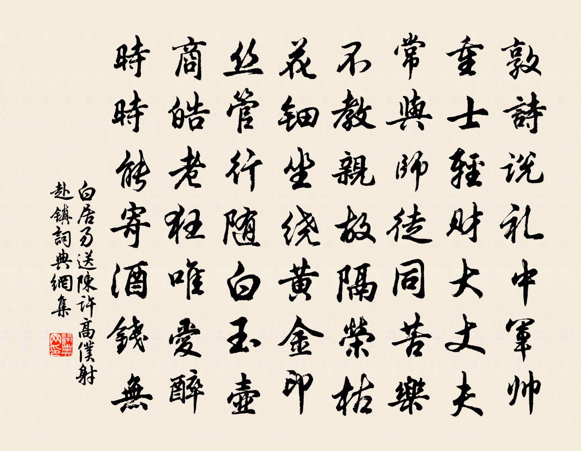 敦詩說禮中軍帥,重士輕財大丈夫。常與師徒同苦樂,不教親故隔榮枯。