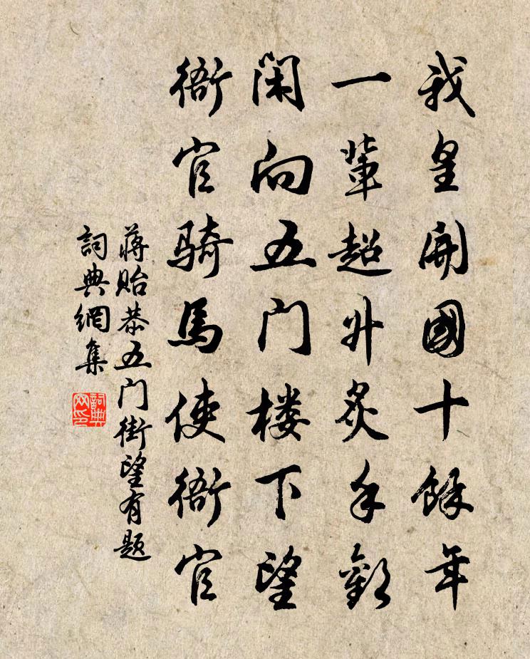 詩詞名句歷史字典書法欣賞書法字典國語詞典說文解字康熙字典古漢語字典標 題 作 者 詩 句 五門街望有題作者:蔣貽恭 朝代:唐代五門街望有題原文我皇開國十餘年,一輩超升炙手歡。閒向五門樓下望,衙官騎馬使衙官。詩詞問答問:五門街望有題的作者是誰?答:蔣貽恭問:五門街望有題寫於哪個朝代?答:唐代蔣貽恭五門街望有題書法欣賞五門街望有題書法作品詩詞推薦鄭華文輓詞樓鑰〔宋代〕蚤擅春秋學,賢關第一流。少公清澤國,贊府著神州。試邑人交薦,還朝譽更優。如何急流退,不使上瀛洲。秋懷王安石〔宋代〕城南平野寒多露,窗壁含風秋氣度。鄰桑槭槭已欲空,悲蟲啾啾促機杼。柴門半掩掃鳥跡,獨抱殘編與神遇。韓公鐘山馬之純〔宋代〕石城為虎此為龍,都邑無如此地雄。萬壑千岩皆拱北,三江七澤盡朝東。埋金依舊祥光現,鑿浦仍前地脈通。吳晉滿宮花·花正芳張泌〔唐代〕花正芳,樓似綺,寂寞上陽宮裡。鈿籠金鎖睡鴛鴦,簾冷露華珠翠。嬌艷輕盈香雪膩,細雨黃鶯雙起。東風惆悵欲六雪詩用前韻寓六字項安世〔宋代〕天宗興歲事,滕叟盛威神。樂羽朱成素,宮牆舊變新。周爻方用坎,燕律遽生春。花陣連天出,歡回合宇人。水崖哭明圃子留方文〔清代〕少小能文氣似蘭,里人誰不信彈冠。只因喪亂身當廢,縱使沉埋性所安。故國有懷唯涕淚,新詩無字不悲酸。漫勞望樊口懷陶士行溫太真二首岳珂〔宋代〕太真行酒知何地,渺莽遺基茂草深。聲色加人何足計,精神滿腹不同斟。六奇自可掀三狡,一正何妨讋百壬。墮幘浣溪沙向子諲〔宋代〕醉里驚從月窟來。睡餘如夢蕊宮回。碧雲時度小崔嵬。疑是海山憐我老,不論時節遣花開。從今休數返魂梅。次韻孫邦求少監游劉園一首蘇籀〔宋代〕權使將軍勢不行,連雲鴛甃鳥烏晴。池台溢郭鏁扃固,林樾半空甍栱頳。席帽揚鞭來看鶴,綺疏褰幌政聞鶯。賀蘭秋野即事釋文珦〔宋代〕深原草徑斜,煙際兩三家。老屋門無鑰,清溪底見沙。斷蟬嘶敗柳,孤蝶巒寒花。歷省曾游處,分明似若耶。公暇偶作張詠〔宋代〕世情多與道相違,偶忽公閒便息機。貪競已從心下絕,愛憎還覺眼中稀。時文煉漉教歸正,聖易參研盡入微。本要金剛隨機無盡頌如法受持分第十三釋印肅〔宋代〕名字假宗乘,宗乘豈立名。得兔忘蹄去,通方萬里平。送黃文叔侍郎赴三山楊簡〔宋代〕某信人心即大道,先聖遺言茲可考。心之精神是謂聖,詔告昭昭復皜皜。如何後學尚生疑,職由起意而支離。自此和陸簿韻王炎〔宋代〕士龍才氣極超然,奕奕家聲見象賢。慣學詩翁歌白雪,懶從舉子選青錢。三年小試淹岩邑,千里來歸近日邊。流落劉公實母夫人董氏輓詩蔡戡〔宋代〕列寺名卿重,慈闈壽母尊。眼中看五世,膝下擁重孫。九九登遐算,三三達妙門。哀榮極終始,全福更何言。題金山四首吳芾〔宋代〕人言海上有三山,弱水瀰茫去路難。若欲目前尋仿佛,只須來此憑欄乾。秋涼閒臥白居易〔唐代〕殘暑晝猶長,早涼秋尚嫩。露荷散清香,風竹含疏韻。幽閒竟日臥,衰病無人問。薄暮宅門前,槐花深一寸。故安國夫人輓詩虞儔〔宋代〕閥閱聯蟬冕,台郎有鳳毛。美形彤管舊,節視柏舟高。南澗夫人藻,西池阿母桃。哀榮生死是,詔墨看重褒。自閔陸游〔宋代〕破帽羸驂厭垢氛,掛冠歸伴故溪雲。年光疾病占強半,日景睡眠居七分。廬冢蕭條頻霣涕,交朋零落久離群。殘年採桑子(雨後至玉壺軒)周紫芝〔宋代〕跳珠雨罷風初靜,闌檻憑虛。絳闕清都。只在仙人碧玉壺。九原喚起王摩詰,畫作新圖。十城芙蕖。乞與知章老鑒名句推薦老去悲秋強自寬,興來今日盡君歡。杜甫《九日藍田崔氏莊》 崖崩路絕猿鳥去,惟有喬木攙天長。蘇軾《李思訓畫長江絕島圖》 好問則裕,自用則小。佚名《尚書正義·卷八·仲虺之誥》 來如春夢幾多時?去似朝雲無覓處。白居易《花非花》 碧毯線頭抽早稻,青羅裙帶展新蒲。白居易《春題湖上》 如何同枝葉,各自有枯榮李白《樹中草》 簫鼓追隨春社近,衣冠簡樸古風存。陸游《游山西村》 明君制民之產,必是仰足以事父母,俯足以畜妻子;樂歲終身飽,凶年免於死亡。孟子《孟子·梁惠王章句上·第八節》 酒意詩情誰與共?淚融殘粉花鈿重。李清照《蝶戀花·暖雨晴風初破凍》 看來豈是尋常色,濃淡由他冰雪中。曹雪芹《詠紅梅花得“紅”字》