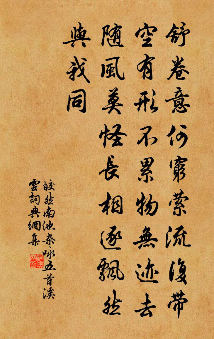 詩詞名句歷史字典書法欣賞書法字典國語詞典說文解字康熙字典古漢語字典標 題 作 者 詩 句 南池雜詠五首溪雲作者:皎然 朝代:唐代南池雜詠五首溪雲原文舒捲意何窮,縈流復帶空。有形不累物,無跡去隨風。莫怪長相逐,飄然與我同。詩詞問答問:南池雜詠五首溪雲的作者是誰?答:皎然問:南池雜詠五首溪雲寫於哪個朝代?答:唐代皎然南池雜詠五首溪雲書法欣賞南池雜詠五首溪雲書法作品注釋全唐詩:卷820-27詩詞推薦吾家舊藏奇石甚富今無復存者獨道石一尚置幾陸游〔宋代〕林慮靈壁俱尤物,散落人間不復還。投老東歸風味在,舂陵小岫伴身閒。謝親戚寄黃雀楊萬里〔宋代〕萬金家書寄中庭,牘背仍題雙掩並。不知千里寄底物,白泥紅印三十瓶。瓷瓶淺染茱萸紫,心知親賓寄鄉味。印泥賀新郎(三用韻寄舊宮怨)何夢桂〔宋代〕更靜鍾初定。卷珠簾、人人獨立,怨懷難忍。欲撥金猊添沉水,病力厭厭不任。任蝶粉、蜂黃消盡。亭北海棠還開北邙行釋法泉〔宋代〕前山後山高峨峨,喪車轔轔日日過。哀歌幽怨滿岩谷,聞者潛悲薤露歌。哀歌一聲千載別,孝子順孫徒泣血。世間秦君亭傅宗教〔宋代〕隱君在何許,遺蹟此山阿。春風閉門處,回首空煙蘿。題延真羅道士玉澗文天祥〔宋代〕雙雙夾方流,知有至妙蘊。山石發清暉,草木得餘澗。泉源皆寶氣,樵牧駭潛蜃。仙翁獨危坐,華池養水性。神澤次韻李修孺留別二首蘇軾〔宋代〕十年流落敢言歸,魚鳥江湖只自知。豈意青天掃雲霧,盡呼黃髮寄安危。風流吾子真前輩,人物他年記一時。我欲與呂望之上東嶺王安石〔宋代〕靖節愛吾廬,猗玗樂吾耳。適野無心諠,吾今亦如此。紛紛舊可厭,俗子今掃軌。使君氣相求,眷顧未雲已。追隨次韻毛君見贈蘇轍〔宋代〕江國騷人不耐秋,夜吟清句曉相投。鋒藏豈願囊中脫,尾斷終非俎上羞。擇地何年真得意,鋪糟是處可同游。南遷寄題惠林李侍郎舊館李德裕〔唐代〕棟宇非吾室,煙山是我鄰。百齡惟待盡,一世樂長貧。半壁懸秋日,空林滿夕塵。只應雙鶴弔,松路更無人。登汝州等慈閣二絕句宋庠〔宋代〕像閣岧嶢出翠陰,有人憑檻看嵩岑。方袍更語閩天舊,且取歸心付佛心。和石昌言學士官舍十題病竹梅堯臣〔宋代〕水邊移得已傷根,枝葉如枯生意少。主人不使荒穢侵,遂長琅玕勝凡草。馬上見賣芍藥戲贈張厚之二絕蘇轍〔宋代〕春來便有南園約,過盡春風約尚賒。綠葉成陰花結子,便須攜客到君家。萬杉寺散珠亭酌觀音泉洪咨夔〔宋代〕蒼杉拱立萬夫長,破衲素封千戶侯。昨夜金仙失瓔珞,寒光滿地不曾收。孝揚成父約見過屢展朝雲鬚晴也趙蕃〔宋代〕雨到叢篁忽暗鳴,譙門應已載傳更。伯淮被冷睡難著,孺子榻空塵欲生。幾戒樵青成痛掃,屢聞黃耳弟虛聲。逢迎偈頌十一首釋了演〔宋代〕誰庵不會說禪,一向外邊之繞。鳴鼓集眾升堂,豈容亂開臭口,而今無計可為,謾把屎腸抖擻。瞎驢趁隊過新羅,潮州禮長老請贊釋法薰〔宋代〕面如死灰,匙挑不上。祖翁活業,盡情破盪。無星秤子拈來,也解袋子分斤定兩。禮長老,少思算。鱷魚幸自徙化哭盧貞國孟郊〔唐代〕一別難與期,存亡易寒燠。下馬入君門,聲悲不成哭。自能富才藝,當冀深榮祿。皇天負我賢,遺恨至兩目。平生病後作陸游〔宋代〕骨相坐一寒,仕宦經百謫。晚入文昌省,又坐煩言嘖。詔晝復收召,付以大典冊。期年甫奏篇,皇恐亟自劾。歸來飯後自嘲陸游〔宋代〕歲熟家彌困,天寒酒闕傾。僅能炊稻飯,敢望糝藜羹。一榻解腰臥,四廊摩腹行。詩人要疏瘦,此日媿膨脝。名句推薦玉梅消瘦,恨東皇命薄。汪元量《傳言玉女·錢塘元夕》 西風亂葉溪橋樹。秋在黃花羞澀處。張榘《青玉案·被檄出郊題陳氏山居》 殘燈明滅枕頭欹,諳盡孤眠滋味。范仲淹《御街行·秋日懷舊》 犯刑若履虎,不畏落爪牙。李白《秦女休行》 茅檐長掃淨無苔,花木成畦手自栽。王安石《書湖陰先生壁》 連天衰草,望斷歸來路。李清照《點絳唇·閨思》 長江一帆遠,落日五湖春。劉長卿《餞別王十一南遊》 花氣襲人知驟暖,鵲聲穿樹喜新晴。陸游《村居書喜》 送君九月交河北,雪裡題詩淚滿衣。岑參《送崔子還京》 國無三年之食者,國非其國也墨子《墨子·05章 七患》
