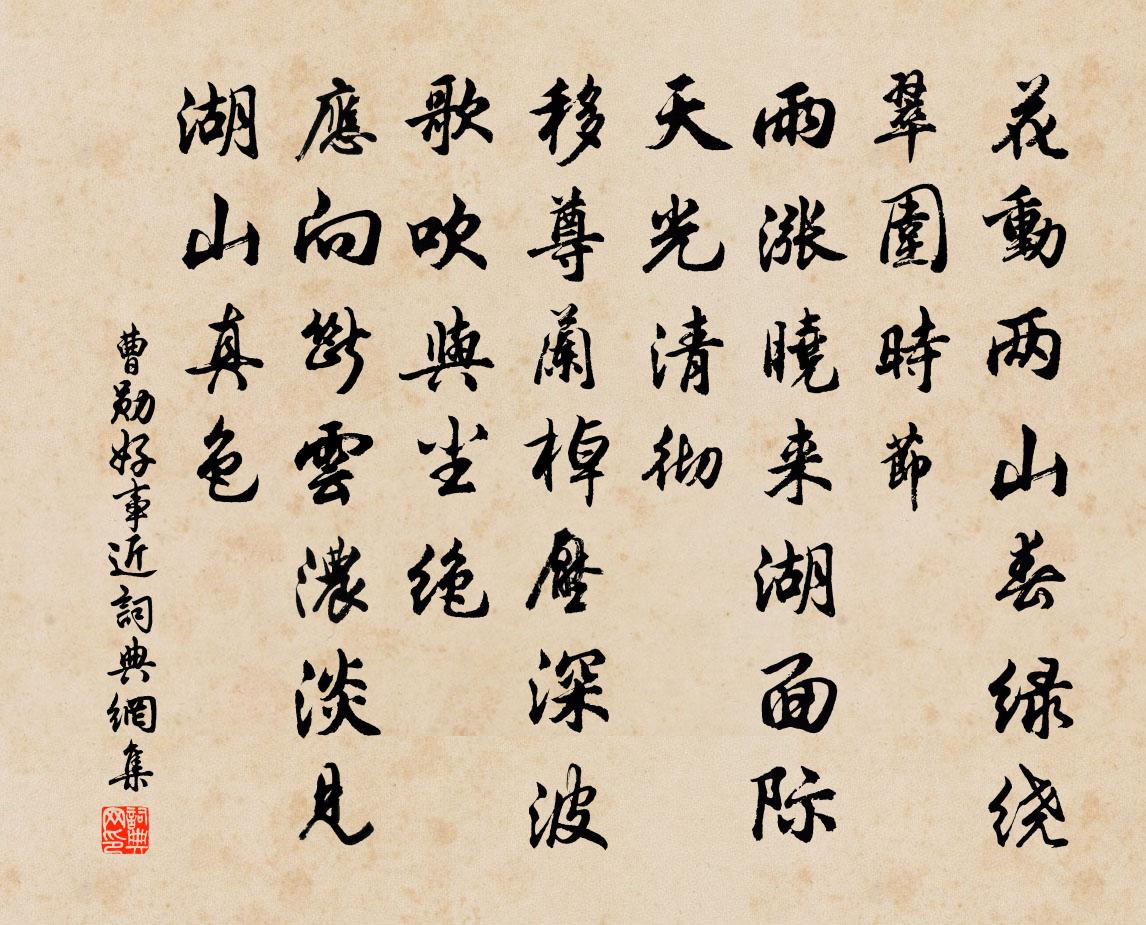 詩詞名句歷史字典書法欣賞書法字典國語詞典說文解字康熙字典古漢語字典標 題 作 者 詩 句 好事近作者:曹勛 朝代:宋代好事近原文花動兩山春,綠繞翠圍時節。雨漲曉來湖面,際天光清徹。移尊蘭棹壓深波,歌吹與塵絕。應向斷雲濃淡,見湖山真色。詩詞問答問:好事近的作者是誰?答:曹勛問:好事近寫於哪個朝代?答:宋代問:好事近是什麼體裁?答:詞曹勛好事近書法欣賞好事近書法作品詩詞推薦霜角 黃山尋霽張可久〔元代〕雲開洞府。按罷瓊妃舞。三十六峰圖畫,張素錦、列冰柱。幾縷。翠煙聚。曉妝眉更嫵。一個山頭不白,人知是,隋王鼓吹曲 郊祀曲謝朓〔南北朝〕六宗禋配岳。五畤奠甘泉。整蹕游九闕。清簫開八埏。鏘鏘玉鑾動。溶溶金障旋。郊宮光已屬。升柴禮既虔。福響十五日游龍華淨明兩院值雨蔡襄〔宋代〕垂楊修竹半藏山,一徑紆迴暮雨間。綠滿野田看渺渺,白飛岩溜自潺潺。空村鮐背行歌去,古寺頭陀乞食還。卻羨偈頌一百零九首釋可湘〔宋代〕前時向者里抽釘拔楔,而今卻要添釘著楔。前時向者里解粘去縛,而今卻要添繩加索。從獵晚歸馬上默成奉呈承旨端明王學士宋庠〔宋代〕天子乘冬校獵回,鉤陳平野轉瑤魁。萬蹄未暮先追日,疊鼓非春已作雷。得攜風毛隨禁仗,犒勤霞液出仙杯。詞臣木蘭花慢 送陳國材都目朱唏顏〔元代〕拂溪藤香潤,緘翠墨,寄深情。憶月滿簫台,春回炎海,驛騎宵征。相思頓成春夢,恰方州、接武敘前盟。愧我弓浣溪沙張孝祥〔宋代〕霜日明宵水蘸空。鳴鞘聲里繡旗紅。澹煙衰草有無中。萬里中原烽火北,一尊濁酒戍樓東。酒闌揮淚向悲風。清曉洪澤放閘四絕句楊萬里〔宋代〕滿閘浮河是斷冰,等人放閘要前行。劣能開得兩三板,爭作摧瓊裂玉聲。偈頌十二首釋如淨〔宋代〕夜半烏雞抱鵠卵,天明生出個老鸛。毛長觜短鷺鶿形,飛起一天星斗亂。一拳拳倒黃鶴樓,一踢踢翻鸚鵡洲。咄,寄遠其六李白〔唐代〕陽台隔楚水。春草生黃河。相思無日夜。浩蕩若流波。流波向海去。欲見終無因。遙將一點淚。遠寄如花人。希年初度老友王希宣扁舟遠訪夙誼甚厚貺以十牟巘五〔宋代〕古人歌既醉,其中有五福。如何憔悴者,忍飲但餐菊。登少陵原,望秦中諸川,太原王至德妙用呂溫〔唐代〕少陵最高處,曠望極秋空。君山噴清源,脈散秦川中。荷鍤自成雨,由來非鬼工。如何盛明代,委棄傷豳風。涇灞點絳唇陳景沂〔宋代〕今古凡花,詞人尚作詞稱慶。紫薇名盛。似得花之聖。為底時人,一曲稀流詠。花端正。花無郎病。病亦歸之命。平泉佳景舒岳祥〔宋代〕清風截斷排檐雨,返景燒成冠嶺霞。定是來朝好春色,海棠須作小桃花。蜀中逢友人李頻〔唐代〕自古有行役,誰人免別家。相歡猶陌上,一醉任天涯。積疊山藏蜀,潺湲水繞巴。他年復何處,共說海棠花。紀艷陳維崧〔清代〕拂曉相逢花弄口。如此天寒,何事清晨走?小院綠熊鋪褥厚,玉梅花下交三九。招入繡屏閒寫久。斜送橫波,郎莫寒食贈遊客張耒〔宋代〕陰陰畫暮映雕欄,一縷微香寶篆殘。寒食園林三月近,落花風雨五更寒。箏調寶柱弦初穩,酒滿金壺飲未乾。明日五相邵雍〔宋代〕北巷通南陌,門連五相家。水分池對岸,牆隔樹交花。玉田八景仙嶺樵歌李堪〔宋代〕金仙洞頭樵子多,負薪出山行且歌。仙家棋局無心看,只恐歸時爛斧柯。自贊慶成長老請釋子益〔宋代〕怡山頂不露,上有通天竅。事事總不知,虛明肯自照。個樣{三若}苴川僧,如何描邈得就。慶成訐露人前,早是名句推薦閒立春塘煙淡淡,靜眠寒葦雨颼颼。鄭谷《鷺鷥》 枕障薰爐隔繡帷,二年終日苦相思,杏花明月始應知。張曙《浣溪沙·枕障薰爐隔繡帷》 黯與山僧別,低頭禮白雲。李白《秋浦歌十七首》 霧冷笙簫,風輕環佩,玉鎖無人掣朱敦儒《念奴嬌·插天翠柳》 今宵酒醒何處?楊柳岸,曉風殘月。柳永《雨霖鈴·寒蟬淒切》 不必於世事件件皆能,惟求與古人心心相印。王永彬《圍爐夜話·第一五三則》 陽月南飛雁,傳聞至此回。宋之問《題大庾嶺北驛》 可憐白骨攢孤冢,盡為將軍覓戰功。張蠙《吊萬人冢》 鈍學累功,不妨精熟顏之推《顏氏家訓·文章篇》 凌波不過橫塘路,但目送、芳塵去。賀鑄《青玉案·凌波不過橫塘路》