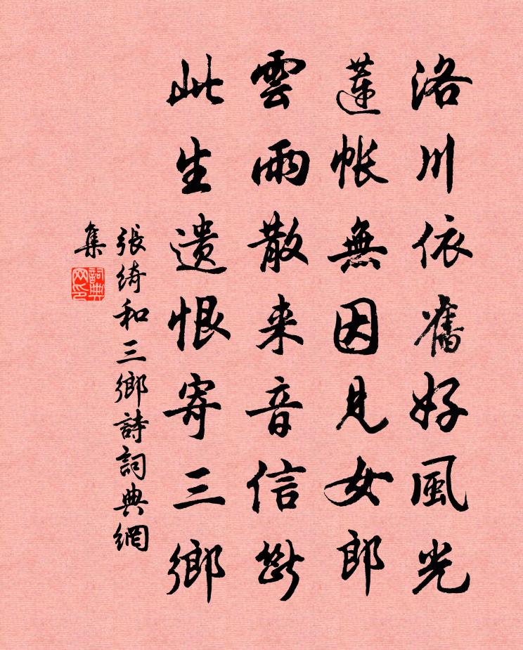 詩詞名句歷史字典書法欣賞書法字典國語詞典說文解字康熙字典古漢語字典標 題 作 者 詩 句 和三鄉詩作者:張綺 朝代:唐代和三鄉詩原文洛川依舊好風光,蓮帳無因見女郎。雲雨散來音信斷,此生遺恨寄三鄉。詩詞問答問:和三鄉詩的作者是誰?答:張綺問:和三鄉詩寫於哪個朝代?答:唐代問:和三鄉詩是什麼體裁?答:七絕張綺和三鄉詩書法欣賞和三鄉詩書法作品注釋全唐詩:卷726-9詩詞推薦頌古十首釋師體〔宋代〕假使百千劫,所作業不忘。因緣會遇時,果報還自受。同馮蓬州當可游中岩分韻得林字史堯弼〔宋代〕羲和轉日轂,北陸鞭窮陰。天地不自持,年老去如駸。卉木浩萎垂,江山動蕭森。變化故不乾,樂哉此幽尋。蓬州送蕭穎士赴東府,得往字鄭愕〔唐代〕斤溪數畝田,素心擬長往。翳君曲得引,使我纓俗網。風塵豈不勞,道義成心賞。春郊桃李月,忍此戒征兩。怨遙夜曹勛〔宋代〕六龍滅景兮疾如馳,結鄰矘蟒兮沉海涯。飛霜烈烈以襲物兮,其容慘栗。陰風凜凜而薄人兮,其聲淒悲。和頌釋重顯〔宋代〕珍瓏岩古寺,冠乎明越境。海眼通洌泉,天心聳危嶺。嘗遊興未闌,遐想神忽凝。彼士真覺雄,相鄰不孤迥。吾愛曾豐惠文編韓元吉〔宋代〕簿領裝懷筆擁塵,經年舌強不論文。跫然步武心還喜,籍甚聲華耳舊聞。曲水賦詩須鮑謝,甘泉第頌憶淵雲。相期題陳德秀畫四季枕屏圖五首潘大臨〔宋代〕好景入詩皆可畫,未知陳子畫中詩。疑公便是褚季野,正爾不言行四時。題從叔沆林園李端〔唐代〕阮宅閒園暮,窗中見樹陰。樵歌依遠草,僧語過長林。鳥哢 * , * 竹里琴。自嫌身未老,已有住山心。詩一首陳堯佐〔宋代〕雨網蛛絲斷,風枝鳥夢搖。詩家零落景,採拾合如樵。田家詞艾性夫〔宋代〕大兒荷鍤去疏麻,小兒提筐來採茶,翁自決水灌秧芽。今年續食不可望,一夜老風搖麥花。挽徐子固吳芾〔宋代〕相逢一笑記臨安,倒指今逾二十年。別後每思論舊事,朝來忽報啟新阡。蒞官凜凜風猶在,居里恂恂譽更傳。遙想句諶祜〔宋代〕看翻後夜月回照,夢憶前生地不同。晨起有感陸游〔宋代〕痛飲可以豪,謝病可以高,計之顧不審,老與世俗鏖。丈夫本自許,四十擁旌旄,上馬不回顧,賊穴窮腥臊。渭橋憶吳興張翥〔元代〕憶泛苕華溪上船,故人為我重留連。半山塔寺藏雲樹,繞郭樓台住水天。白榜載歌明月里,青簾沽酒畫橋邊。計籌上明達皇后冊寶五首真宗〔宋代〕何成熙事,虛徐翠楹。神保聿歸,雲車夙正。鑒我休德,神交惚恍。留祉降祥,千秋是享。壽湯侍郎徐璣〔宋代〕東括神仙儲,三岩福地通。異人多接跡,相種況同風。質有璠璵粹,姿全鼎鼐隆。文章親視草,豐度早乘驄。紫橐出獵李世民〔唐代〕楚王雲夢澤,漢帝長楊宮。豈若因農暇,閱武出轘嵩。三驅陳銳卒,七萃列材雄。寒野霜氛白,平原燒火紅。雕戈賀濟直之值改官陳藻〔宋代〕日者紛紛叔五星,諸儒言命亦相承。大人雙眼如明月,照出毫釐不肯憑。常惺惺室五邁〔宋代〕性命一同源,萬善天所賦。五行水生智,正以虛明故。先生原命宮,水與金夾輔。清質自生明,冰壺澄月露。窮理同賦梅花十二題竹外王銍〔宋代〕枝上淡煙籠白雪,此君高節助清真。要知謝女姿容別,林下孤標迥出塵。名句推薦一寸相思一寸灰。蘇軾《南鄉子·集句》 採蓮南塘秋,蓮花過人頭。佚名《西洲曲》 脅肩諂笑,病於夏畦。孟子《孟子·滕文公章句下·第七節》 寡助之至,親戚畔之;多助之至,天下順之。孟子《孟子·公孫丑章句下·第一節》 王師北定中原日,家祭無忘告乃翁。陸游《示兒》 順天者昌,逆天者亡。毋逆天道,則不失所守。佚名《黃帝四經·十大經·姓爭》 水色淥且明,令人思鏡湖。李白《登單父陶少府半月台》 摘青梅薦酒,甚殘寒,猶怯薴蘿衣。湯恢《八聲甘州·摘青梅薦酒》 近者說,遠者來。孔子弟子《論語·子路篇》 鵲橋波里出,龍車霄外飛。任希古《和長孫秘監七夕》