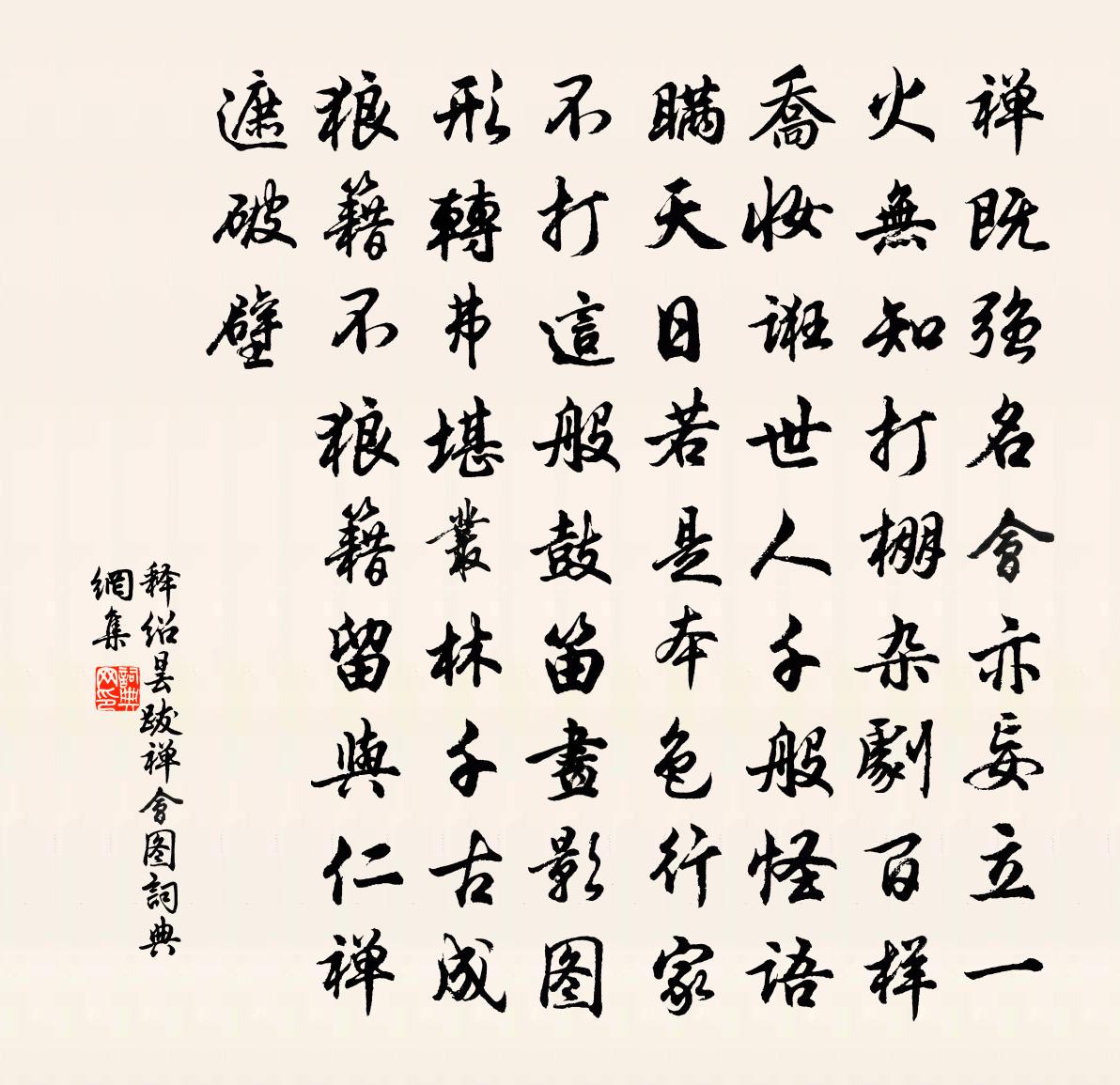 詩詞名句歷史字典書法欣賞書法字典國語詞典說文解字康熙字典古漢語字典標 題 作 者 詩 句 跋禪會圖作者:釋紹曇 朝代:宋代跋禪會圖原文禪既強名,會亦妄立。一火無知,打棚雜劇。百樣喬妝誑世人,千般怪語瞞天日。若是本色行家,不打這般鼓笛。畫影圖形轉弗堪,叢林千古成狼籍。不狼籍,留與仁禪遮破壁。詩詞問答問:跋禪會圖的作者是誰?答:釋紹曇問:跋禪會圖寫於哪個朝代?答:宋代釋紹曇跋禪會圖書法欣賞跋禪會圖書法作品詩詞推薦道中曹松〔唐代〕出門嗟世路,何日朴風歸。是處太行險,應解飛。主人厚薄禮,客子新故衣。所以澆浮態,多令行者違。梧桐樹 原作 ,疑誤牧常晁〔元代〕這丹頭,牢結媾。念頭動處靈丹走。固濟要無漏。綿綿一*三關透。撥轉天輪行火候。金鼎蟾光透。上天竺孫雄飛〔宋代〕行窮湖上徑,迤邐到林巒。地瘦馬蹄澀,水清山骨寒。樓台棲樹沙,鐘磬鬧雲端。自笑利名役,未能來掛冠。晚眺方岳〔宋代〕晴沙漠漠水沄沄,更倚翠微搔白紛。不可以風秋後葉,何傷於月晚來雲。憂時自有夔龍在,投老政須麛鹿群。旋拾探梅陸游〔宋代〕半吐幽香特地奇,正如官柳弄黃時。放翁頗具尋梅眼,可愛南枝愛北枝。失調名佚名〔宋代〕枕冷衾寒,夜長無奈愁何。詠史上光武祭遵陳普〔宋代〕東山紀律久無聞,鉦鼓才鳴玉匣塵。牧野再逢諸葛亮,兩階重見祭將軍。黃河清晁端禮〔宋代〕晴景初升風細細。雲收天淡如洗。望外鳳凰雙闕,蔥蔥佳氣。朝罷香菸滿袖,近臣報、天顏有喜。夜來連得封章,思佳客仇遠〔宋代〕落盡殘紅雨乍收。新篁靜院叫鉤輈。柳絲輕拂闌乾角,怕引閒愁懶上樓。春淡淡,水悠悠。綺窗曾為牡丹留。轉頭吟敘周曇〔唐代〕歷代興亡億萬心,聖人觀古貴知今。古今成敗無多事,月殿花台幸一吟。杏溪十首石潭姚合〔唐代〕曉向潭上行,夕就潭邊宿。清冷無波瀾,潎潎魚相逐。釣翁坐不起,見我往來熟。國清寺泉時有綠蟾蹲崖石西高似孫〔宋代〕崖腰溜清水,素光搖玉宇。其陰透碧海,有石如砥柱。心知老龍都,直入蓬萊府。仙雲盪涼潤,積雪明深乾。陰陽轉聲虞美人(霅上送唐彥猷·高平調)張先〔宋代〕使君欲醉離亭酒。酒醒離愁轉有。紫禁多時虛右。苕霄留難久。一聲歌掩雙羅袖。日落亂山春後。猶有東城煙柳。入藍關趙嘏〔唐代〕微煙已辨秦中樹,遠夢更依江上台。看落晚花還悵望,鯉魚時節入關來。同劉景文游郭氏西園因留宿黃庭堅〔宋代〕人居城市虛華館,秋入園林著晚花。落日臨池見蝌斗,必知清夜有鳴蛙。梁父吟吳泳〔宋代〕梁父吟,維山高高維水深。白石爛兮飯牛曲,滄滄清兮鼓枻音。艾薪豈不賢,反被妻子喑。投筆豈不壯,交友不諒自警孫應時〔宋代〕忿燥肝或裂,懼劇膽能破。吾身幸無苦,及茲無乃過。虛中閱萬物,谷響聊應和。可令蟆蝕月,竟作蟻隨磨。根危挽尤端明四首李曾伯〔宋代〕憶昨趨湘水,公歸問錫山。惜時為俗累,欠往拜師顏。不復親溫厲,疇其念險艱。莫持雞炙去,老淚不勝潸。煉丹井胡融〔宋代〕荒巔有野井,古意豁冥搜。蘚石已摧剝,雲蘿閟清幽。憶昔抱朴翁,煉液棲高丘。朝飲井中泉,暮濯井下流。丹成浣溪沙·十二紅簾窣地深納蘭性德〔清代〕十二紅簾窣地深,才移剗襪又沉吟。晚晴天氣惜輕陰。珠衱佩囊三合字,寶釵攏髻兩分心。定緣何事濕蘭襟。名句推薦斷崖蒼蘚對立久,凍雨為洗前朝悲。黃庭堅《書摩崖碑後》 黎明即起,灑掃庭除,要內外整潔;既昏便息,關鎖門戶,必親自檢點。朱柏廬《朱子家訓·全文》 錦里開芳宴,蘭缸艷早年。盧照鄰《十五夜觀燈》 洞房昨夜停紅燭,待曉堂前拜舅姑。朱慶餘《近試上張籍水部 / 近試上張水部 / 閨意獻張水部》 與善人居,如入蘭芷之室,久而不聞其香,則與之化矣;與惡人居,如入鮑魚之肆,久而不聞其臭,亦與之化矣。劉向《說苑·雜言》 誰憐旅愁荏苒。謾長門夜悄,錦箏彈怨。張炎《解連環·孤雁》 酒盈杯,書滿架,名利不將心掛。李珣《漁歌子·荻花秋》 涉世無一段圓活的機趣,便是個木人,處處有礙。洪應明《菜根譚·概論》 蜃散雲收破樓閣,虹殘水照斷橋粱。白居易《江樓晚眺景物鮮奇吟玩成篇寄水部張員外》 行雲歸楚峽,飛夢到揚州。晁補之《臨江仙·綠暗汀洲三月暮》