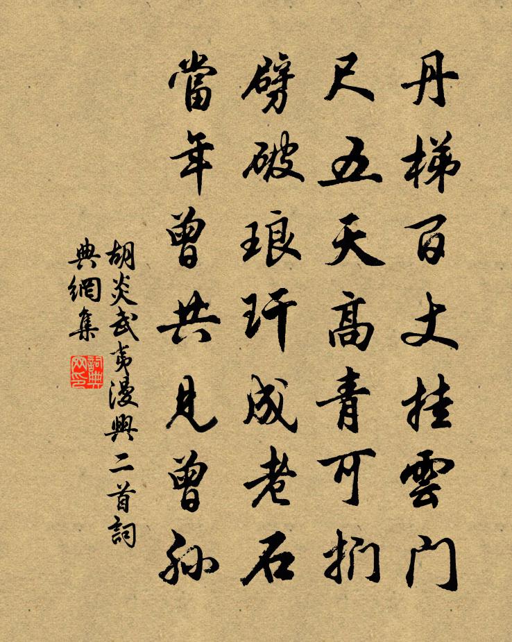 詩詞名句歷史字典書法欣賞書法字典國語詞典說文解字康熙字典古漢語字典標 題 作 者 詩 句 武夷漫興二首作者:胡炎 朝代:宋代武夷漫興二首原文丹梯百丈掛雲門,尺五天高青可捫。劈破琅玕成老石,當年曾共見曾孫。詩詞問答問:武夷漫興二首的作者是誰?答:胡炎問:武夷漫興二首寫於哪個朝代?答:宋代胡炎武夷漫興二首書法欣賞武夷漫興二首書法作品詩詞推薦倅教授判官皆為東湖有賦次韻程公許〔宋代〕交情郁穆兩監州,采藻依蓮總俊游。冰潔霜明相併照,渭清涇濁豈同流。虢堂擬把新題和,錦里還思故事修。荷盪黃鶴洞中仙 俗喝馬卜運算元王哲〔元代〕正被離家遠。衰草寒煙染。水隔孤村兩三家,你不牽上他馬,獨立沙汀岸。叫得船離岸。舉棹波如練。漁叟停船問水調歌頭(送史侍郎)曾協〔宋代〕今日復何日,歡動楚江濱。紫泥來自天上,優詔起元臣。想見傅岩夢斷,記得金甌名在,卻念佩蘭人。永晝通明殿勿執古寄韓潮州劉叉〔唐代〕古人皆執古,不辭凍餓悲。今人亦執古,自取行坐危。老菊凌霜葩,獰松抱雪姿。武王亦至明,寧哀首陽飢。仲尼次韻史少莊竹醉日移竹魏了翁〔宋代〕清如杜叟日卓午,直似姜公詩作丁。冰雪容顏儼相值,霸陵醉尉也須醒。逢鄰女周濆〔唐代〕日高鄰女笑相逢,慢束羅裙半露胸。莫向秋池照綠水,參差羞殺白芙蓉。尋鞏縣南李處士別業岑參〔唐代〕先生近南郭,茅屋臨東川。桑葉隱村戶,蘆花映釣船。有時著書暇,盡日窗中眠。且喜閭井近,灌田同一泉。題表丈三大夫書齋楊巨源〔唐代〕盛府自蓮花,群公是歲華。蘭姿丈人圃,松色大夫家。素卷堆瑤席,朱弦映絳紗。詩題三百首,高韻照春霞。贈歸宗長老道賢楊萬里〔宋代〕地下歸宗天下傳,老夫剩欲到雲邊。王弘送酒催歸去,且省遠公沽酒錢。瑞鶴仙曹邍〔宋代〕爐煙銷篆碧。對院落鞦韆,晝永人寂。濃春透花骨。正長紅小白,暈香塗色。銅駝巷陌。想遊絲、飛絮無力。念繡感懷陸游〔宋代〕卜居鏡湖上,一庵環翠屏。竹林藏谺谽,嶺路蟠青冥。騫騰立奇石,嶄絕瞻危亭。車馬雖掃跡,猿鳥與忘形。我行蝶戀花歐陽修〔宋代〕臘雪初銷梅蕊綻。梅雪相和,喜鵲穿花轉。睡起夕陽迷醉眼。新愁長向東風亂。瘦覺玉肌羅帶緩。紅杏梢頭,二月風蝶令/南歌子朱敦儒〔宋代〕試看何時有,元來總是空。丹砂只在酒杯中。看取乃公雙頰、照人紅。花外莊周蝶,松間禦寇風。古人漫爾說西東爇心香佚名〔宋代〕 * 消亡,脫了根塵。樂虛恬淡崇真。形如野鶴,性似孤雲。到處為家,風為伴,月為鄰。住世無心,異俗超群。途中作白居易〔唐代〕早起上肩舁,一杯平旦醉。晚憩下肩舁,一覺殘春睡。身不經營物,心不思量事。但恐綺與里,只如吾氣味。雪峰寺樂雷發〔宋代〕擬尋岣嶁看蟠螭,且解青鞋濯禹溪。弔古猶疑九枝柏,談禪且問一莖虀。虎抓崖樹供僧爨,猿摸廊碑認客題。應接別氈帳火爐白居易〔唐代〕憶昨臘月天,北風三尺雪。年老不禁寒,夜長安可徹。賴有青氈帳,風前自張設。復此紅火爐,雪中相暖熱。如魚菩薩蠻·銅簧韻脆鏘寒竹李煜〔唐代〕銅簧韻脆鏘寒竹,新聲慢奏移纖玉。眼色暗相鉤,秋波橫欲流。雨雲深繡戶,未便諧衷素。宴罷又成空,魂迷春夢無照釋心月〔宋代〕自憐一點不揩磨,開眼還同合眼過。莫道渾家全淈{左氵右盾},瞞他些子看如何。幽居遣懹陸游〔宋代〕大患元因有此身,正須枵腹對空囷。扶持接客寧嗟老?質貸迎醫未厭貧。碓下罕遺雞啄粒,席間不掃鼠行塵。時時名句推薦名豈文章著,官應老病休。杜甫《旅夜書懷》 此心終合雪,去已莫思量。虛中《送遷客》 花謝花飛花滿天,紅消香斷有誰憐。曹雪芹《紅樓夢·第二十七回》 西風多少恨,吹不散眉彎。納蘭性德《臨江仙·寒柳》 天山三丈雪,豈是遠行時。李白《獨不見》 但願人長久,千里共嬋娟。蘇軾《水調歌頭·丙辰中秋》 那堪疏雨滴黃昏。更特地、憶王孫。歐陽修《少年游·欄乾十二獨憑春》 子治世之能臣,亂世之奸雄也。羅貫中《三國演義·第一回》 又疑瑤台鏡,飛在青雲端。李白《古朗月行》 欲把相思說似誰,淺情人不知。晏幾道《長相思·長相思》