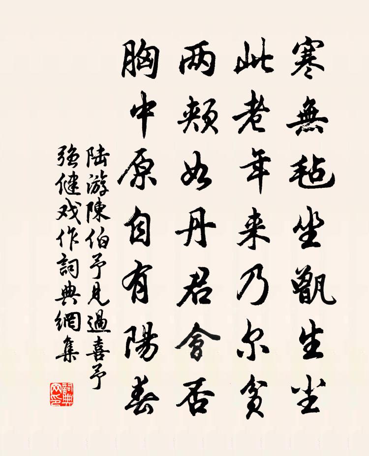 詩詞名句歷史字典書法欣賞書法字典國語詞典說文解字康熙字典古漢語字典標 題 作 者 詩 句 陳伯予見過喜予強健戲作作者:陸游 朝代:宋代陳伯予見過喜予強健戲作原文寒無氈坐甑生塵,此老年來乃爾貧。兩頰如丹君會否,胸中原自有陽春!詩詞問答問:陳伯予見過喜予強健戲作的作者是誰?答:陸游問:陳伯予見過喜予強健戲作寫於哪個朝代?答:宋代問:陸游的名句有哪些?答:陸游名句大全陸游陳伯予見過喜予強健戲作書法欣賞陳伯予見過喜予強健戲作書法作品詩詞推薦吳歌陸游〔宋代〕勝負兩蝸角,榮枯一蟻窠。人情苦翻覆,吾意久蹉跎。困睫憑茶醒,衰顏賴酒酡。坐人能聽否?試為若吳歌。遣懷杜牧〔唐代〕道泰時還泰,時來命不來。何當離城市,高臥博山隈。送遜監淮西酒並示諸任二首蘇轍〔宋代〕淮西留滯昔經年,唯有諸任時往還。炊黍留賓不嫌陋,借書度日免長閒。歸來潩水無水問,夢繞伊家古檜間。二老題惟幹上人房耿湋〔唐代〕繩床茅屋下,獨坐味閒安。苦行無童子,忘機避宰官。是非齊已久,夏臘比應難。更悟真如性,塵心稍自寬。和聖俞農具詩十五首其十一錢鎛王安石〔宋代〕於易見耒耜,於詩聞錢鎛。百工聖人為,此最功不薄。欲收禾黍善,先去蒿萊惡。願同欹器悟,更使臣工作。送浙東王大夫薛能〔唐代〕天爵擅忠貞,皇恩復寵榮。遠源過晉史,甲族本緱笙。亞相兼尤美,周行歷盡清。制除天近曉,衙謝草初生。賓客頌古二十一首釋心月〔宋代〕不壞身正是,正是不壞身。適來曲多少,扭得鼻頭辛。次楊監簿新癖小西湖韻姚勉〔宋代〕搜奇抉異三十載,此湖如玉韞而待。發源遠自錦江來,匯流近與柴門對。山川融結自古有,造物扃藏深意在。瘦筇四和劉克莊〔宋代〕臨淵細味心亨坎,卜築先占地勢坤。說易何妨遇於野,談玄亦入妙之門。賜金莫惜娛賓客,堆笏猶堪遺子孫。不比和鄭拾遺秋日感事一百韻韋莊〔唐代〕禍亂天心厭,流離客思傷。有家拋上國,無罪謫遐方。負笈將辭越,揚帆欲泛湘。避時難駐足,感事易迴腸。雅道變竹枝詞九首之五賀鑄〔宋代〕西戍長回首,高城當夏口。但聞竹枝歌,不見行吟叟。送按察王僉事除行台察院王義山〔宋代〕奪去江西一福星,維揚無地著先聲。數千百里人相賀,二十四橋風便清。只為外台要精采,更煩辣手大支撐。勸君洞仙歌張韞〔宋代〕花泥絮浪,殢春懷如酒。書卷爐熏夢清晝。喚玉京穩攜手鬆喬,飛光里,笑傲白雲林岫。仙人猶狡獪,灑雪吹冰,不出釋文珦〔宋代〕晚暮衰慵劇,因尋此地居。山深常見鹿,溪淺少藏魚。野徑歸煙僻,寒窗映水虛。松枯生蘚遍,梅老著花疎。對月郡樓閒望書懷劉兼〔唐代〕郡城樓閣繞江濱,風物清秋入望頻。銅鼓祭龍雲塞廟,蘆花飄市雪粘人。蓮披淨沼群香散,鷺點寒煙玉片新。歸去荊門上張丞相孟浩然〔唐代〕共理分荊國,招賢愧楚材。召南風更闡,丞相閣還開。覯止欣眉睫,沉淪拔草萊。坐登徐孺榻,頻接李膺杯。始蔚送客歸登淨遠亭二首楊萬里〔宋代〕犯寒送客只勞神,上到危亭眼頓新。雪汁滈人清入髓,莫將杉袖障頭巾。宿鍾陽僧寺李石〔宋代〕遠客來投宿,高人已閉門。白沙分遠水,紅樹帶煙村。僻徑逢僧覓,登山見佛尊。清風惜秋稼,積雨掃雲屯。和御製皇太后恭謝太廟宋祁〔宋代〕柔極深慈冠古先,謝成宗祏奉齋牷。欲知太姒嗣音盛,親見周王作雅年。浣溪沙仇遠〔宋代〕豆蔻枝頭冷蝶飛。荼縻花里老鶯啼。懶留春住聽春歸。北海芳尊誰共醉,東山游屐近應稀。小窗寒草送春時。名句推薦行人悵望蘇台柳,曾與吳王掃落花。姜夔《姑蘇懷古》 百囀無人能解,因風飛過薔薇。黃庭堅《清平樂·春歸何處》 數畝荒園留我住,半瓶濁酒待君溫。蘇軾《正月二十日往岐亭郡人潘古郭三人送余於女王城東禪莊院》 夫淺知之所爭者,末矣。列子及其弟子《列子·說符》 晴雲滿戶團傾蓋,秋水浮階溜決渠。杜甫《柏學士茅屋》 萬里無人收白骨,家家城下招魂葬。張籍《征婦怨》 天能生物,不能辨物也,地能載人,不能治人也;宇中萬物生人之屬,待聖人然後分也。荀子《荀子·禮論》 雨足高田白,披蓑半夜耕。崔道融《田上》 氣相得則和,不相得則病佚名《黃帝內經·素問·五運行大論》 橫笛和愁聽,斜枝倚病看。崔道融《梅花》