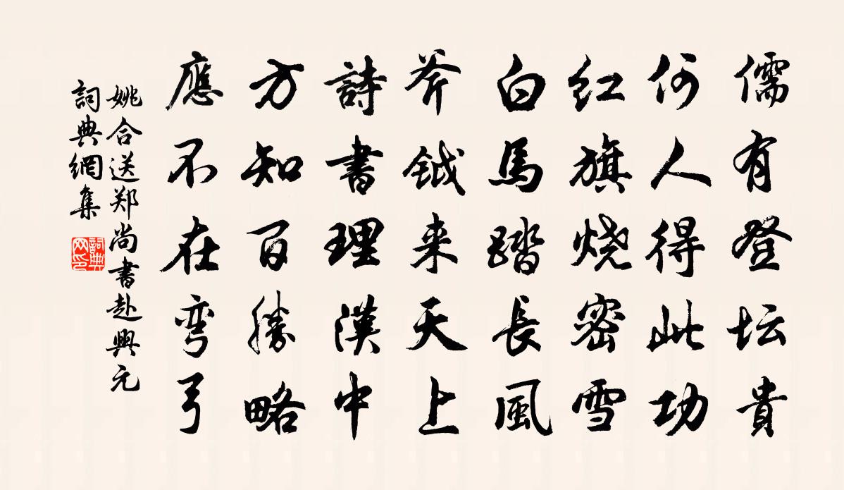 詩詞名句歷史字典書法欣賞書法字典國語詞典說文解字康熙字典古漢語字典標 題 作 者 詩 句 送鄭尚書赴興元作者:姚合 朝代:唐代送鄭尚書赴興元原文儒有登壇貴,何人得此功。紅旗燒密雪,白馬踏長風。斧鉞來天上,詩書理漢中。方知百勝略,應不在彎弓。詩詞問答問:送鄭尚書赴興元的作者是誰?答:姚合問:送鄭尚書赴興元寫於哪個朝代?答:唐代問:送鄭尚書赴興元是什麼體裁?答:五律姚合送鄭尚書赴興元書法欣賞送鄭尚書赴興元書法作品注釋全唐詩:卷496-22詩詞推薦聰大師號無聞送廣福住院釋心月〔宋代〕來日台山大會齋,隔身句子絕安排。如今已落無聞手,雙放雙收機莫偕。秋日郊居陸游〔宋代〕兒童冬學鬧比鄰,據案愚儒卻自珍。授罷村書閉門睡,終年不著面看人。二十四詩品司空圖〔唐代〕行神如空,行氣如虹,巫峽千尋,走雲連風。飲真茹強,蓄素守中,喻彼行健,是謂存雄。天地與立,神化攸同,寥寥宋祁〔宋代〕寥寥私沐地,索索晚秋時。高樹足危響。寒花無媚姿。遠砧投會急,昏雁赴行遲。撫物能無感,年華及始衰。大冶縣見梅晁公溯〔宋代〕客里逢春色,江梅發故枝。正應傷老大,似欲慰棲遲。雪樹真相引,風花莫倒吹。南來愧何遜,吾病不難詩。答微之詠懷見寄白居易〔唐代〕閤中同直前春事,船里相逢昨日情。分袂二年勞夢寐,並床三宿話平生。紫微北畔辭宮闕,滄海西頭對郡城。聚散清心鏡馬鈺〔元代〕養家人,無個省。各炫惺惺,慳貪鄙吝。天來大、割捨驚人,敢不惜性命。這性命。於身緊。一息不來,身為土糞耕樂詩四首袁甫〔宋代〕一犁春雨趁農耕,歌詠康衢了此生。若有可憂方有樂,本無虧處亦無成。晚春酒醒尋夢得白居易〔唐代〕料契約惆悵,花殘酒亦殘。醉心忘老易,醒眼別春難。獨出雖慵懶,相逢定喜歡。還攜小蠻去,試覓老劉看。菩薩蠻舒亶〔宋代〕一回別後一回老。別離易得相逢少。莫問故園花。長安君是家。短亭秋日晚。草色隨人遠。欲醉又還醒。江樓暮角殿帥生日曹勛〔宋代〕薰風拂拂下槐庭,師師膺時奠四溟。代北家聲今嗣業,淮南草木亦知名。陣前鐵馬三軍勇,肘後金丹九轉成。立國酒三品徐渭〔明代〕酒三品酒三品,曰桑絡、襄陵、羊羔,價並不遠,每甕可十小盞,須銀二錢有奇。 小甕五雙盞,千蚨五瓮香。 九日不飲寇準〔宋代〕雲淡長空日欲斜,水邊衰柳噪寒鴉。病來不飲空淒感,獨繞東籬詠菊花。雪中懷廣教真上人梅堯臣〔宋代〕蒼山去不遠,日日起寒雲。堂上看飛雪,水邊思練裙。銅缾生薄凍,桂火壓殘薰。欲往有餘興,林幽路不分。次山房韻何夢桂〔宋代〕西狩事非文殆喪,舂陵書出道寧孤。六經有舌存先聖,千古留心付後儒。杲日麗天隨處見,逝川行地幾時無。齋居贊水月觀音釋法薰〔宋代〕現自在端嚴相,起利他悲憫心。水茫茫,月沉沉。眾生無盡,我顧方興。曉起復昏,泯去來今。了恩典座釋祖欽〔宋代〕十二時中,承誰恩力。俯仰折旋,不須外覓。著衣吃飯,一了便了。開眼天明,是誰不曉。大地沙門隻眼睛,丈六與周剛清溪玉鏡潭宴別(潭在秋浦桃樹陂下余新名此潭)李白〔唐代〕康樂上官去,永嘉游石門。江亭有孤嶼,千載跡猶存。我來游秋浦,三入桃陂源。千峰照積雪,萬壑盡啼猿。興與贈地理錢季實何夢桂〔宋代〕神仙地理無多訣,未用尋龍先看峽。次看峽內有明堂,外峽內堂垣氣結。交結深時垣氣牢,交結淺時垣氣洩。回看再韻奉酬楊公遠〔宋代〕自愧浮生又六旬,苦無情況度殘春。謾吟俚句塵清聽,多謝賡酬字字新。名句推薦有天命者任自為之,不汝禁也。脫脫《宋史·本紀·卷三》 凡治天下,必因人情。韓非及後人《韓非子·八經》 極陽以殺,極陰以生佚名《黃帝四經·經法·四度》 人生自是有情痴,此恨不關風與月。歐陽修《玉樓春·尊前擬把歸期說》 千里稻花應秀色,五更桐葉最佳音。曾幾《蘇秀道中》 相思休問定何如。情知春去後,管得落花無。晁沖之《臨江仙·憶昔西池池上飲》 人煙寒橘柚,秋色老梧桐。李白《秋登宣城謝朓北樓》 不怕慢,只怕站。佚名《增廣賢文·下集》 一年好景君須記,最是橙黃橘綠時。蘇軾《贈劉景文 / 冬景》 謝公最小偏憐女,自嫁黔婁百事乖。元稹《遣悲懷三首·其一》