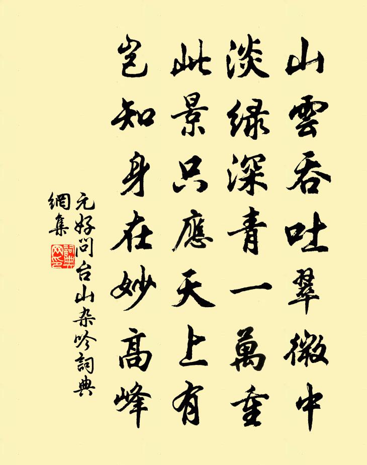 詩詞名句歷史字典書法欣賞書法字典國語詞典說文解字康熙字典古漢語字典標 題 作 者 詩 句 台山雜吟作者:元好問 朝代:金代台山雜吟原文山雲吞吐翠微中,淡綠深青一萬重,此景只應天上有,豈知身在妙高峰。詩詞問答問:台山雜吟的作者是誰?答:元好問問:台山雜吟寫於哪個朝代?答:金代問:台山雜吟是什麼體裁?答:七絕問:元好問的名句有哪些?答:元好問名句大全元好問台山雜吟書法欣賞台山雜吟書法作品詩詞推薦呈趙叔侍郎子直二首趙蕃〔宋代〕憶昨才聞召節趨,江湖日月誦除書。政途去此不容咫,物望在廷誰得如。豈但疲民望甦醒,更知寒士待吹噓。所期三姝媚(送聖與還越)周密〔宋代〕淺寒梅未綻。正潮過西陵,短亭逢雁。秉燭相看,嘆俊游零落,滿襟依黯。露草霜花,愁正在、廢宮蕪苑。明月河游黃薜山三首倪思〔宋代〕歷險捫高無路尋,亂山窮處是禪林。誰知學道須辭世,真要入山如許深。寄天童凝和尚釋重顯〔宋代〕經旬抱疾阻春霖,莎砌重重蘚暈侵。曾約偕游未能得,暮山空鎖碧雲深。偈頌一百五十首釋心月〔宋代〕參禪須是鐵漢,著手心頭便判。直趣無上菩提,一切是非莫管。十詩謝寥計使陳造〔宋代〕我生守荒學,意造無根蔕。時時寫所蘊,致遠終恐泥。小勞斲鼻巧,霜風掃氛翳。一言可終身,萬金寧良惠。春日與裴迪過新昌里訪呂逸人不遇王維〔唐代〕桃源一向絕風塵,柳市南頭訪隱淪。到門不敢題凡鳥,看竹何須問主人。城上青山如屋裡,東家流水入西鄰。閉戶侍御宴僚屬於番江樓以臥病不克與分韻得四字喻良能〔宋代〕使君自是廊廟器,五馬一麾聊爾耳。今年清淨獄既空,去歲豐登米不貴。郡中九賢政可十,京兆三王何足四。乘閒訴衷情(建康)仲殊〔宋代〕鐘山影里看樓台。江煙晚翠開。六朝舊時明月,清夜滿秦淮。寂寞處,兩潮回。黯愁懷。汀花雨細,水樹風閒,又沁園春陳人傑〔宋代〕何如爾。杜子美平生困躓不偶,而嘆老羞卑之言少,愛君憂國之意多,可謂知所愁矣。若於著衣吃飯,一一未能忘與郛郎作骨董羹四首釋慧空〔宋代〕詩人說盡山中佳,一原春色秦人家。松自宮商竹自羽,空明樓觀溪明霞。微言到耳萬世事,香氣熏人百種花。同欄山中謾成柬劉方齋文天祥〔宋代〕東風解凍出行嬉,一哄煙塵隔翠微。自有溪山真樂地,從來富貴是危機。二三輩行惟須醉,多少公卿未得歸。明日題閻立本北齋較書圖呂諤〔宋代〕由余入秦毀詩書,意在兵強黔首愚。弊極煨燼幾無餘,高齊風俗元自殊。豈料乃喜知卷舒,況復是正叢冠裾。公言芹朱翌〔宋代〕幽人本無肉食原,岸草溪毛躬自薦。並堤有芹秀晚春,采掇歸來待朝膳。猿丁謂〔宋代〕行不傷田畝,飢無壞果林。渡雲連臂飲,宿月擁條吟。愈疾如調氣,消憂學定心。沐猴多損物,遠矣莫相侵。初冬章上人院皮日休〔唐代〕寒到無妨睡,僧吟不廢禪。尚關經病鶴,猶濾欲枯泉。靜案貝多紙,閒爐波律煙。清譚兩三句,相向自翛然。道傍館戴復古〔宋代〕道傍誰氏館,□我坐開樽。翁嫗出迎客,兒童為掃門。好花生竹所,流水浸雲根。儻遂卜隣約,為農老此村。酬呂公季王之道〔宋代〕相逢賓戲快逢場,何幸輕投得夜光。半面向懷精舍舊,一行今整漢陽裝。如君俊逸猶沉滯,顧我迂疏合退藏。別乘鼎湖朱藻〔宋代〕孤峰獨立聳巑屼,轍跡苔封暈未乾。秀拔山川清氣上,直衝星斗夜光寒。東南擬作擎天柱,今古稱為壓地盤。上有山陽思歸書寄女兄王令〔宋代〕淮風情舒舒,楚水日夜流。風能駕吾帆,水可載我舟。余歸知幾時,子望懸百憂。念我兄弟寡,商參各殊州。十年名句推薦竹樹帶飛嵐,荇藻俱明麗。劉道著《湘江秋曉》 信宿漁人還泛泛,清秋燕子故飛飛。杜甫《秋興八首》 秋霜切玉劍,落日明珠袍李白《白馬篇》 澹月梨花,借夢來、花邊廊廡。史達祖《解佩令·人行花塢》 上苑風煙好,中橋道路平。白居易《洛橋寒食日作十韻》 黃埃散漫風蕭索,雲棧縈紆登劍閣。白居易《長恨歌》 白梅懶賦賦紅梅,逞艷先迎醉眼開。曹雪芹《詠紅梅花得“梅”字》 可憐赤壁爭雄渡,唯有蓑翁坐釣魚。杜牧《齊安郡晚秋》 佳人亦何念,淒斷陽關曲。蘇軾《送頓起》 君子不以言舉人,不以人廢言。孔子弟子《論語·衛靈公篇》