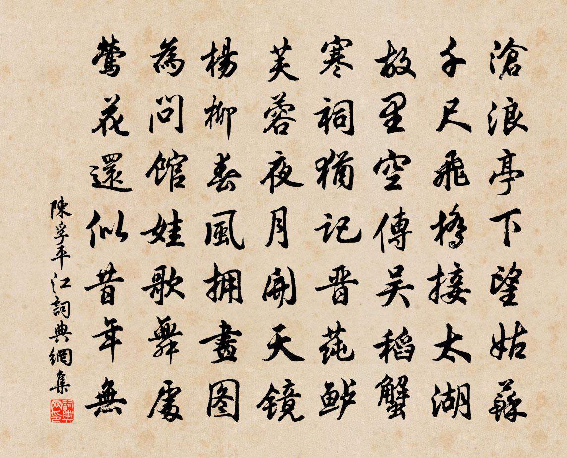 詩詞名句歷史字典書法欣賞書法字典國語詞典說文解字康熙字典古漢語字典標 題 作 者 詩 句 平江作者:陳孚 朝代:元代平江原文滄浪亭下望姑蘇,千尺飛橋接太湖。故里空傳吳稻蟹,寒祠猶記晉蓴鱸。芙蓉夜月開天鏡,楊柳春風擁畫圖。為問館娃歌舞處,鶯花還似昔年無?詩詞問答問:平江的作者是誰?答:陳孚問:平江寫於哪個朝代?答:元代問:平江是什麼體裁?答:七律陳孚平江書法欣賞平江書法作品注釋元詩別裁集詩詞推薦應天長王沂孫〔宋代〕疏簾蝶粉,幽徑燕泥,花間小雨初足。又是禁城寒食,輕舟泛晴淥。尋芳地,來去熟。尚彷佛、大堤南北。望楊柳憶少年晁補之〔宋代〕無窮官柳,無柳畫舸,無根行客。南山尚相送,只高城人隔。罨畫園林溪紺碧,算重來、盡成陳跡。劉郎鬢如此,曳杖歌先秦無名〔先秦〕泰山其頹乎。梁木其壞乎。哲人其萎乎。塔子菊史鑄〔宋代〕金彩煌煌般若花,高蟠層級巧堪夸。更添佛頂周遭種,成此良緣勝聚沙。即事二絕鄭剛中〔宋代〕春風盡日恣顛狂,吹散游雲夜月光。露帶清寒入花骨,暗尋簾幕度幽香。游白兆山寺宋祁〔宋代〕地枕層岑面勢斜,蔽虧原隰在煙霞。璇題衒目三休閣,寶樹沿雲四照花。結社高風思惠遠,忘言真理寄毗邪。銅蓮從軍行張玉娘〔宋代〕三十遴驍勇,從軍事北荒。流星飛玉彈,寶劍落秋霜。書角吹楊柳,金山險馬當。長驅空朔漠,馳捷報明王。【雙調】珍珠馬南 情佚名〔元代〕簫聲喚起瑤台月,獨倚闌乾情慘切。此恨與誰說,又值那黃昏時節。花飛也,一點點似離人淚血。 【步步驕南送馬明府赴江陵錢起〔唐代〕陶令南行心自永,江天極目澄秋景。萬室遙方犬不鳴,雙鳧下處人皆靜。清風高興得湖山,門柳蕭條雙翟閒。黃花古劍歌趙汝鐩〔宋代〕洞庭吞天天無風,月印一鏡星涵空。波心千丈光五色,漁人嘖嘖疑垂虹。睨而視之寂不見,舉網下罩追遺蹤。須臾采菌方岳〔宋代〕溪行近里所,雪菌朵寒籜。久晴危欲枯,抱瓮日商略。可憐書生愚,為口不計腳。龜腸慣飢虛,雞肋忍饞嚼。獨奇雙林寺謁傅大士郎士元〔唐代〕草露經前代,津梁及後人。此方今示滅,何國更分身。月色空知夜,松陰不記春。猶憐下生日,應在一微塵。雁山陳壺中〔宋代〕山川秘靈跡,海近氣常陰。尊者何年在,樵人去路深。雲龍歸絕頂,花鳥傍禪心。十八前朝寺,哀猿空夜吟。臨江仙曹伯啟〔元代〕水出五穀成一派,滔滔日夜東流。倦乘鞍馬卻乘舟。向來危處怯,此去險中愁。伊軋數聲離岸櫓,異鄉身世悠悠。哭宣教郎趙壘之張孝伯〔宋代〕長江天險失,鐵騎逼金陵。拒敵無留守,捐軀有縣丞。戈揮天日皎,血灑陣雲騰。蔣尉英靈在,千秋配食能。送張升之四首項安世〔宋代〕升之升之子其歸,白雲鴻雁天邊飛。我嗟不能從子歸,煩子為我尋松溪。松溪頭,萬株松樹平安不。紫薇花劉克莊〔宋代〕風標雅合對詞臣,映硯窺窗伴演綸。忽發一枝深谷里,似知茅屋有詩人。送人李鹹用〔唐代〕少皞開宮行帝業,無刃金風剪紅葉。雁別邊沙入暖雲,蛩辭敗草鳴香閣。有客為儒二十霜,酣歌郢雪時飄揚。不甘郴口又贈二首韓愈〔唐代〕山作劍攢江寫鏡,扁舟斗轉疾于飛。回頭笑向張公子,終日思歸此日歸。雪颭霜翻看不分,雷驚電激語難聞。沿涯詠塵駱賓王〔唐代〕凌波起羅襪,含風染素衣。別有知音調,聞歌應自飛。名句推薦用舍由時,行藏在我,袖手何妨閒處看。蘇軾《沁園春·孤館燈青》 機在於應事;戰在於治氣尉繚《尉繚子·十二陵》 尚憶先朝多樂事,孝皇曾為兩宮開。王守仁《元夕二首》 日落沙明天倒開,波搖石動水縈迴李白《東魯門泛舟二首》 君子戰雖有陳,而勇為本焉。墨子《墨子·02章 修身》 相思難表,夢魂無據,惟有歸來是。歐陽修《青玉案·一年春事都來幾》 禍與福相貫,生與亡為鄰劉向《戰國策·楚四·或謂楚王》 鳳皇舟上楚女,妙舞,雷喧波上鼓孫光憲《河傳·柳拖金縷》 萬里想龍沙,泣孤臣吳越張元乾《石州慢·己酉秋吳興舟中作》 風含翠篠娟娟淨,雨裛紅蕖冉冉香。杜甫《狂夫》