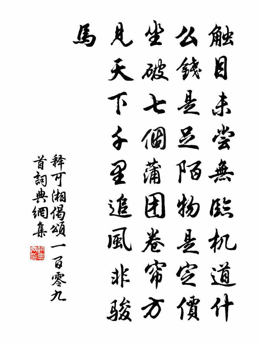 詩詞名句歷史字典書法欣賞書法字典國語詞典說文解字康熙字典古漢語字典標 題 作 者 詩 句 偈頌一百零九首作者:釋可湘 朝代:宋代偈頌一百零九首原文觸目未嘗無,臨機道什麼。錢是足陌,物是定價。坐破七個蒲1~1團,捲簾方見天下。千里追風非駿馬。詩詞問答問:偈頌一百零九首的作者是誰?答:釋可湘問:偈頌一百零九首寫於哪個朝代?答:宋代釋可湘偈頌一百零九首書法欣賞偈頌一百零九首書法作品詩詞推薦點絳唇 春雨後小桃王惲〔元代〕端正樓空,一枝春色誰偷得。夜來訊息。暮雨胭脂濕。倚竹佳人,翠袖嬌無力。須相覓。一尊休惜。轉首春狼藉。和韓羲仲主簿古岩韻李呂〔宋代〕君不經濟見版築當經濟年胥靡徒,貌象忽與帝夢符。臥龍抱膝吟梁哺,霸主不憚三顧廬。又不見形模苦遭婦女笑,【雙調】落梅風_天寶補遺姮張可久〔元代〕天寶補遺姮娥面,天寶年,鬧漁陽鼓聲一片。馬嵬坡襪兒得了看錢,太真妃死而無怨。西湖湖光靜,山影孤,載斜寄湯伯紀秘書劉克莊〔宋代〕挽留天語極諄諄,願為明時遠牧民。倏去居然令國削,至清渾不怕州貧。斷無苞匪聊崇儉,才用蒲鞭亦害仁。莫比春風辭寄武威石秘校釋重顯〔宋代〕春風何蕭蕭,和雨復兼雪。坼花功未深,偃草勢曾烈。毗城癡愛老,怯寒對清拙。衰岩影響士,難御同孤劣。鰲峰題蓋竹廟六絕陳淳〔宋代〕夢生於想本來非,一自魂交百感隨。漠漠茫茫無定準,若何據此卜前達。寄鄭仁規司空圖〔唐代〕清才鄭小戎,標的貴游中。萬里雲無侶,三山鶴不籠。香和丹地暖,晚著彩衣風。榮路期經濟,唯應在至公。夜思陸游〔宋代〕蒼顏華鬢久低摧,嘆息何堪歲月催!殘暑已隨團扇去,新涼還傍短檠來。月痕澹澹侵苔砌,雲葉蕭蕭覆水台。簿領游天平山王疏〔宋代〕勝景奇蹤爛漫遊,歸鞍欲上重回頭。山禽於我情何厚,逐馬聲聲似見留。四月三十日慈孝寺山亭席上次韻經父舍人送子范祖禹〔宋代〕去年使河東,飲餞天始秋。今年使河北,復作蕭寺游。愧我燕居息,送公頻按州。雍容鵷鷺列,環佩鳴琅球。豈知次韻宋尚書山居十五詠見溪亭方岳〔宋代〕碧壺時與故人提,山帶僧鍾日去西。深不知寒雙鷺浴,雪灘煙重碎玻璃。題江貫道山水十絕劉克莊〔宋代〕太武求溲處,支祁著鏁邊。淮風晨裂面,淮浪夜驚船。寄蜀中薛濤校書王建〔唐代〕萬里橋邊女校書,枇杷花里閉門居。掃眉才子於今少,管領春風總不如。金陵野外廢寺游九言〔宋代〕寒花窈裊蔓頹牆,古寺蒼苔晝掩房。犬吠屋頭山杳杳,蟲鳴階隙草荒荒。池塘淡日蒹葭冷,籬落西風橘柚黃。六代和宇文公南塗中見寄司馬光〔宋代〕驄馬烏紗游洛塵,未能全得自由身。深慚折首巒微祿,不向青山為散人。斥鷃卑飛聊到適,冥鴻高舉閃難親。蜀都新秋喜涼白居易〔唐代〕過得炎蒸月,尤宜老病身。衣裳朝不潤,枕簟夜相親。樓月纖纖早,波風裊裊新。光陰與時節,先感是詩人。紅繡鞋張可久〔元代〕綠樹當門酒肆,紅妝映水鬟兒。眼底殷勤座間詩。塵埃三五字,楊柳萬千絲,記年時曾到此。山居雜詩九十首曹勛〔宋代〕山色侵衣冷,異氣作心賞。嶺月聞鳳笙,松風吹鶴氅。碧池縐澄綠,群山發清響。以此助蕭閒,欣然同擊壤。宣州開元寺贈惟真上人杜牧〔唐代〕曾與徑山為小師,千年僧行眾人知。夜深月色當禪處,齋後鐘聲到講時。經雨綠苔侵古畫,過秋紅葉落新詩。勸君清風台司馬光〔宋代〕太守金閨客,天朝應對才。非因板輿戀,寧駕使車來。水鑒鍬毫盡,霜鋒錯節開。清風遍千里,不獨此高台。名句推薦煙開蘭葉香風暖,岸夾桃花錦浪生。李白《鸚鵡洲》 昔在零陵厭,神器若無依。何遜《行經孫氏陵》 笑別廬山遠,何煩過虎溪。李白《別東林寺僧》 上不臣天子,下不事諸侯;慎靜而尚寬,強毅以與人,博學以知服;近文章砥厲廉隅;雖分國如錙銖,不臣不仕。戴聖《禮記·儒行》 黃雞白酒,君去村社一番秋。辛棄疾《水調歌頭·送楊民瞻》 連天衰草,望斷歸來路。李清照《點絳唇·閨思》 雪裡溫柔,水邊明秀,不借春工力。辛棄疾《念奴嬌·梅》 法之善惡,莫以文也,乃其行焉;刑之本哉,非罰罪也,乃明罪焉。來俊臣《羅織經·問罪卷第十》 有功於前,有敗於後,不為損刑。有善於前,有過於後,不為虧法。商鞅《商君書·賞刑》 流光容易把人拋,紅了櫻桃,綠了芭蕉。蔣捷《一剪梅·舟過吳江》