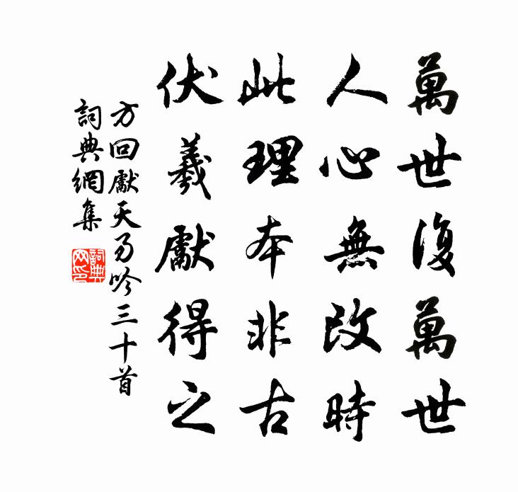 詩詞名句歷史字典書法欣賞書法字典國語詞典說文解字康熙字典古漢語字典標 題 作 者 詩 句 先天易吟三十首作者:方回 朝代:宋代先天易吟三十首原文萬世復萬世,人心無改時。此理本非古,伏羲先得之。詩詞問答問:先天易吟三十首的作者是誰?答:方回問:先天易吟三十首寫於哪個朝代?答:宋代方回先天易吟三十首書法欣賞先天易吟三十首書法作品詩詞推薦頌古五十三首釋文禮〔宋代〕扇子分明都破了,鹽官卻又索犀牛。須知侍者難開口,無可還他即便休。甲申元日王夢應〔宋代〕上日仍漂寄,尊前又客非。鄉心眠聽雨,病骨晚添衣。街鼓春將動,簾燈寒未歸。梅花經一雪,幾片不曾飛。袷享八首真宗〔宋代〕合祭大事,因時發天。翼翼孝思,三獻禮虔。神兮樂康,飈騷言旋。永福後人,於千萬年。沁園春(月夜自和)李曾伯〔宋代〕嗟矍鑠翁,對嬋娟月,懷汗漫遊。悵江湖幸有,季鷹鱸膾,田園忍負,晏子弧裘。丹桂開時,青苹渺處,家在三吳月下作陸游〔宋代〕畏暑不巾襪,步月榰短筇,瘦身發鬅鬙,顧影如孤松。徑幽螢闔開,池漲魚噞喁。飛泉穿北垣,珠玉相撞舂。東湖蠟梅二首張鎡〔宋代〕家世凌風卻月旁,別來衣變鬱金光。神仙定遇容成子,教服三黃遍體香。望洞庭劉禹錫〔唐代〕湖光秋月兩相和,潭面無風鏡未磨。遙望洞庭山水翠,白銀盤裡一青螺。柬張簿二首劉宰〔宋代〕簿書閱過幾牛腰,一縷清香午未消。梔室醉吟誰是伴,鐵城折簡可頻招。登楚州城楊萬里〔宋代〕望中白處日爭明,個是淮河凍作冰。此去中原三里許,一條玉帶界天橫。張伯修令君賦詩同韻稱慶程公許〔宋代〕玉節何如素節高,歸來喜氣溢東皋。存耕元自有餘地,嘉植何曾生不毛。採石勛名須世濟,陵陽今昔幾人豪。含飴滿庭芳(五侄將赴當塗,自金壇來別)葛立方〔宋代〕栗里田園,烏衣門巷,別來幾換星霜。華陽仙窟,翠桁彩衣香。夢墮當塗風月,披絳帳、欲指鱣堂。浮鷗外,來寧郊廟歌辭。太清宮樂章。登歌佚名〔唐代〕嚴禋展事,理潔烝嘗。皇矣聖祖,德惟馨香。盛薦既撤,工歌載揚。大來之慶,降福穰穰。柳長句杜牧〔唐代〕日落水流西復東,春光不盡柳何窮。巫娥廟裡低含雨,宋玉宅前斜帶風。莫將榆莢共爭翠,深感杏花相映紅。灞上高宗郊前朝獻景靈宮二十一首真宗〔宋代〕涓選休辰,有事嘉薦。琅琅瓊佩,陟降嚴殿。其陟伊何,幣玉斯奠。周旋中禮,千億儲義。挽林進士劉克莊〔宋代〕一門皆擢第,君獨老儒冠。試卷年年納,經書日日看。文為前輩賞,命合主司難。遙想泉台恨,銘旌未寫官。郁山主贊釋智遇〔宋代〕日暖跨驢出,溪橋款步行。因思遭攧處,寸草不曾生。採桑子馮延巳〔唐代〕小庭雨過春將盡,片片段預告飛。獨折殘枝,無語憑闌只自知。玉堂香暖珠簾卷,雙燕來歸。君約佳期,肯信韶華得幾寄靈澈上人張祜〔唐代〕老僧何處寺,秋夢繞江濱。獨樹月中鶴,孤舟雲外人。榮華長指幻,衰病久觀身。應笑無成者,滄洲垂一輪。偈頌一百四十一首釋師範〔宋代〕去年梅,今歲柳。顏色馨香,依舊依舊。晚秋集晏太尉西園宋祁〔宋代〕邂逅翹材客,乘秋共涉園。淺葩歡所媚,寒日醉中暄。目遠鴻堪送,林深鵲自翻。長年無所嗜,惟有不空罇。名句推薦女蘿發馨香,菟絲斷人腸。李白《古意》 無端聽畫角,枕畔紅冰薄。納蘭性德《菩薩蠻·朔風吹散三更雪》 開軒面場圃,把酒話桑麻。孟浩然《過故人莊》 垂死病中驚坐起,暗風吹雨入寒窗元稹《聞樂天授江州司馬》 秋容淺淡映重門,七節攢成雪滿盆。曹雪芹《詠白海棠》 浩氣清英,仙材卓犖,下土難分別丘處機《無俗念·靈虛宮梨花詞》 赤日炎炎似火燒,野田禾稻半枯焦。施耐庵《水滸傳·第十六回》 把酒祝東風,且莫恁、匆匆去。王安石《傷春怨·雨打江南樹》 寒波淡淡起,白鳥悠悠下。元好問《潁亭留別》 知不知,尚矣;不知知,病也。聖人不病,以其病病。夫唯病病,是以不病。老子《老子·德經·第七十一章》