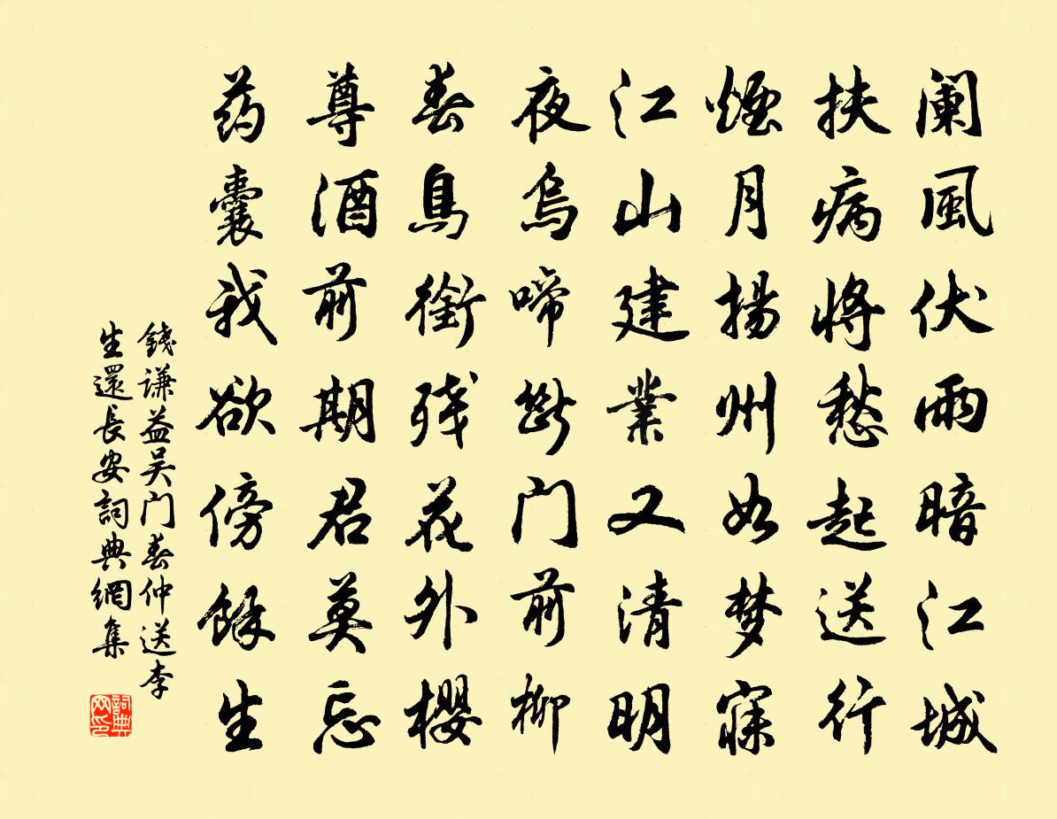 詩詞名句歷史字典書法欣賞書法字典國語詞典說文解字康熙字典古漢語字典標 題 作 者 詩 句 吳門春仲送李生還長安作者:錢謙益 朝代:清代吳門春仲送李生還長安原文闌風伏雨暗江城,扶病將愁起送行。煙月揚州如夢寐,江山建業又清明。夜烏啼斷門前柳,春鳥銜殘花外櫻。尊酒前期君莫忘,藥囊我欲傍餘生。詩詞問答問:吳門春仲送李生還長安的作者是誰?答:錢謙益問:吳門春仲送李生還長安寫於哪個朝代?答:清代問:吳門春仲送李生還長安是什麼體裁?答:七律錢謙益吳門春仲送李生還長安書法欣賞吳門春仲送李生還長安書法作品詩詞推薦戊子除夕追和陳簡齋除夜一首喻良能〔宋代〕世事年來已飽更,百年今夕兩分平。窗間蠟炬偎人暖,瓶里梅花照眼明。瓦屋三間聊足喜,鬢霜千丈總堪驚。明朝冬夜李仲玉寓所張埴〔宋代〕門關晡半掩,鳥雀遠相呼。星宿生圭竇,春風在石爐。不勝親友念,有恨歲年徂。坐久四鄰靜,寒燈勢頗孤。後天易吟三十首方回〔宋代〕學者欲學易,當觀羑里時。如何是敬字,恐懼畏憂危。續小娘歌十首(選二)元好問〔金代〕其 一山無洞穴水無船,單騎驅人動數千;直使今年留得在,更教何處過明年。其 二雁雁相送過河來,人歌人哭偈頌二十九首釋雲〔宋代〕秋江清淺時,白鷺和煙島。良哉觀世音,全身入荒草。山中敘志王績〔唐代〕物外知何事,山中無所有。風鳴靜夜琴,月照芳春酒。直置百年內,誰論千載後。張奉娉賢妻,老萊藉嘉偶。孟光頌古九首釋了演〔宋代〕二祖無端向少林,庭前立雪到腰深。直饒覓得心無有,未免全身被陸沉。送友人歸宣州張喬〔唐代〕失計復離愁,君歸我獨游。亂花藏道發,春水繞鄉流。暝火叢橋市,晴山疊郡樓。無為謝公戀,吟過曉蟬秋。頌古四十四首釋師範〔宋代〕台山路上個婆婆,平地無風起丈波。下卻斗門通底閘,更無一滴到黃河。菩薩蠻趙彥端〔宋代〕雨聲不斷垂檐竹。清歌喚起清眠熟。洞戶有餘花。同傾細細霞。酒行如過雨。雨盡風吹去。吹去復盈杯。一春能幾清平樂 以茗芽棕扇壽長樂尉弟,四月三日程文海〔元代〕潮來潮往。百里遙相望。喜見卯君初度揆,好寄海南拄杖。蕭然四壁坡翁。要求黃木,無從。受用一般苦味,奉揚陝州醉贈裴四同年杜牧〔唐代〕淒風洛下同羈思,遲日棠陰得醉歌。自笑與君三歲別,頭銜依舊鬢絲多。長安遣懷林寬〔唐代〕醉下高樓醒復登,任從浮薄笑才能。青龍寺里三門上,立為南山不為僧。次韻和張次應龍圖松皮冠子晁說之〔宋代〕儒冠何事貴松皮,一歲寒來特自奇。發盡著霜相稱得,歌酬白雪即非宜。去草王令〔宋代〕毿毿出土初如直,嫋嫋隨風競自斜。漫借人鋤勞剆拔,只消夜雨又萌芽。良田力盡農夫嘆,直道春荒志士嗟。滿目送吳七游蜀駱賓王〔唐代〕日觀分齊壤,星橋接蜀門。桃花嘶別路,竹葉瀉離樽。夏老蘭猶茂,秋深柳尚繁。霧銷山望迥,風高野聽喧。勞歌和范君武出郊李復〔宋代〕九月天高客喜晴,籃輿因興度溪行。身逢樂歲留漳浦,心逐秋風入渭京。日暖登聲多稼熟,桑陰具餉野盤盈。豐年游驪山二首張俞〔宋代〕金玉樓台插碧空,笙歌遞響入天風。當時國色並春色,盡在君五顧盼中。詠史詩會稽山胡曾〔唐代〕越王兵敗已山棲,豈望全生出會稽。何事夫差無遠慮,更開羅網放鯨鯢。得合門報以予班學士詔復賜衣帶因懷初錫倏閱岳珂〔宋代〕老去茆檐只負暄,重煩冠緩到柴門。紆金何有功名望,束帶豈堪賓客言。璀璨章身同賜馬,差池接翼愧廷鵷。折腰名句推薦一上高城萬里愁,蒹葭楊柳似汀洲。許渾《鹹陽城東樓 / 鹹陽城西樓晚眺 / 西門》 蕃漢斷訊息,死生長別離。張籍《沒蕃故人》 贈人以言,重於金石珠玉;觀人以言,美於黼黻、文章;聽人以言,樂於鐘鼓琴瑟。荀子《荀子·非相》 男兒少為客,不辨是他鄉。李流芳《黃河夜泊》 寄言儔侶,莫負廣寒沈醉。文徵明《念奴嬌·中秋對月》 俯瞰黃河小,高懸白雪清。胡秉正《詠賀蘭山》 酒醒人靜奈愁濃。殘燈孤枕夢,輕浪五更風。徐昌圖《臨江仙·飲散離亭西去》 爭奈愁來,一日卻為長賀鑄《行路難·縛虎手》 草長鶯飛二月天,拂堤楊柳醉春煙。高鼎《村居》 霸圖今已矣,驅馬復歸來。陳子昂《燕昭王》