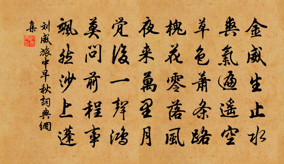 詩詞名句歷史字典書法欣賞書法字典國語詞典說文解字康熙字典古漢語字典標 題 作 者 詩 句 旅中早秋作者:劉威 朝代:唐代旅中早秋原文金威生止水,爽氣遍遙空。草色蕭條路,槐花零落風。夜來萬里月,覺後一聲鴻。莫問前程事,颯然沙上蓬。詩詞問答問:旅中早秋的作者是誰?答:劉威問:旅中早秋寫於哪個朝代?答:唐代問:旅中早秋是什麼體裁?答:五律劉威旅中早秋書法欣賞旅中早秋書法作品注釋全唐詩:卷562-6詩詞推薦至啟休沐之中靜專一室病不復飲無心慰懷性且李至〔宋代〕朱門多好景,況復九秋中。積雨涼生簟,凝霜夜著桐。槐陰堆敗葉,菊蕊被幽叢。閒對籃輿客,翛然此興同。家居自戒陸游〔宋代〕平居少愧怍,動以直自遂;雖墮虎兕群,我已無死地。神仙果可學,吾輩恐差易。勿言聞道晚,努力補黥劓。謝寇員外準見示詩卷潘閬〔宋代〕一軸新詩意轉深,幾回看了又重尋。最憐積水浮秋漢,閒望滄溟盡日吟。吹笙歌秦韜玉〔唐代〕信陵名重憐高才,見我長吹青眼開。便出燕姬再傾醑,此時花下逢仙侶。彎彎狂月壓秋波,兩條黃金玄黃霧。逸艷桂枝香 楊潤之得家書吳景奎〔元代〕霜凝翠閣。漫獨翦燈花,斜照羅幕。點檢芳心舊事,幾多成錯。清愁正爾無聊賴,聽梅花、數聲殘角。小窗風細,再和李處權〔宋代〕鬢絲殊覺老,淚血更傷春。閱世元如夢,除天總是塵。有心躭傳癖,無意媚錢神。坐怪三衢守,書來不到閩。游雲靈觀王灼〔宋代〕茲山雖特起,遠窺殊未豪。三休出雲際,始知盤踞高。大江分一線。眾峰環千遭。溪谷粗可辨,綠樹皆蓬蒿。羽衣送安惇秀才失解西歸蘇軾〔宋代〕舊書不厭百回讀,熟讀深思子自知。他年名宦恐不免,今日棲遲那可追。我昔家居斷還往,著書不復窺園葵。朅來應詔內苑牡丹三首雙頭宋祁〔宋代〕化工憑協氣,花品效尤祥。旖旎雙苞艷,氤氳一種香。參差迎夕露,左右傃朝陽。有意同緗幹,無言並絳房。萬靈自蜀江至洞庭湖口,有感而作白居易〔唐代〕江從西南來,浩浩無旦夕。長波逐若瀉,連山鑿如劈。千年不壅潰,萬姓無墊溺。不爾民為魚,大哉禹之績。導岷朝中措(山樊)趙師俠〔宋代〕亂山春過雪成堆。七里遞香回。蕊簇玲瓏金粟,花裝碎屑玫瑰。蘭衰梅謝,桃粗李俗,誰與追隨。清絕殿春仙侶,鸜鵒俞灝〔宋代〕守黑元知分,能言亦任真。人知不可食,我得自全身。牛背煙村畫,烏群野水春。從教鸚鵡貴,籠終媚宮嬪。鐵壁釋心月〔宋代〕天地為爐烹不破,不通風處卻通風。自從透得歸來後,方見一重還一重。驚蟄後雪作未已陰之湖莊曹彥約〔宋代〕甲拆多應滿藥欄,跨縲心已拂輕鞍。正疑陰因仍飛雪,豈有春中卻沍寒。啟蟄候蟲猶自閉,向陽梅子自能酸。誤成自安仁至豫章途中雜興十九首趙蕃〔宋代〕小立溪頭喚野航,雨余林木倍森涼。少焉步到臨流寺,鸛鶴飛鳴滿夕陽。句李邴〔宋代〕東湖同住水雲家。哭薛榆漵同舍林景熙〔宋代〕桂花月亦灰,鵬枯海為陸。自我哭斯文,老淚幾盈掬。故國忽春夢,故人復霜木。矯矯榆漵君,白首尚儒服。解後奉和魯望漁具十五詠。漁梁皮日休〔唐代〕波際插翠筠,離離似清籞。游鱗到溪口,入此無逃所。斜臨楊柳津,靜下鸕鶿侶。編此欲何之,終焉富春渚。八詠樓於石〔宋代〕八詠詩傳千古名,蹇驢何在井空澄。淒涼樓外雙溪月,曾照齊梁幾廢興。和子玉病起游書齋黃庶〔宋代〕蕭齋久不住,筋力試筇初。窗戶蝸涎鎖,塵埃鼠跡書。病魔雖已去,詩癖竟難除。苔地欣重掃,徘徊意有餘。名句推薦臨行挽衫袖,更嘗折殘菊。蘇軾《送頓起》 春遊之盛,西湖未能過也。姜夔《琵琶仙·雙槳來時》 秋水時至,百川灌河。莊子及門徒《秋水(節選)》 祿不患其不來,患祿來,而不能無愧其祿。王永彬《圍爐夜話·第四四則》 十四萬人齊解甲,更無一個是男兒!花蕊夫人《述國亡詩》 客里看春多草草,總被詩愁分了張炎《清平樂·采芳人杳》 征人去日殷勤囑,歸雁來時數附書。王維《伊州歌》 世情薄,人情惡,雨送黃昏花易落。唐婉《釵頭鳳·世情薄》 一身報國有萬死,雙鬢向人無再青。陸游《夜泊水村》 休別有魚處,莫戀淺灘頭。佚名《增廣賢文·上集》