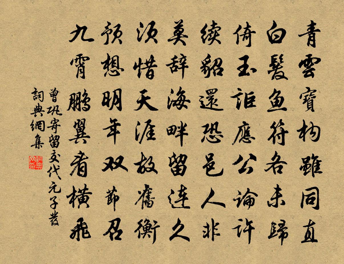 詩詞名句歷史字典書法欣賞書法字典國語詞典說文解字康熙字典古漢語字典標 題 作 者 詩 句 寄留交代元子發作者:曾鞏 朝代:宋代寄留交代元子發原文青雲寶構雖同直,白髮魚符各未歸。倚玉詎應公論許,續貂還恐邑人非。莫辭海畔留連久,須惜天涯故舊衡。預想明年雙節召,九霄鵬翼看橫飛。詩詞問答問:寄留交代元子發的作者是誰?答:曾鞏問:寄留交代元子發寫於哪個朝代?答:宋代曾鞏寄留交代元子發書法欣賞寄留交代元子發書法作品詩詞推薦漁家傲(九月將盡,菊花始有開者)李綱〔宋代〕木落霜清秋色霽。菊苞漸吐金英碎。佳節不隨東去水。誰得會。黃花開日重陽至。三徑舊栽煙水外。故園凝望空流高士詠許先生吳筠〔唐代〕大名賢所尚,寶位聖所珍。皎皎許仲武,遺之若纖塵。棄瓢箕山下,洗耳潁水濱。物外兩寂寞,獨與玄冥均。看花回(張守生日)趙彥端〔宋代〕注目。正江湖浩蕩,煙雲離屬。美人衣蘭佩玉。澹秋水凝神,陽春翻曲。烹鮮坐嘯,清淨五千言自足。橫劍氣、南減字木蘭花(荔枝二首)李綱〔宋代〕華清賜浴。寶甃溫泉澆膩玉。笑靨開時。一騎紅塵獻荔枝。明珠乍剖。自擘輕紅香滿手。錦襪羅囊。猶瘞當年驛路謁陸宣公雙湖新祠錢時〔宋代〕奏稿倘能安國步,投荒何敢愛家林。雙湖萬頃湖天月,長與先生照赤心。最高樓 九日薛昂夫〔元代〕登高懶,且平地過重陽。風雨又何妨。問牛山悲淚又何苦,龍山佳會又何狂。笑淵明,便歸去,又何忙。也休說、前調李呂〔宋代〕未須彈。錦字兩行妝寶扇。扇中鸞影迷嬌面。蘭葉歌翻春事空,孤鳳離鸞兩含怨含怨。兩顰淺。羽髻雲鬟低玉燕。遠遊十首韓元吉〔宋代〕呼吸為陰陽,動靜乃天地。猶然一身間,至理無弗備。蒼龍駕 * ,晝夜分六氣。坎離會精神,否泰本仁義。吾師雜興盧仝〔唐代〕意智未成百不解,見人富貴亦心愛。等閒對酒呼三達,屠羊殺牛皆自在。放心為樂笙歌攢,壯氣激作風霜寒。廚中聞蜀盜已平獻馘廟社喜而有述陸游〔宋代〕北伐西征盡聖謨,天聲萬里慰來蘇。橫戈已見吞封豕,徒手何難取短狐。學士誰陳平蔡雅?將軍方上取燕圖。老生醉桃源 祿存文曲王吉昌〔元代〕祿存文曲附神光。驅驅逐色忙。昧禪徒亂角和商。如何作道場。雙簾掩,瑣明堂。仙童奪正陽。神功機在性昭彰。高平縣東私路李賀〔唐代〕侵侵槲葉香,木花滯寒雨。今夕山上秋,永謝無人處。石谿遠荒澀,棠實懸辛苦。古者定幽尋,呼君作私路。感花吳芾〔宋代〕春來日日欲尋春,樂此疏慵老大身。豈料青春今過半,蕭蕭風雨卻愁人。四用韻十首楊公遠〔宋代〕捲起黃紬被,何消道放衙。瓦盆常貯酒,雪水旋煎茶。但得詩聯穩,從教竹屋斜。助儂高興處,索笑共梅花。讀漢史華岳〔宋代〕漢將假帝為真帝,齊乞真王作假王。大抵紀韓皆是信,不知誰短又誰長。讀書遇難字方回〔宋代〕痴癖好冥搜,忘憂亦解愁。劃逢難字窘,遍取韻書求。忠恕聞何博,昌朝辨亦優。孚尹能進業,燠林勿包羞。三月二十日開園三首蘇軾〔宋代〕雪髯霜鬢語傖獰,澹蕩園林取次行。要識將軍不凡意,從來只啜小人羹。(是日散父老酒食。)西園牡籥夜沉沉,雜劇·張公藝九世同居佚名〔元代〕第一折(正末領大末、二末、三未淨行錢上)(正末雲)老夫姓張名公藝,壽張縣人氏。嫡親的四口兒家屬。老夫氵隱亭元好問〔金代〕春物已清美,客懷自幽獨。危亭一徘徊,翛然若新沐。宿雲淡野川,元氣浮草木。微茫盡楚尾,平遠疑杜曲。生平錢大參有和用韻謝之七首曹勛〔宋代〕忠教傳家大府開,蒼生久已待鹽梅。我雖潦倒山林下,會聽中天紫詔來。名句推薦無求到處人情好,不飲任他酒價高。佚名《增廣賢文·上集》 幾多情,無處說,落花飛絮清明節。魏承班《漁歌子·柳如眉》 正江令恨別,庾信愁賦劉辰翁《蘭陵王·丙子送春》 澹月梨花,借夢來、花邊廊廡。史達祖《解佩令·人行花塢》 龍馬花雪毛,金鞍五陵豪。李白《白馬篇》 峨眉山月半輪秋,影入平羌江水流。李白《峨眉山月歌》 窗白一聲雞,枕函聞馬嘶。顧貞觀《菩薩蠻·山城夜半催金柝》 講大經綸,只是實實落落;有真學問,決不怪怪奇奇。王永彬《圍爐夜話·第三一則》 山荒聊可田,錢鎛還易辦。王守仁《謫居糧絕請學於農將田南山詠言寄懷》 拋家傍路,思量卻是,無情有思。蘇軾《水龍吟·次韻章質夫楊花詞》