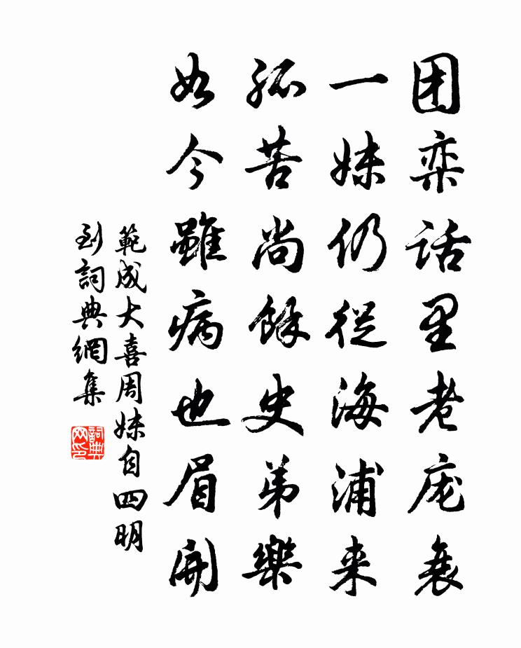 詩詞名句歷史字典書法欣賞書法字典國語詞典說文解字康熙字典古漢語字典標 題 作 者 詩 句 喜周妹自四明到作者:范成大 朝代:宋代喜周妹自四明到原文團欒話里老龐衰,一妹仍從海浦來。孤苦尚余史弟樂,如今雖病也眉開。詩詞問答問:喜周妹自四明到的作者是誰?答:范成大問:喜周妹自四明到寫於哪個朝代?答:宋代問:范成大的名句有哪些?答:范成大名句大全范成大喜周妹自四明到書法欣賞喜周妹自四明到書法作品詩詞推薦送張安國章甫〔宋代〕前日見公如桂林,梅黃風雨天多陰。今年見公長沙去,草綠江湖春水深。借問長沙多少路,盡暗前年曾到處。如公題黃敕背詩陳彭年甥〔宋代〕彭年頭腦太冬烘,眼似硃砂鬢似蓬。紕繆幸叨三字內,荒唐仍預四人中。放他權勢欺明主,落卻親情賣至公。千百堤下孔武仲〔宋代〕堤下人家喧笑語,高揭青簾椎瓦鼓。黃流滾滾經檐甍,一任征夫作船苦。綠榆覆水平如杯,前灣旋放水頭來。深如白二十二侍郎有雙鶴留在洛下予西園多野水長松…請之裴度〔唐代〕聞君有雙鶴,羈旅洛城東。未放歸仙去,何如乞老翁。且將臨野水,莫閉在樊籠。好是長鳴處,西園白露中。贈天台葉尊師方乾〔唐代〕莫見平明離少室,須知薄暮入天台。常時愛縮山川去,有夜自攜星月來。靈藥不知何代得,古松應是長年栽。先生奉寄李十五秘書二首杜甫〔唐代〕避暑雲安縣,秋風早下來。暫留魚復浦,同過楚王台。猿鳥千崖窄,江湖萬里開。竹枝歌未好,畫舸莫遲回。行李相和歌辭輓歌二首於鵠〔唐代〕陰風吹黃蒿,輓歌渡秋水。車馬卻歸城,孤墳月明里。雙轍出郭門,綿綿東西道。送死多於生,幾人得終老。見人紫陽夜坐孫嵩〔宋代〕一夜燈前白佇單,沉吟有此夏初寒。露零若與人相語,松杪瀟瀟下石壇。讀《山海經》 其三陶淵明〔魏晉〕迢迢槐江嶺,是為玄圃丘。西南望崑墟,光氣難與儔。亭亭明玕照,洛洛清淫流。恨不及周穆,托乘一來游。四威儀釋慧遠〔宋代〕行,日午歸來打八更,荒草裹,結舌話無生。沁園春陳人傑〔宋代〕盡典書春衣,書換書津亭,送君此行。嘆清朝有道,何曾逐客,有司議法,忍及書生。歸去來兮,噫其甚矣,見說蟠雪夜登浦金樓遠望西山憶仲靈洒然有邁世之楊蟠〔宋代〕家占西湖島上雲,雪光月色更侵魂。興來爛漫心空老,詩罷蒼茫眼正昏。晉國衣冠何處覓,梁朝殿閣儼猶存。思君菩薩蠻舒亶〔宋代〕疏英乍蕾餘寒淺。蹋枝小鵲嬌猶顫。謾炷水沈香。簾波不是湘。清愁支酒力。畏聽江城笛。恁忍說華年。垂垂欲暮偈頌八十五首釋妙倫〔宋代〕華山突兀聳蒼穹,坐斷坤維千萬峰。潘閬騎驢山下過,只聞啼鳥鬧春風。上邵寶文王令〔宋代〕出處身之道,窮通命所關。孔猶聞宋逐,軻亦退梁還。茲道方中否,流風有後艱。客來方病憲,人戚不堪顏。士有貧居華岳〔宋代〕貧居不暇理椽茅,只倩江山圍一遭。林鳥樂時知地僻,嶺雲閒處覺天高。春衫著破重連線,臘酒擎乾獨醡糟。且把劉伶墓林景熙〔宋代〕碧落當年墮酒星,醉中萬事一浮萍。亦知人世無窮事,一醉松根不肯醒。芭蕉釋善珍〔宋代〕瓦溝月暗亂螢飛,照見芭蕉葉上詩。憶得前時吟最苦,自攜殘燭拂蛛絲。月湖山谷勸耕次韻鄧深〔宋代〕皂蓋朱幡游近郭,野桃山杏炫紅旂。看看新燕銜泥候,恰恰鳴鳩喚雨時。未用經丘思靖節,何妨學稼許樊遲。老農偈頌一百二十三首釋祖欽〔宋代〕一切法離分別相,依前諸相自如如。春風影里乾坤大,無限江山開畫圖。名句推薦天將暮,雪亂舞,半梅花半飄柳絮。馬致遠《壽陽曲·江天暮雪》 雁引愁心去,山銜好月來。李白《與夏十二登岳陽樓》 蕭蕭梧葉送寒聲,江上秋風動客情。葉紹翁《夜書所見》 訪戴歸來,尋梅懶去,獨釣無聊。薛昂夫《蟾宮曲·雪》 不怕三十而死,只怕死後無名。佚名《增廣賢文·下集》 櫚庭多落葉,慨然知已秋。陶淵明《酬劉柴桑》 別來半歲音書絕,一寸離腸千萬結。韋莊《應天長·別來半歲音書絕》 懷舊空吟聞笛賦,到鄉翻似爛柯人。劉禹錫《酬樂天揚州初逢席上見贈》 世事短如春夢,人情薄似秋雲。朱敦儒《西江月·世事短如春夢》 悲懷感物來,泣涕應情隕。潘安《悼亡詩三首》