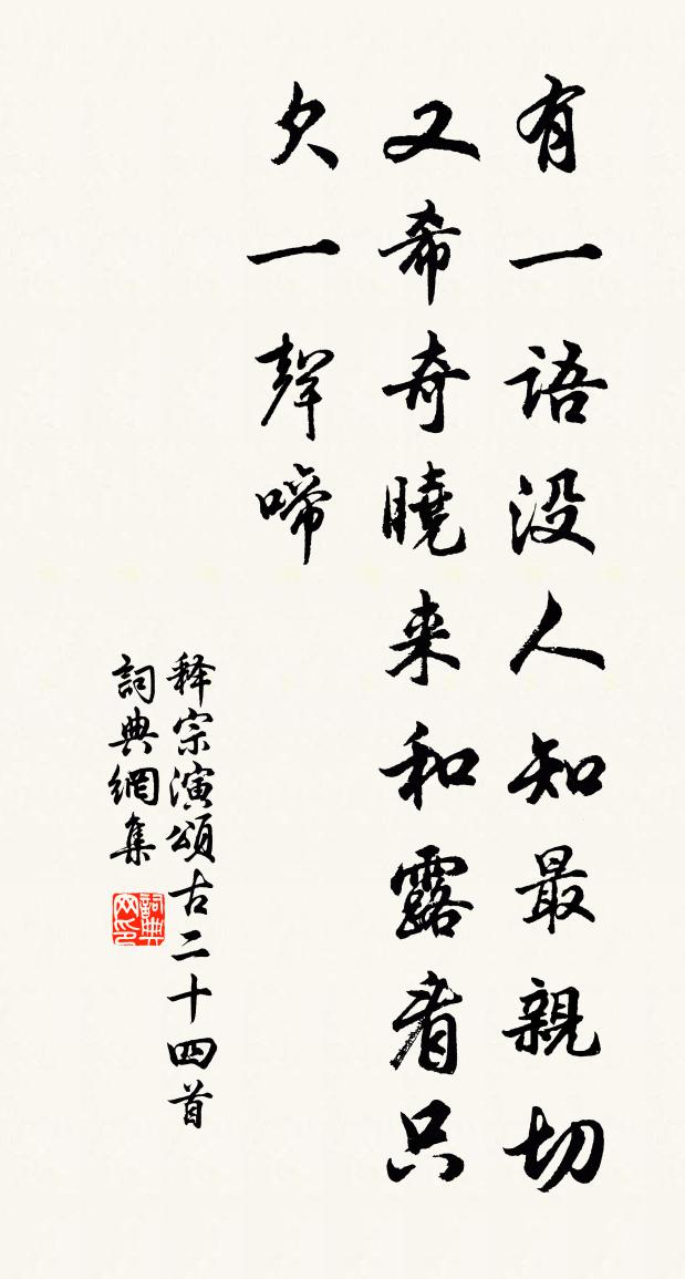 詩詞名句歷史字典書法欣賞書法字典國語詞典說文解字康熙字典古漢語字典標 題 作 者 詩 句 頌古二十四首作者:釋宗演 朝代:宋代頌古二十四首原文有一語,沒人知。最親切,又希奇。曉來和露看,只欠一聲啼。詩詞問答問:頌古二十四首的作者是誰?答:釋宗演問:頌古二十四首寫於哪個朝代?答:宋代釋宗演頌古二十四首書法欣賞頌古二十四首書法作品詩詞推薦請趙季憲主玉虛道院張爚〔宋代〕來自東山東復東,飛空一劍伴絲桐。能令矮屋疏籬下,如在十洲三島中。鍊句入神敲夜月,談玄動客笑春風。聞師後天易吟三十首方回〔宋代〕學者欲學易,當觀羑里時。如何是敬字,恐懼畏憂危。晨起覽鏡六首劉克莊〔宋代〕文致纍臣心事薄,包談眸子過名輕。可憐汝輩終身悔,得似先生隻眼明。華亭吳江道中偶作十絕朱長文〔唐代〕人間出鶴只雲間,相合仙經得亦難。塵外應多隨羽客,未教流俗等閒看。梁三朝雅樂歌 需雅 六沈約〔南北朝〕膳夫奉職獻芳滋。不麛不夭鹹以時。調甘適苦別澠淄。其德不爽受福厘。於焉逸豫永無期。臨江仙 西山靜坐尹志平〔元代〕靜坐西山深有益,等閒人事稀逢。終朝飯飽恣疏慵。養成清靜體,化出主人公。三十年來都亂覓,如今認證真容。送英公大師歸終南呂端〔宋代〕衡岳煙蘿紫閣雲,名高湖外晚游秦。清詞古學儒生業,圓笠方袍釋子身。竹杖拄歸山里寺,篆書留與世間人。我疑采葛婦歌先秦無名〔先秦〕葛不連蔓棻台台。我君心苦命更之。嘗膽不苦甘如飴。令我采葛以作絲。女工織兮不敢遲。弱於羅兮輕霏霏。號絺詠松胡仲弓〔宋代〕潛心寫幽韻,洗耳聽寒濤。吟聲自搖動,誤疑泛魚舠。聽琴王建〔唐代〕無事此身離白雲,松風溪水不曾聞。至心聽著仙翁引,今看青山圍繞君。經馮將軍墓陳允平〔宋代〕同山半白雲,此地葬將軍。香火空遺像,朝廷紀舊動。鐵衣懸古塔,金鉞鎮荒墳。一澗清泠水,年年生紫芹。次韻子由除日見寄蘇軾〔宋代〕薄宦驅我西,遠別不容惜。方愁後會遠,未暇憂歲夕。強歡雖有酒,冷酌不成席。秦烹惟羊羹,隴饌有熊臘。念為還佚名〔先秦〕子之還兮,遭我乎狃之間兮。並驅從兩肩兮,揖我謂我儇兮。子之茂兮,遭我乎狃之道兮。並驅從兩牡兮,揖我謂句王悅〔宋代〕雞犬數聲雲一雹,春陽桃李渺成蹊。席間即事劉克莊〔宋代〕急召傳來主第中,孫郎上馬鼓三通。山人無復金蓮夢,穩聽琵琶到曲中。挽陳本齋尚書牟巘五〔宋代〕天俾公多壽,人知道不孤。超然一室內,不與萬波俱。甲子機關報詩稿,烝嘗舊布襦。何妨傳遺老,文字照龜趺。武陵春·桃李風前多嫵媚辛棄疾〔宋代〕桃李風前多嫵媚,楊柳更溫柔。喚取笙歌爛熳游。且莫管閒愁。好趁春晴連夜賞,雨便一春休。草草杯盤不要收。鷓鴣天謝醉庵〔元代〕睡思才消賴有茶。老懷剛慰奈無花。花隨流水三春盡,柳疑東風一向斜。憐病久,怯春多。莫雲庭院噪歸鴉。碧雲贈東方道士徐夤〔唐代〕葫蘆窗畔掛,是物在其間。雪色老人鬢,桃花童子顏。祭星秋卜日,採藥曉登山。舊放長生鹿,時銜瑞草還。代王維謹挽李察院二首黃榦〔宋代〕關洛蕭條南渡日,龜山往事屬龍津。過庭詩禮傳宗旨,蓋世功名付後人。風憲隻身中與外,清忠壯節晚如新。崇蘭名句推薦一往情深深幾許?深山夕照深秋雨。納蘭性德《蝶戀花·出塞》 江上月明胡雁過,淮南木落楚山多。劉長卿《江州重別薛六柳八二員外》 興化致教,必由進善;康國寧人,莫大理惡。范曄《後漢書·列傳·伏侯宋蔡馮趙牟韋列傳》 青苔滿地初晴後,綠樹無人晝夢余。劉攽《新晴·青苔滿地初晴後》 胡沙沒馬足,朔風裂人膚。韋元甫《木蘭歌》 滿月飛明鏡,歸心折大刀。杜甫《八月十五夜月二首》 行行無別語,只道早還鄉。袁凱《京師得家書》 聽人以言,樂於鐘鼓琴瑟。荀子《荀子·非相》 為問山翁何事,坐看流年輕度,拚卻鬢雙華。葉夢得《水調歌頭·秋色漸將晚》 淒涼別後兩應同,最是不勝清怨月明中。納蘭性德《虞美人·曲闌深處重相見》