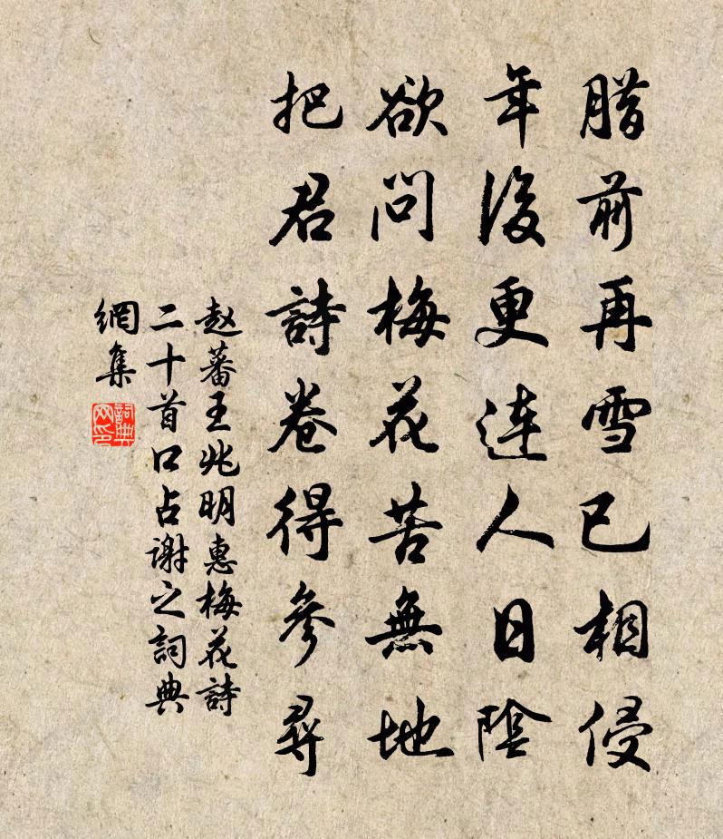詩詞名句歷史字典書法欣賞書法字典國語詞典說文解字康熙字典古漢語字典標 題 作 者 詩 句 王兆明惠梅花詩二十首口占謝之作者:趙蕃 朝代:宋代原文臘前再雪已相侵,年後更連人日陰。欲問梅花苦無地,把君詩卷得參尋。詩詞問答問:《王兆明惠梅花詩二十首口占謝之》的作者是誰?答:趙蕃問:該詩寫於哪個朝代?答:宋代書法欣賞王兆明惠梅花詩二十首口占謝之書法作品詩詞推薦【雙調】壽陽曲_答盧疏齋山珠簾秀〔元代〕答盧疏齋山無數,煙萬縷,憔悴煞玉堂人物。倚篷窗一身兒活受苦,恨不得隨大江東去。冬季會黎正卿分司席上開送周六赴濠州戶曹二首張耒〔宋代〕從來悟道不由書,覿面相呈已有餘。麈尾花飛終不近,濠梁古鬼解揶揄。再見王進之於潭王即有岳鄂之行贈之四首趙蕃〔宋代〕我客猶湖外,君行返漢中。乖離從此異,邂逅復茲同。始見忘曾識,徐言乃漸通。怪來顏重渥,深感鬢成蓬。宴朱衡守致語口號文天祥〔宋代〕翩翩紫馬絢銀潢,春入梅花新雨香。牛鬥劍芒浮翼軫,岷峨佩影度瀟湘。東南麾節精神合,上下風雲意氣長。且為沁園春(中秋約僚佐觀擊圓,登懷遠,用前韻)李曾伯〔宋代〕喚麴生來,與常娥約,從太守游。把玉簫聲寄,蕭關短笛,霓裳曲換,清塞重裘。桂影飄搖,桐陰立盡,多少征人句李長吉〔宋代〕龍首山頭桑苧翁。暮秋山行岑參〔唐代〕疲馬臥長坡,夕陽下通津。山風吹空林,颯颯如有人。蒼旻霽涼雨,石路無飛塵。千念集暮節,萬籟悲蕭晨。鶗鴂和東坡送仲天貺王元直六言韻五首黃庭堅〔宋代〕兩公六字語妙,獨我一雙眼明。筆似出林鳥翼,詩如落澗泉聲。幽州謠佚名〔唐代〕舊來夸戴竿,今日不堪看。但看五月里,清水河邊見契丹。寄潘致虛項安世〔宋代〕長憶潘居士,相望今幾州。生涯溫飽未,故舊往還不。問訊憑雙鯉,觀身渺一漚。湖南元好住,吾欲具扁舟。岳林古渡釋智愚〔宋代〕契翁來作濟人舟,兩岩青山浸碧流。舞棹舷歌不到處,知心惟有老岩頭。明日雨不止風加甚趙蕃〔宋代〕大雨曉未止,疾風朝更顛。茅飛疏我屋,禾偃病民田。未可專時戾,多繇得地偏。雖然豈無念,衣薄尚無綿。奉呈何叔信魏昭甫三首趙蕃〔宋代〕寒廳寂寞不知春,登眺招要藉所親。始謂姑傾一杯酒,已焉顛倒白綸巾。江南王安石〔宋代〕江南春起柂,秋至尚波濤。問舍才能定,呼舟已復操。行歌付浩蕩,歸夢得蕭騷。冉冉欲何補,紛紛為此勞。張伯修令君賦詩同韻稱慶程公許〔宋代〕玉節何如素節高,歸來喜氣溢東皋。存耕元自有餘地,嘉植何曾生不毛。採石勛名須世濟,陵陽今昔幾人豪。含飴曾同年南仲至自德清二首袁說友〔宋代〕老去慵馳鶩,詩來慰闊疏。吾廬聊復爾,仁里盍依於。乞米慚書帖,呼兒笑擷蔬。強吟須捻句,博得玉鉤書。戴帥初九日無憀以滿城風雨近重陽為韻七首袖陳著〔宋代〕平生朋友樂,魚泳雁飛翔。如今不復昔,往往深退藏。安得無方心,相照松柏霜。飲此九日酒,味哉剝果陽。歸雁游酢〔宋代〕天末驚風急,江湖野思長。悲鳴愁絕塞,接翼冒風霜。澤岸多矰弋,雲間乏稻粱。茫然棲息地,飲啄欲何鄉。冶城樓曾極〔宋代〕裊裊疎林集晚鴉,鐘山雲氣入檐牙。何人乘月吹長笛,夜看雲陵百萬家。醉中絕句陸游〔宋代〕有山有水登臨地,無病無愁嘯傲身。世念秋毫除未盡,麴生應恨白頭新。名句推薦今歲早梅開,依舊年時月。張孝祥《卜運算元·雪月最相宜》 風定落花深,簾外擁紅堆雪。李清照《好事近·風定落花深》 卻憶安石風流,東山歲晚,淚落哀箏曲辛棄疾《念奴嬌·登建康賞心亭呈史致道留守》 明朝萬一西風動,爭向朱顏不耐秋。晏幾道《鷓鴣天·守得蓮開結伴遊》 看萬山紅遍,層林盡染;漫江碧透,百舸爭流。 * 《沁園春·長沙》 三月休聽夜雨,如今不是催花。張炎《清平樂·采芳人杳》 見出以知入,觀往以知來列子及其弟子《列子·說符》 剪不斷,理還亂,是離愁。別是一般滋味在心頭。李煜《相見歡·無言獨上西樓》 四月十七,正是去年今日,別君時。韋莊《女冠子·四月十七》 又莫是東風逐君來,便吹散眉間一點春皺蘇軾《洞仙歌·詠柳》