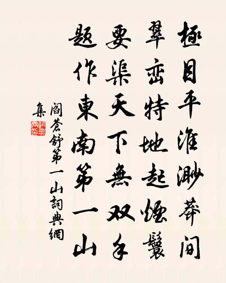 詩詞名句歷史字典書法欣賞書法字典國語詞典說文解字康熙字典古漢語字典標 題 作 者 詩 句 第一山作者:閻蒼舒 朝代:宋代第一山原文極目平淮渺莽間,翠巒特地起煙鬟。要渠天下無雙手,題作東南第一山。詩詞問答問:第一山的作者是誰?答:閻蒼舒問:第一山寫於哪個朝代?答:宋代閻蒼舒第一山書法欣賞第一山書法作品詩詞推薦調笑令秦觀〔宋代〕戀戀,樓中燕。燕子樓空春色晚,將軍一去音容遠。空鎖樓中深怨,春風重到人不見。十二闌乾倚遍。代柬寄當塗大夫王去非劉宰〔宋代〕聞道王明府,仁聲已四傅。催科能不擾,賦入自爭先。理到頑民服,仁漸黠吏悛。俊良搜士類,疾苦訪氓編。義役新開棋軒呈元珍表臣歐陽修〔宋代〕竹樹日已滋,軒窗漸幽興。人間與世遠,鳥語知境靜。春光靄欲布,山色寒尚映。獨收萬籟心,於此一枰競。宣賜錦袍設上贈諸郡客劉兼〔唐代〕十月芙蓉花滿枝,天庭驛騎賜寒衣。將同玉蝶侵肌冷,也遣金鵬遍體飛。夜臥始知多忝竊,晝行方覺轉光輝。深冬賦求仁齋和趙使君劉黻〔宋代〕一編論語半言仁,克復工夫理趣真。斂在黃堂三寸地,散為橫浦十分春。元陽有宰群霾伏,太極無邊萬象陳。生意皇后閣春帖子陸升之〔宋代〕內仗朝初退,朝曦滿翠屏。硯池渾不凍,端為寫蘭亭。慶清朝(梅花)史浩〔宋代〕翠竹莖疏,碧溪流淺,綺窗為爾時開。依稀遠岸,才見一點寒梅。冷定半疑是雪,因風還度暗香來。醉清興,瘦策遠遊篇曹植〔魏晉〕夜光明珠。下隱金沙。采之誰遺。漢女湘娥。探梅李洪〔宋代〕甌粵千山外,清愁只個般。澹煙增態度,飛霰斗高寒。鄭圃乘風馭,孤山傍水看。少陵詩興動,題品信知難。無題黃公度〔宋代〕雞蟲底處覓得失,鳧鶴無心較短長。醫國未能三折臂,憂時空費九迴腸。雜興六首皎然〔唐代〕吾觀談天客,工言喪其精。萬物資廣庇,此中何有情。若為昧顏跖,修短怨太清。高論讓鄒子,放詞征屈生。請從題蕭叔原江山圖畫曾豐〔宋代〕玻璃橫眼蒼玉立,一段清姿天幻出。霞作丹漿雲墨汁,恢張太素以為質。一時盤古縱橫筆,萬古玄冥濃淡色。乾坤偈頌八十七首釋慧開〔宋代〕天陰性地昏,日出心光耀。柱杖笑呵呵,禪{左爿右木}也{左足右孛}跳。管甚歲餘閏,一任月大小。淈{左氵偈頌二百零五首釋正覺〔宋代〕一陣清霜,千峰寒色,里許是誰看轉側。家風克紹紹非功,撫背忽驚兒脫白。溪庵十首劉克莊〔宋代〕曾結絲絇侍玉旒,暮年身世寄滄洲。醜容詎得陪三閣,強項安能事五樓。何用渡蘆登彼岸,偶然斬草樂斯邱。牧童傾杯樂(大石調)柳永〔宋代〕皓月初圓,暮雲飄散,分明夜色如晴晝。漸消盡、醺醺殘酒。危閣回、涼生襟袖。追舊事、一餉憑闌久。如何媚容偈頌七十二首釋祖欽〔宋代〕白玉階前金鳳舞,黃金殿上玉雞鳴。正中來與兼中到,昨夜雲深月正明。過野翁亭因登岝崿山憩崇壽院僧軒共成四絕句張鎡〔宋代〕甲子峰高正遲連,白雲勝涌似爐煙。群仙若訝歸來晚,只躡雪根上碧天。傷心詩錢秉鐙〔清代〕著眼空花一刻徂,蒼天何意奪童烏?玉台已碎懷中鏡,明月還沉掌上珠。早信靈氛逃大劫,難將因果問浮屠。平生任氏行白居易〔唐代〕燕脂漠漠桃花淺,青黛微微柳葉新。名句推薦河水傾潑丈余,雞鳴犬吠滿城中。蒲松齡《地震》 自見之謂明。韓非及後人《韓非子·喻老》 風波不信菱枝弱,月露誰教桂葉香李商隱《無題·重幃深下莫愁堂》 愛之不以道,適所以害之也。司馬光《資治通鑑·晉紀十八》 愛子心無盡,歸家喜及辰。蔣士銓《歲暮到家》 纖雲弄巧,飛星傳恨,銀漢迢迢暗度。秦觀《鵲橋仙·纖雲弄巧》 佳辰強飲食猶寒,隱几蕭條戴鶡冠。杜甫《小寒食舟中作》 江上月明胡雁過,淮南木落楚山多。劉長卿《江州重別薛六柳八二員外》 金陵津渡小山樓,一宿行人自可愁。張祜《題金陵渡》 戰戰慄栗,日慎一日,苟慎其道,天下可有。韓非及後人《韓非子·初見秦》