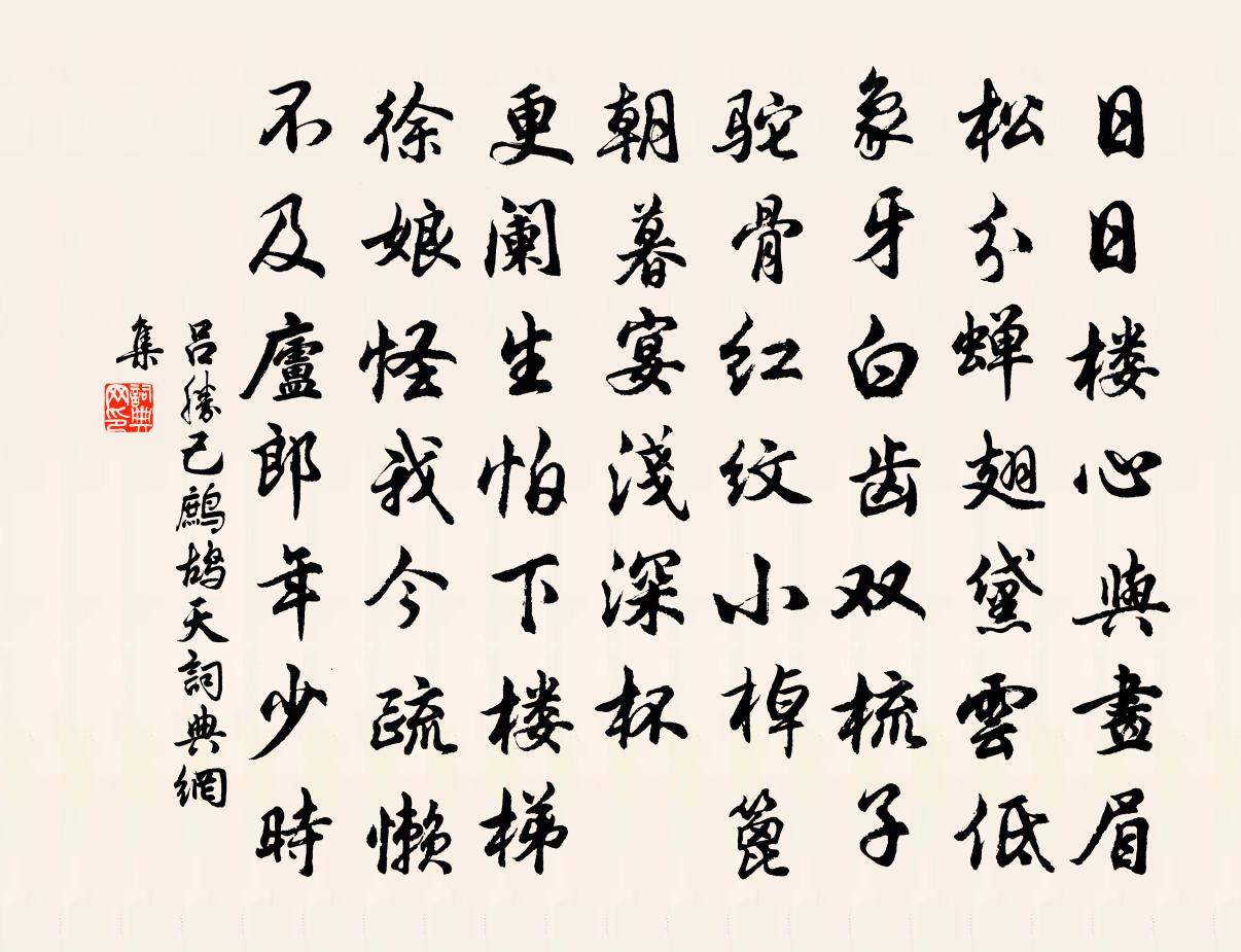 詩詞名句歷史字典書法欣賞書法字典國語詞典說文解字康熙字典古漢語字典標 題 作 者 詩 句 鷓鴣天作者:呂勝己 朝代:宋代鷓鴣天原文日日樓心與畫眉。松分蟬翅黛雲低。象牙白齒雙梳子,駝骨紅紋小棹篦。朝暮宴,淺深杯。更闌生怕下樓梯。徐娘怪我今疏懶,不及廬郎年少時。詩詞問答問:鷓鴣天的作者是誰?答:呂勝己問:鷓鴣天寫於哪個朝代?答:宋代問:鷓鴣天是什麼體裁?答:詞呂勝己鷓鴣天書法欣賞鷓鴣天書法作品詩詞推薦王通徐鈞〔宋代〕太平十二策空陳,得似河汾講道真。縷指隋唐名將相,多君交友與門人。贈僧繆鑒〔宋代〕兩腳行來鐵石豎,相逢去住總隨緣。談空舌本原無語,打破機半不用豢。山檻看雲齋鼓後,竹窗聽雨夜燈前。客來詠雪馮時行〔宋代〕疏林墮棲鳥,寒潭悲臥蛟。與松為老伴,喚月結清交。檐滴冰為箸,梅添玉作梢。豐年何以報,作頌紀南郊。永遇樂 丙午歲仲秋,與胡中山同舟往南昌,梁寅〔元代〕之。中山能談泰定數年少羨君,有如瓊樹,相見何晚。虎瞰山前,輕船同載,正桂花香滿。對溪一夕,孤篷聽浪,宮詞張公庠〔宋代〕柳放金絲搭矮槐,御溝清影見樓台。落花流出宮城去,不似武陵容客來。書所見蘇泂〔宋代〕畫手何須覓范寬,有人樓上倚欄乾。瓊田玉界三千頃,野鴨飛來不道寒。戲贈陸大夫十二丈(一作樂府戲贈陸大夫十二丈)孟郊〔唐代〕蓮子不可得,荷花生水中。猶勝道傍柳,無事盪春風。淥萍與荷葉,同此一水中。風吹荷葉在,淥萍西復東。蓮花木蘭花慢 送柳湯佐之覃懷總管任張野〔元代〕羨春風五馬,恨無計,駐征鞍。想膠漆真情,雲煙高興,詩酒清歡。當時與君年少,到而今、雙鬢總成斑。幾度批五方帝佚名〔宋代〕惟帝乘防,司厥生殖。感所自興,據我炎德。既度斯筵,乃聲斯稷。對越居歆,介祉無極。歲晚書事十首劉克莊〔宋代〕書生元不信禨祥,老去無端慮事祥。白髮社巫雲日吉,明朝渫井更苫牆。凌丹亭方信孺〔宋代〕風馭來三峽,雲章下九天。名山開窟宅,飛宇納光躔。未見煙霞約,聊將歲月鐫。神遊誰復識,空誦白雲篇。次韻李之純少監惠硯黃庭堅〔宋代〕黃公山下黃雞秋,持節恤刑曾少休。小人負弩得開道,掃葉張飲林岩幽。相傳有石非地產,列仙持來自羅浮。酒酣九月十六日文興折贈綠萼梅數枝花多而甚香非趙蕃〔宋代〕舊聞良月似春時,真有梅花如許枝。綠萼深宜翠羽宿,靜香獨許蜜蜂知。木犀莫道開能再,庭菊無嗟晚乃移。不是薛德之之江東簡熊西玉諸公林景熙〔宋代〕乍逢還又別,龍竹葛陂陰。野水流春遠,江雲入暮深。新知滿湖海,遺老在山林。解後如相問,憑君道素心。水龍吟 贈趙晦之吹笛侍兒蘇軾〔宋代〕楚山修竹如雲,異材秀出千林表。龍鬚半翦,鳳膺微漲,玉肌勻繞。木落淮南,雨晴雲夢,月明風裊。自中郎不見清平樂 寄復初省郎,兼簡希孟文友曹伯啟〔元代〕情懷渺渺。客舍天將曉。百慮攻心渾未了。不似漫郎多少。人生傀儡棚中。此行那計西東。指日雲泥超異,重占口句高似孫〔宋代〕菊才得才破,蟹卻十分遨。夜賦陸游〔宋代〕檐滴新春雨,窗昏半夜燈。病無詩一字,窮賴酒三升。世路澀如棘,祠官冷欲冰。殘年只此是,年少解飛騰。句釋曉瑩〔宋代〕餘思草萋萋。王東卿惠墨戲副之以詩因次韻謝之蔡戡〔宋代〕揮翰等閒遊戲爾,誰能十日畫一水。煙雲杳靄咫尺間,遠勢應須論萬里。名句推薦南北山頭多墓田,清明祭掃各紛然。高翥《清明日對酒》 今日樓台鼎鼐,明年帶礪山河辛棄疾《西江月·堂上謀臣尊俎》 黃鸝驚夢破,青鳥喚春還。張弘范《臨江仙·憶舊》 怪人不知理,知理不怪人。佚名《增廣賢文·下集》 王師北定中原日,家祭無忘告乃翁。陸游《示兒》 秋陰不散霜飛晚,留得枯荷聽雨聲。李商隱《宿駱氏亭寄懷崔雍崔袞》 得眾而不得其心,則與獨行者同實。管仲《管子·參患》 曉戰隨金鼓,宵眠抱玉鞍。李白《塞下曲六首·其一》 千載休談南渡錯,當時自怕中原復。文徵明《滿江紅·拂拭殘碑》 使能,國之利也。左丘明《左傳·文公·文公六年》