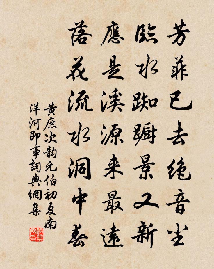 詩詞名句歷史字典書法欣賞書法字典國語詞典說文解字康熙字典古漢語字典標 題 作 者 詩 句 次韻元伯初夏南洋河即事作者:黃庶 朝代:宋代次韻元伯初夏南洋河即事原文芳菲已去絕音塵,臨水踟躕景又新。應是溪源來最遠,落花流水洞中春。詩詞問答問:次韻元伯初夏南洋河即事的作者是誰?答:黃庶問:次韻元伯初夏南洋河即事寫於哪個朝代?答:宋代黃庶次韻元伯初夏南洋河即事書法欣賞次韻元伯初夏南洋河即事書法作品詩詞推薦逍遙詠宋太宗〔宋代〕非來非去亦非忙,所是凡為自短長。專志比徒歸一等,誰知禮度畏三光。相傳只要達真境,勿說辛勤卻易傷。授得夏日城中作二首齊己〔唐代〕三面僧鄰一面牆,更無風路可吹涼。他年舍此歸何處,青壁紅霞裹石房。竹低莎淺雨濛濛,水檻幽窗暑月中。有境次韻孔毅父種花因送海棠廳三大字求茶晁補之〔宋代〕東園老槐春不發,舉頭只見中條雪。江梅去國亦悽然,一萼聊堪映庭月。未信河灘宜海棠,十株立致非所望。為君次張漢卿次房趙蕃〔宋代〕平生幾讀右丞詩,未見賢孫歸去遲。邂逅雖欣適吾願,欲嗟人事好乖離。何太中輓詞二首陳師道〔宋代〕課最三川守,名成萬石君。平生欠一識,聲烈即多聞。兜率真歸處,琴台只斷雲。傷心今夜月,忍便到初墳。貢餘秘色茶盞徐寅〔唐代〕捩碧融青瑞色新,陶成先得貢吾君。巧剜明月染春水,輕施薄冰盛綠雲。古鏡破苔當席上,嫩荷涵露別江濱。中山句晃貫之〔宋代〕思與諸公論人物,試憑清議賦招魂。草堂不見杜陵老,折得青松度水歸。頌古三首釋寶印〔宋代〕水因有月方知靜,天為無雲始覺高。獨坐孤峰休更問,此時難著一絲毫。從李崇道覓潘衡墨四首趙蕃〔宋代〕人言潘谷久騰空,衡也崎嶇隱墨中。谷見坡詩衡用訣,了知真是一家風。法界頌張嵲〔宋代〕自從仞得無邊界,宇宙方知狹陋生。時節短於羊胛熟,廣輪才似一牛鳴。鳴箏曲楊維楨〔元代〕斷虹落屏山,斜雁著行安。釘鈴雙呎木,錯落千株拌。愁龍啼玉海,夜燕語雕闌。只應桓叔夏,重起為君彈。普州三亭均逸亭文同〔宋代〕亭宇跨城端,新苔磴道盤。風光晴水石,煙景暮林巒。簿領仍多暇,寶從每盡歡。何由掉塵鞅,聊問借闌乾。送殿丞楊備通理睦州宋庠〔宋代〕引藉淹閨序,監州得海壖。貪隨濤鷺驛,倦趁火城天。織紵吳儂富,垂綸漢客賢。遙知懷我處,霜月暝樓邊。菩薩蠻辛棄疾〔宋代〕江搖病眼昏如霧。送愁直到津頭路。歸念樂天詩。人生足別離。雲屏深夜語。夢到君知否。玉箸莫偷垂。斷腸天不九月三日喜雨,蓋不雨四十日矣楊萬里〔宋代〕玉帝愁聞早,雷公怒見須。搜龍無嚲處,倒海不遺余。稻里雲初活,蕎梢雪再鋪。老農啼又笑,欲去且安居。東掖四絕句入天台石象之〔宋代〕溪岑縈繞紅塵外,殿閣欹危翠靄間。我見老僧無一事,老僧更羨白雲閒。虞美人(見梅)方岳〔宋代〕鷗清眠碎晴溪月。幾夢寒蓑雪。斷橋籬落帶人家。枝北枝南初著、兩三花。曾於春底橫孤艇。香似詩能冷。娟娟立遣興喻良能〔宋代〕山園近寒食,春事總芳菲。風暖鵓鴣語,日長蝴蝶飛。花光明醉眼,草色淨塵衣。自足家居樂,為生未覺非。呂待制所居八詠緩步王炎〔宋代〕躍馬乘軒四十年,誰知公是地行仙。向來曳履星辰上,今作游山杖屨緣。總為鼻端清栩栩,能令腳底步翩翩。青鞋吳尉東閣西亭劉過〔宋代〕襲桂行香徑,朱欄稍轉西。水風颼石冷,雲月墮檐低。棋敗深杯罰,詩豪健筆題。舞忙釵鬢亂,更為捧柔荑。名句推薦聖人不貴尺之壁,而重寸之陰劉安及其門客《淮南子·原道訓》 輕汗微微透碧紈,明朝端午浴芳蘭。蘇軾《浣溪沙·端午》 東風兮東風,為我吹行雲使西來。李白《久別離》 道不拾遺,民不妄取劉向《戰國策·秦一·衛鞅亡魏入秦》 無一語,對芳尊。安排腸斷到黃昏。秦觀《鷓鴣天·枝上流鶯和淚聞》 雖有其位,苟無其德,不敢作禮樂焉。雖有其德,苟無其位,亦不敢作禮樂焉。子思《中庸·第二十八章》 十二樓中盡曉妝,望仙樓上望君王。薛逢《宮詞》 庭軒寂寞近清明,殘花中酒,又是去年病。張先《青門引·春思》 山從人面起,雲傍馬頭生。李白《送友人入蜀》 虛靜無事,以暗見疵。韓非及後人《韓非子·主道》