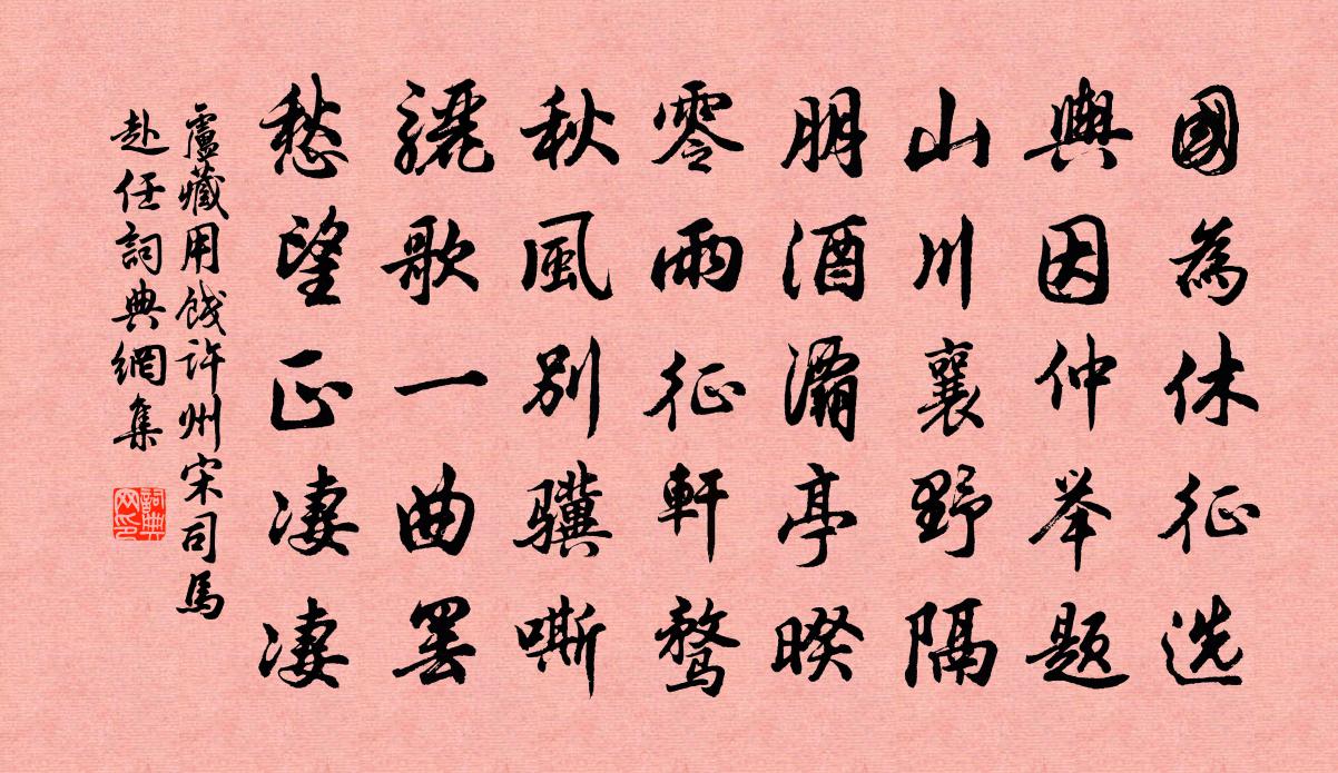 詩詞名句歷史字典書法欣賞書法字典國語詞典說文解字康熙字典古漢語字典標 題 作 者 詩 句 餞許州宋司馬赴任作者:盧藏用 朝代:唐代餞許州宋司馬赴任原文國為休徵選,輿因仲舉題。山川襄野隔,朋酒灞亭暌。零雨征軒騖,秋風別驥嘶。驪歌一曲罷,愁望正淒淒。詩詞問答問:餞許州宋司馬赴任的作者是誰?答:盧藏用問:餞許州宋司馬赴任寫於哪個朝代?答:唐代問:餞許州宋司馬赴任是什麼體裁?答:五律盧藏用餞許州宋司馬赴任書法欣賞餞許州宋司馬赴任書法作品注釋全唐詩:卷93_5詩詞推薦逍遙詠宋太宗〔宋代〕真一生天地,因依認宿緣。智高通理性,凡下少周旋。語默何奇絕,幽深隱聖賢。誰人解我意,大道寸心玄。駒支不屈於晉左丘明〔先秦〕會於向,將執戎子駒支。范宣子親數諸朝。曰:“來,姜戎氏。昔秦人迫逐乃祖吾離於瓜州,乃祖吾離被苫蓋,蒙張子野詩稿帖贊岳珂〔宋代〕觀水以水,本於知者之樂。取射以藝,譬諸巧者之中。時雖後先之不同,意或迭取而互用。句葩體莊,字謹心縱。倦遊陳郁〔宋代〕水於東江皆臣妾,山到衡陽無弟兄。兩處經行都已遍,老夫誰更別關情。自貽陸游〔宋代〕寒暑衣一稱,朝晡飯數匙。錢能禍撲滿,酒不負鴟夷。宮詞吳龍翰〔宋代〕舞罷霓裳寶髻垂,桃花扇底暖風吹。夜深內殿重開宴,手撚燈花畫翠眉。讀老子傳陸游〔宋代〕巍巍闕里與天崇,禮樂詩書萬世宗。但說周公曾入夢,寧於老氏嘆猶龍?摸魚子馬熙〔元代〕買陂塘旋栽楊柳,參知三島機務。方壺圓嶠千夫力,揮汗已能成雨。鳧立渚。看兩兩胎禽,俯伏紅雲嶼。忘機對語黃山歌湯復〔清代〕老人今年七十七,家在黃山東之側。山距吾家百餘里,夢寐常勞面未覿。今年鼓勇扶筇往,彳亍危岑神惕惕。步步雜詠一百首韓非劉克莊〔宋代〕韓子流於慘,聃書妙造微。百年同一傳,誰是復誰非。令防得女招飲以病不往走筆戲之韓元吉〔宋代〕平生諸女重吾貧,敢意君家亦效顰。醜惡未妨攘盜賊,長成難議卜比鄰。遙憐四十稱郎罷,豈惜千金辦主人。美酒四不忍劉子翬〔宋代〕漁陽疊鼓風沙戰,潑水淋漓舞胡旋。此時太息念鑾輿,玉體能勝寂寞無。六宮遭亂多奔迸,不復梨園歌舞盛。著鞭獨孤生策字景略河中人工文善射喜擊劍一世奇陸游〔宋代〕憶昨騎驢入蜀關,旗亭邂逅一開顏。氣鍾太華中條秀,文在先秦兩漢間。寶劍憑誰占鬥氣?名駒竟失養天閒。身今郊居秋晚五首趙蕃〔宋代〕庭菊種匪晚,秋風開爾遲。人嗟地力薄,我有歲寒期。蘭芷元同類,藁萊敢肆欺。懷哉非失所,社老謾銜悲。清平樂晏幾道〔宋代〕心期休問。只有尊前分。勾引行人添別恨。因是語低香近。勸人滿酌金鍾。清歌唱徹還重。莫道後期無定,夢魂猶奉酬敬亭石隱君劉宰〔宋代〕宛陵侍處敬亭山,中有臞仙獨閒。賸喜好音來物外,莫令佳句到人間。奉和武功學士舍人紀贈文懿大師淨公徐鉉〔唐代〕舊國荒閔成黍稷,故交危脆似琉璃。高從獨喜湯師在,手把新文數道碑。百丈有感錢時〔宋代〕不雜東華一點塵,桑麻滿眼土風淳。如何林下無嘉客,卻有西湖浩蕩春。社前一日用中秋夜未盡韻方回〔宋代〕清晨毛視園樹,槁葉脫梧檟。鄰家饋彘毛,里巷作秋社。報賽有故常,民欲其敢罷。勾龍得無羞,土毛旱欲赭。貧晚庭噪雀宋庠〔宋代〕空庭殘雨伴風休,芳樹陰陰晚雀留。無限好枝堪斂翼,不知何事更啁啾。名句推薦春思遠,誰嘆賞、國香風味。周密《繡鸞鳳花犯·賦水仙》 醉者之墜於車也,雖疾不死。骨節與人同,而犯害與人異,其神全也。列子及其弟子《列子·黃帝》 普天皆滅焰,匝地盡藏煙。沈佺期《寒食》 為問元戎竇車騎,何時返旆勒燕然。皇甫冉《春思》 坡謂西湖,正如西子,濃抹淡妝臨鏡台。劉過《六州歌頭·寄稼軒承旨》 不才明主棄,多病故人疏。孟浩然《歲暮歸南山 / 歸故園作 / 歸終南山》 白日光天兮無不曜,江左 一隅獨未照。魏收《魏書·列傳·卷四十四》 大雪壓青松,青松挺且直。陳毅《青松》 冰肌玉骨,自清涼無汗。蘇軾《洞仙歌·冰肌玉骨》 天秋日正中,水碧無塵埃。柳宗元《湘口館瀟湘二水所會》
