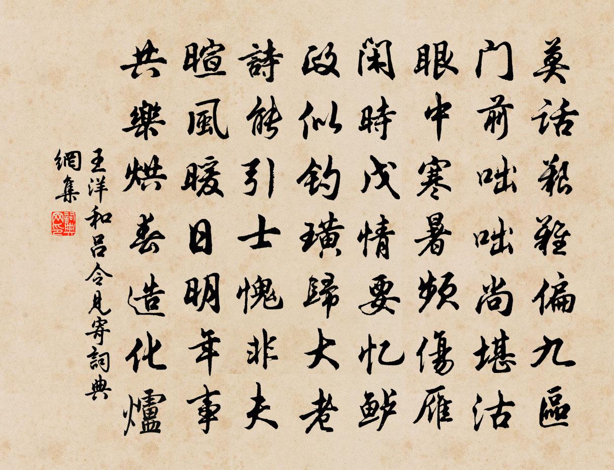 詩詞名句歷史字典書法欣賞書法字典國語詞典說文解字康熙字典古漢語字典標 題 作 者 詩 句 和呂令見寄作者:王洋 朝代:宋代和呂令見寄原文莫話艱難偏九區,門前咄咄尚堪沽。眼中寒暑頻傷雁,閒時戊情要憶鱸。政似釣璜歸大老,詩能引士愧非夫。暄風暖日明年事,共樂烘春造化爐。詩詞問答問:和呂令見寄的作者是誰?答:王洋問:和呂令見寄寫於哪個朝代?答:宋代王洋和呂令見寄書法欣賞和呂令見寄書法作品詩詞推薦浣溪沙·小院閒窗春色深李清照〔宋代〕小院閒窗春色深。重簾未卷影沈沈。倚樓無語理瑤琴。遠岫出山催薄暮,細風吹雨弄輕陰。梨花欲謝恐難禁。三月二十八日贈周判官白居易〔唐代〕一春惆悵殘三日,醉問周郎憶得無。柳絮送人鶯勸酒,去年今日別東都。晚步山間有作張繼先〔宋代〕宿鳥頻來語,尋巢未得間。小星明更近,高桂冷初攀。拂露松都在,因風信未還。豈無虛歇處,青及謝家山。文約既行復作此送之李流謙〔宋代〕登山臨水遠送君,征鴻掠天不堪聞。臨岐握手惜此別,車已載脂仆在門。驪歌未殘心欲動,剪燭夜談如昨夢。茂林次韻魯堯卿病起陳棣〔宋代〕一區聊寄古牆陰,燈火蕭條語夜深。強對簡編聊適意,欲參佛祖問安心。青衫有約還輕別,白髮無期苦見尋。咫尺行香子(次草窗憶古心公韻)劉辰翁〔宋代〕玉立風塵。光動黃銀。便談文、也到夜分。無人燭下,壁上傳神。記老婆心,寒士語,道人身。極意形容,下語難答句曲陶先生詩范雲〔南北朝〕終朝吐祥霧。薄晚孕奇煙。洞澗生芝草。重崖出醴泉。中有懷真士。被褐守沖玄。石戶棲十金壇謁九仙。乘鵷方履弟茝家醉中趁筆陳著〔宋代〕前山屏開照檐綠,後山如坐膝抱屋。數畝山園半畝池,松影參差庇梅竹。九月九日天氣清,銀白金黃百種菊。詩人太祖皇帝師次陳橋受天命協人情為聖皇武聖崔敦禮〔宋代〕聖皇武,憺顯幽。震逾恭,翼微周。帝下顧,民噢咻。糜沸鼎,汎橫流。杏其復,飛龍秋。挽天弧,建神矛。振汩謁洪澤鎮龍祠袁說友〔宋代〕平生忠孝徹幽冥,稽首龍祠鑒此誠。自是皇靈頻震疊,也知神力解因成。片帆以往無多路,百里之間只一程。目斷胡無人張舜民〔宋代〕洛陽一少年,善達古今事。意欲隳單于,慨然陳五餌。當時長安以為笑,今日施行獲其利。信哉敢謂胡無人,歲歲宣州謝朓樓餞別校書叔雲 / 陪侍御叔華登樓歌李白〔唐代〕棄我去者,昨日之日不可留;亂我心者,今日之日多煩憂。長風萬里送秋雁,對此可以酣高樓。蓬萊文章建安骨,梅花二首遺正仲少見折贈之意舒岳祥〔宋代〕晴暖不妨臨石瀨,清寒多是傍柴關。香須蜂咬應知苦,斜影僧眠得占閒。數點稀星枝上下,一痕殘雪樹中間。入冬牧童詞張籍〔唐代〕遠牧牛,繞村四面禾黍稠。陂中飢鳥啄牛背,令我不得戲壠頭。入陂草多牛散行,白犢時向蘆中鳴。隔堤吹葉應同秋夜喜遇王處士王績〔唐代〕北場芸藿罷,東皋刈黍歸。相逢秋月滿,更值夜螢飛。寄悼浦江吳縣令清翁連文鳳〔宋代〕曾於詩裹識清名,幾夜吟看婺女星。番令宅前花未盛,延陵暮上草先青。燈搖殘月佳人哭,碑立斜陽御史銘。一紙安邊袁燮〔宋代〕安邊在良將,至矣晁生語。邊疆無良臣,胡能固吾圉。孰為國之良,四德貴兼取。智慧型制勍敵,仁能撫軍旅。勇足石左藏輓詩二首文同〔宋代〕世澤傳清范,戎韜演秘謀。雄藩未賜節,大壑忽移舟。謝氏胡床在,羊公羽扇收。光華歸令子,何恨掩泉丘。奉呈天谷白玉蟾〔宋代〕底事英人便養高,角鷹放了棄弓刀。六壬六遁成韜晦,四塞三邊婁繹騷。九十日秋涼氣少,一千年事亂時多。長歌游寺李鹹用〔唐代〕無家自身在,時得到蓮宮。秋覺暑衣薄,老知塵世空。幽情憐水石,野性任萍蓬。是處堪閒坐,與僧行止同。名句推薦凡事之本,必先治身呂不韋《呂氏春秋·紀·季春紀》 明月照相思,也得姮娥念我痴。高鶚《南鄉子·戊申秋雋喜晤故人》 大凡物不得其平則鳴韓愈《送孟東野序》 漢家君臣歡宴終,高議雲台論戰功。王維《少年行四首》 一片段預告飛減卻春,風飄萬點正愁人。杜甫《曲江二首》 梅子黃時日日晴,小溪泛盡卻山行曾幾《三衢道中》 江豚吹浪立,沙鳥得魚閒。薛時雨《臨江仙·大風雨過馬當山》 強龍不壓地頭蛇。吳承恩《西遊記·第四十五回》 泰山嵯峨夏雲在,疑是白波漲東海。李白《早秋單父南樓酬竇公衡》 一庭春色惱人來,滿地落花紅幾片。魏承班《玉樓春·寂寂畫堂樑上燕》
