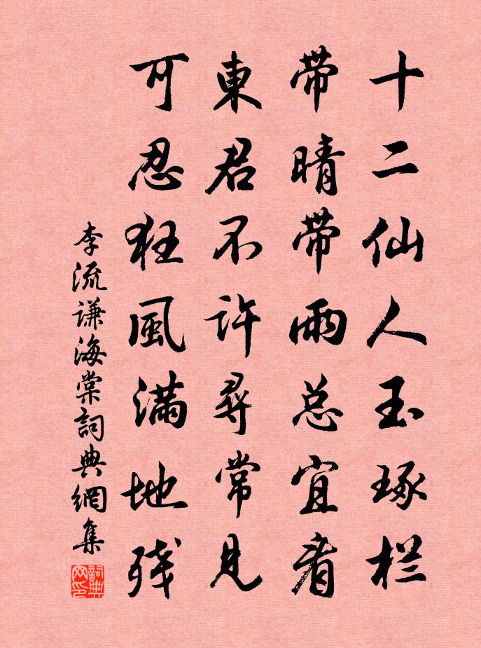 詩詞名句歷史字典書法欣賞書法字典國語詞典說文解字康熙字典古漢語字典標 題 作 者 詩 句 海棠作者:李流謙 朝代:宋代海棠原文十二仙人玉琢欄,帶晴帶雨總宜看。東君不許尋常見,可忍狂風滿地殘。詩詞問答問:海棠的作者是誰?答:李流謙問:海棠寫於哪個朝代?答:宋代李流謙海棠書法欣賞海棠書法作品詩詞推薦郊廟歌辭。周宗廟樂舞辭。忠順佚名〔唐代〕稱文既表溫柔德,示武須成蹈厲容。綴兆疾舒皆應節,明明我祖樂無窮。送臧尉梅堯臣〔宋代〕藹藹神僊尉,西風躍馬蹄。離群賦黃鵠,拜慶著斑衣。雨氣連關黑,槐花上路飛。同為洛陽客,今日故人稀。秋郊有懷陸游〔宋代〕秋山瘦益奇,秋水淺可涉。出城西風勁,拂帽吹脫葉。新霜拆栗罅,宿雨飽豆莢,枯柳無鳴蜩,寒花有穿蝶。郊行頌古一○一首釋子淳〔宋代〕白藕未萌非隱的,紅花出水不當陽。遊人莫用傳訊息,自有清風透遠香。淮上寄趙茂實戴復古〔宋代〕渺渺長淮路,秋風落木悲。乾坤限南北,胡虜迭興衰。志士言機會,中原入夢思。江湖好山色,都在夕陽時。再和鄭獬〔宋代〕使君攜酒送餘春,縹緲高懷倚白雲。新曲旋教花下按,好題只就席間分。阮公醉帽玉山倒,謝女舞衣瀋水薰。自笑豹丁謂〔宋代〕炳蔚西方美,群居即谷陰。人文窮燮妙,將略取名深。飾用千金直,韜藏七日心。會當窺落落,莫向管中尋。登岳陽樓蕭德藻〔宋代〕不作蒼茫去,真成浪蕩游。三年夜郎客,一柁洞庭秋。得句鷺飛處,看山天盡頭。猶嫌未奇絕,更上岳陽樓。夜坐釋行海〔宋代〕寂寞燈花慰客情,濕雲收盡月還明。夜寒不作東歸夢,坐聽空山落葉聲。春意郊行黎廷瑞〔宋代〕卯酒醒來欲午天,意行平陸自悠然。近山欲雨有遠意,老樹得春還少年。蝶化不知何宇宙,蝸爭難到好林泉。令人和李相國許渾〔唐代〕巨實珍吳果,馴雛重越禽。摘來漁浦上,攜在兔園陰。霜合凝丹頰,風披斂素襟。刀分瓊液散,籠簌雪華深。虎帳感春三首張耒〔宋代〕亦知春歸不可留,有情未忘寧免愁。平田茫茫芳草合,清洛不斷波悠悠。傷心千里寄雙淚,催老此身初白頭。問舍朱叔賜來自都城雲梅已放因思每歲飲賞之樂李洪〔宋代〕曾酌孤山園裡梅,至今魂夢憶花開。纖腰冷逼江煙瘦,素臉全疑曉雪催。南國相逢心恅愺,西湖遙想月徘徊。惜無叔度賢良再用游字韻見貽複次韻謝之喻良能〔宋代〕夕郎分閫鎮東秋,幕下揮毫秦少游。一代風流今不泯,百年文物尚堪求。交情莫逆人誰似,吟事方殷歲又遒。他日潮到看人發舟曾豐〔宋代〕潮信猶為小,風聲未至雄。船輕爭向上,江闊敢當中。持後柁宣力,當先帆用功。區區篙艕槳,罪與素餐同。一萼紅(弁陽翁新居,堂名志雅,詞名萍洲漁笛譜)張炎〔宋代〕制荷衣。傍山窗卜隱,雅志可閒時。款竹門深,移花檻小,動人芳意菲菲。怕冷落、苹洲夜月,想時將、漁笛靜中訓世孝弟詩十首邵雍〔宋代〕子孝親兮弟敬哥,吁嗟分拆聽搬唉。囊中財物他嫌少,祖上田園你要多。夫婦眼前雖快樂,兒孫日後恐消磨。何如哭女樊元稹〔唐代〕秋天淨綠月分明,何事巴猿不賸鳴。應是一聲腸斷去,不容啼到第三聲。秋雨小酌贈賈七張耒〔宋代〕出門花秋雨泥漫花漫,嗟我花后土何時乾。官曹事休歸舍臥,破屋淅淅西風寒。弱妻傾榼勸我起,稚子笑語爭杯盤破虜凱歌六首周麟之〔宋代〕夜半江風金鼓聲,拔營初起石頭城。虜情不料諸軍渡,一戰淮西唾手平。名句推薦秋冬雪月,千里一色;蘇軾《放鶴亭記》 白雪關山遠,黃雲海戍迷。李白《紫騮馬》 身未升騰思退步,功成應憶去時言。只因先主丁寧後,星落秋風五丈原。羅貫中《三國演義·第三十八回》 小荷才露尖尖角,早有蜻蜓立上頭。楊萬里《小池》 憶昔霍將軍,連年此征討。高適《登百丈峰二首》 風吹仙袂飄颻舉,猶似霓裳羽衣舞白居易《長恨歌》 九曲黃河萬里沙,浪淘風簸自天涯。劉禹錫《浪淘沙·九曲黃河萬里沙》 游女昔解佩,傳聞於此山孟浩然《萬山潭作》 淡淡梅花香欲染,絲絲柳帶露初乾。曹雪芹《香菱詠月·其二》 世業事黃老,妙年孤隱淪宋之問《始安秋日》