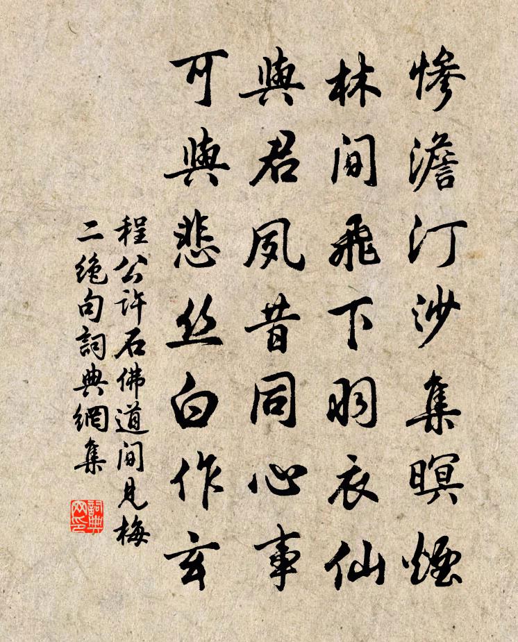 詩詞名句歷史字典書法欣賞書法字典國語詞典說文解字康熙字典古漢語字典標 題 作 者 詩 句 石佛道間見梅二絕句作者:程公許 朝代:宋代石佛道間見梅二絕句原文慘澹汀沙集暝煙,林間飛下羽衣仙。與君夙昔同心事,可與悲絲白作玄。詩詞問答問:石佛道間見梅二絕句的作者是誰?答:程公許問:石佛道間見梅二絕句寫於哪個朝代?答:宋代程公許石佛道間見梅二絕句書法欣賞石佛道間見梅二絕句書法作品詩詞推薦胡帥見和用韻再寄黃彥平〔宋代〕國步誰為醒,民生乃見兵。選賢丞相府,持節伏波營。健筆千鈞重,無鋒一鳥輕。片南多興緒,相憶暮雲平。謝都官監建安郡宋祁〔宋代〕郎署新疇出宰功,海閩關夾使旌雄。晨塗倦伏雙毫奏。暮席貪隨五兩風。芳荈摘山唐貢遠,薧魚升豆漢祠豐。賭囊泰伯廟王令〔宋代〕古廟郁崔嵬,朱門傃道開。今人不為讓,間或乞靈來。馮公嶺翁卷〔宋代〕亂峰千疊拂雲霓,輻合坑崖立似梯。曾向括州州里望,眾山卻是此山低。送王郎中之官吉水李建勛〔唐代〕南望廬陵郡,山連五嶺長。吾君憐遠俗,從事輟名郎。移戶多無土,春蠶不滿筐。惟應勞贊畫,溪峒況強梁。和毛秀才江墅幽居好十首穆修〔宋代〕江墅幽居好,名山對九華。疏篁十餘畝,古屋兩三家。碓下雞爭黍,籬根虺逐蛙。水邊閒送目,獨鳥在秋槎。南池陶弼〔宋代〕五月紅蓮繁盛時,隼旆同賞郡南池。額名舊載零陵志,碑字新鐫子厚詩。採藥銜杯愁滿滿,折花行令笑遲遲。明年登清心閣楊萬里〔宋代〕若遭好月喚登樓,腳力雖慵不自由。上得金梯一回首,冰輪已過樹梢頭。鷓鴣天賀鑄〔宋代〕轟醉王孫玳瑁筵。渴虹垂地吸長川。側商調里清歌送,破盡窮愁直幾錢。孤棹艤,小江邊。愛而不見酒中仙。傷心偈頌一百零一首釋慧性〔宋代〕一葉落,天下秋。一塵起,大地收。明明祖師意,明明百草頭。相頭賣帽,看樓打樓。更嫌何處不風流。題李太白墓梅之煥〔元代〕採石江邊一堆土,李白之名高千古。來來往往一首詩,魯班門前弄大斧。送王諫議充東都留守判官李嘉祐〔唐代〕時稱謝康樂,別事漢平津。衰柳寒關道,高車左掖臣。背河見北雁,到洛問東人。憶昔游金谷,相看華發新。白塔院陸游〔宋代〕冷翠千竿玉,浮嵐萬幅屏。憑欄避微雨,挈笠遇歸僧。殘月明樓角,屯雲擁塔層。溪山屬閒客,隨意倚枯藤。紹興祀九宮貴神十首佚名〔宋代〕某獻有序,降登無邊。禮樂備舉,昭格燕娭。雲車縹緲,神日還歸。報以景貺,翊我昌期。沈洞主趙師秀〔宋代〕案上陰符卷,應逢驪母傳。無言過永日,不食度終年。雲覆燒丹灶,花浮洗藥泉。時聞有玄虎,來禮洞門前。次韻李曼朝散得郡西歸留別二首蘇轍〔宋代〕懷印徒行尚故衣,邸中掾史見猶疑。千人上冢鄉關動,五馬行春雨澤隨。醉里墜車初未覺,道中破甑復誰悲。西行和御製祀后土寇準〔宋代〕臨晉迎清蹕,靈壇備克禋。薦誠祠后土,求福為蒸民。展義王猷遠,推恩慶賜均。千官陪漢祀,萬國奉虞巡。仗衛戴式之來訪惠石屏小集鄒登龍〔宋代〕詩翁香價滿江湖,肯訪西郊隱者居。瘦似杜陵常戴笠,狂如賈島少騎驢。但存一路征行藁,安用諸公介紹書。篇易贈東鄰王十三白居易〔唐代〕攜手池邊月,開襟竹下風。驅愁知酒力,破睡見茶功。居處東西接,年顏老少同。能來為伴否?伊上作漁翁。次王巡檢韻三首陳造〔宋代〕平生嘿識玩詩昌,對客揮毫底未忘。只恐韓陵讀碑客,誚君草草誚吾狂。名句推薦當壚秦女,十五語如弦。賀鑄《行路難·縛虎手》 黃鶴樓中吹玉笛,江城五月落梅花。李白《與史郎中欽聽黃鶴樓上吹笛 / 題北榭碑》 春愁凝思結眉心,綠綺懶調紅錦薦。顧敻《玉樓春·拂水雙飛來去燕》 悲吟雨雪動林木,放書輟劍思高堂。李白《留別於十一兄逖裴十三游塞垣》 顏子之不校,孟子之自反,是賢人處橫逆之方王永彬《圍爐夜話·第四九則》 以子之矛陷子之盾韓非及後人《韓非子·難一》 貧賤非辱,貧賤而諂求於人者為辱王永彬《圍爐夜話·第三一則》 縱被春風吹作雪,絕勝南陌碾成塵。王安石《北陂杏花》 文死諫,武死戰。曹雪芹《紅樓夢·第三十六回》 算陰晴,渾似幾番,渭城故人離會。吳文英《永遇樂·乙巳中秋風雨》