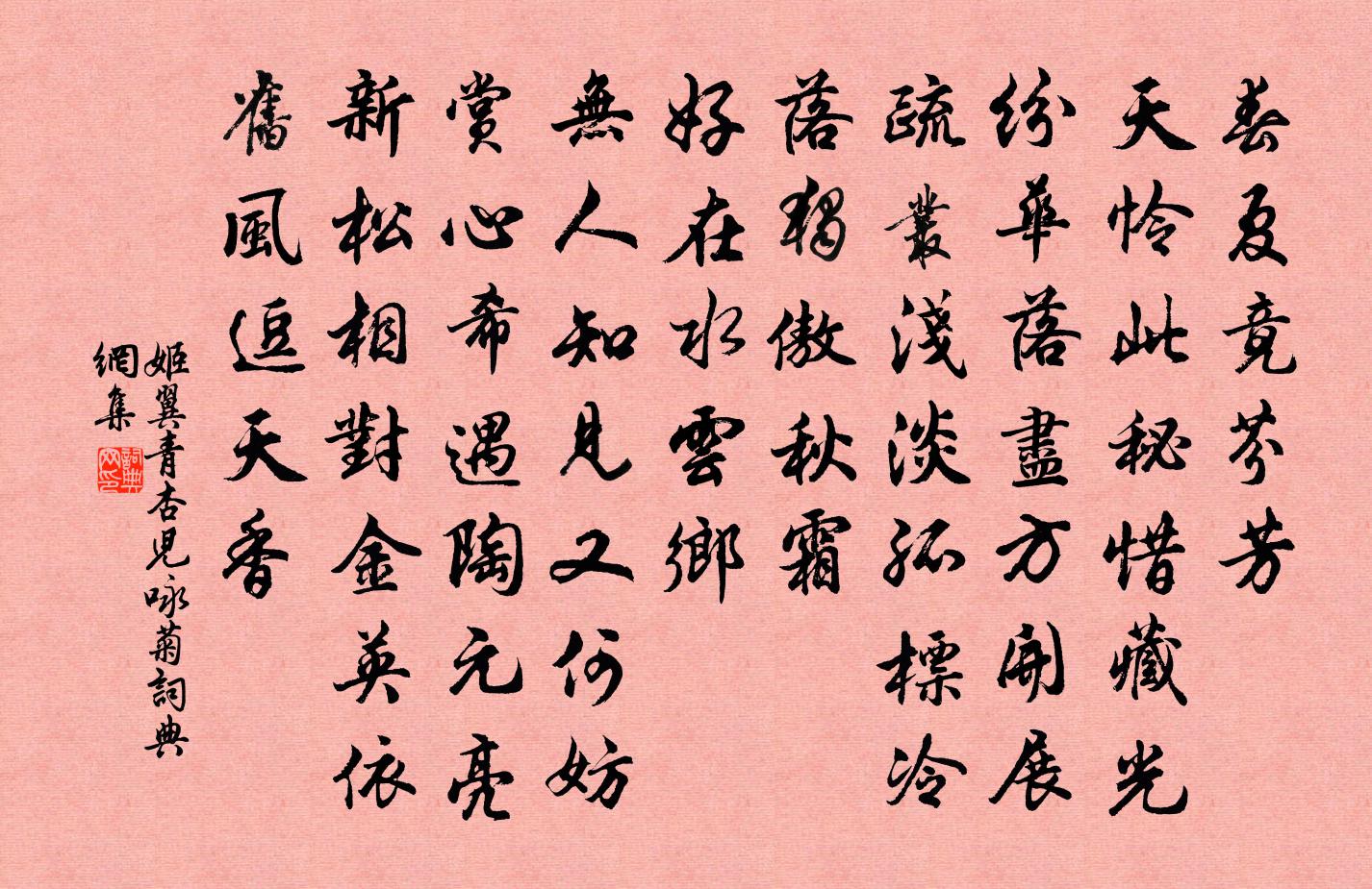 詩詞名句歷史字典書法欣賞書法字典國語詞典說文解字康熙字典古漢語字典標 題 作 者 詩 句 青杏兒 詠菊作者:姬翼 朝代:元代青杏兒 詠菊原文春夏竟芬芳。天憐此秘惜藏光。紛華落盡方開展,疏叢淺淡,孤標冷落,獨傲秋霜。好在水雲鄉。無人知、見又何妨。賞心希遇陶元亮,新松相對,金英依舊,風逗天香。詩詞問答問:青杏兒 詠菊的作者是誰?答:姬翼問:青杏兒 詠菊寫於哪個朝代?答:元代問:青杏兒 詠菊是什麼體裁?答:詞姬翼青杏兒 詠菊書法欣賞青杏兒 詠菊書法作品詩詞推薦春佚名〔宋代〕伶倫窺管夜飛灰,萬紫乾紅暗剪裁。微雨績天煙織雪,寒風簸水月篩梅。壽鳩索婦花前笑,鰥燕呼雛柳外哀。春草次韻夏日洪咨夔〔宋代〕秧青水白四郊同,召雨無煩訪守宮。槐葉煮{陶左換飠}隨市俗,蓮花搗麴稱家風。過從久謝三千客,嬉戲長娛七熱郭印〔宋代〕落日暑猶劇,虛亭風不來。半身流汗雨,兩耳聒蚊雷。扇手何曾歇,漿甌未放回。疇能呼屏翳,一霎盪炎埃。哭辯端上人釋智圓〔宋代〕平昔於詩苦,精搜省未閒。壞房空鳥外,清句滿人間。瘦影懸鄰壁,孤墳接舊山。吊回高樹下,寒水自潺潺。鷓鴣天 水仙詞沈禧〔元代〕邂逅江妃澤畔逢。何年謫降蕊珠宮。輕綃翦袂羅裁襪,秋水為神玉作容。清淺處,月明中。凌波微步欲飄空。三生寄育王廓和尚釋了演〔宋代〕向來事業俱荒廢,即體生涯迥一空。漸愧此身無被蓋,百般痴鈍玷宗風。秋懷五首孫嵩〔宋代〕黃山秋雕鎪,風露洗崖崿。行行聽清猿,處處采靈藥。秋雲老石床,已後十年約。送裴騰李頎〔唐代〕養德為眾許,森然此丈夫。放情白雲外,爽氣連虬須。衡鏡合知子,公心誰謂無。還令不得意,單馬遂長驅。桑野送張元直尉鹽官二首楊萬里〔宋代〕溧水孟東野,南昌梅子真。平生一少府,千載兩高人。白馬松梢寺,朱旗雪外春。村行如得句,寄我大江濱。太常引 餞齊參議歸山東 青樓集劉燕哥〔元代〕故人送我出陽關。無計鎖雕鞍。今古別離難。兀誰畫、蛾眉遠山。一尊別酒,一聲杜宇,寂寞又春殘。明月小樓間成都送嚴十五之江東戎昱〔唐代〕江東萬里外,別後幾淒淒。峽路花應發,津亭柳正齊。酒傾遲日暮,川闊遠天低。心繫征帆上,隨君到剡溪。雙林寺謁傅大士郎士元〔唐代〕草露經前代,津梁及後人。此方今示滅,何國更分身。月色空知夜,松陰不記春。猶憐下生日,應在一微塵。壽寧節祝聖壽王禹偁〔宋代〕祗為憂民感上玄,玉京今日集群仙。更教添注吾君壽,直過人皇萬八千。艷歌行曹植〔魏晉〕長者賜顏色。泰山可動移。桂花劉克莊〔宋代〕生得粟來大,妝成蠟樣黃。落金遮蟻穴,釀蜜滿蜂房。月下高低影,風前遠近蚝。夜深清到骨,幽夢繞胡床。題柏岩禪師影堂王建〔唐代〕山中磚塔閉,松下影堂新。恨不生前識,今朝禮畫身。初冬從父老飲村酒有作陸游〔宋代〕父老招呼共一觴,歲猶中熟有餘糧。蕎花漫漫渾如雪,荳莢離離未著霜。山路獵歸收兔網,水濱農隙架魚梁。醉看螃蟹詠曹雪芹〔清代〕持螯更喜桂陰涼,潑醋擂姜興欲狂。饕餮王孫應有酒,橫行公子竟無腸。臍間積冷讒忘忌,指上沾腥洗尚香。原為對酒陸游〔宋代〕手摘酴醾翦牡丹,山家草草亦杯盤。溪頭一夜風吹雨,又作殘春幾日寒。句鮮于侁〔宋代〕人尋載酒地,雨破看花期。名句推薦桃花洞,瑤台夢,一片春愁誰與共?和凝《天仙子·柳色披衫金縷鳳》 下馬飲君酒,問君何所之?王維《送別》 今日大風寒,寒風摧樹木,嚴霜結庭蘭佚名《孔雀東南飛並序/古詩為焦仲卿妻作》 綠楊芳草幾時休,淚眼愁腸先已斷。錢惟演《木蘭花·城上風光鶯語亂》 試問嶺南應不好,卻道:此心安處是吾鄉。蘇軾《少年游·南海歸贈王定國侍人寓娘》 永豐西角荒園裡,盡日無人屬阿誰。白居易《楊柳枝二首》 東君也不愛惜,雪壓霜欺。晁沖之《漢宮春·梅》 野徑雲俱黑,江船火獨明。杜甫《春夜喜雨》 綠葉素榮,紛其可喜兮。屈原《九章》 鐘山抱金陵,霸氣昔騰發。李白《登梅岡望金陵贈族侄高座寺僧中孚》