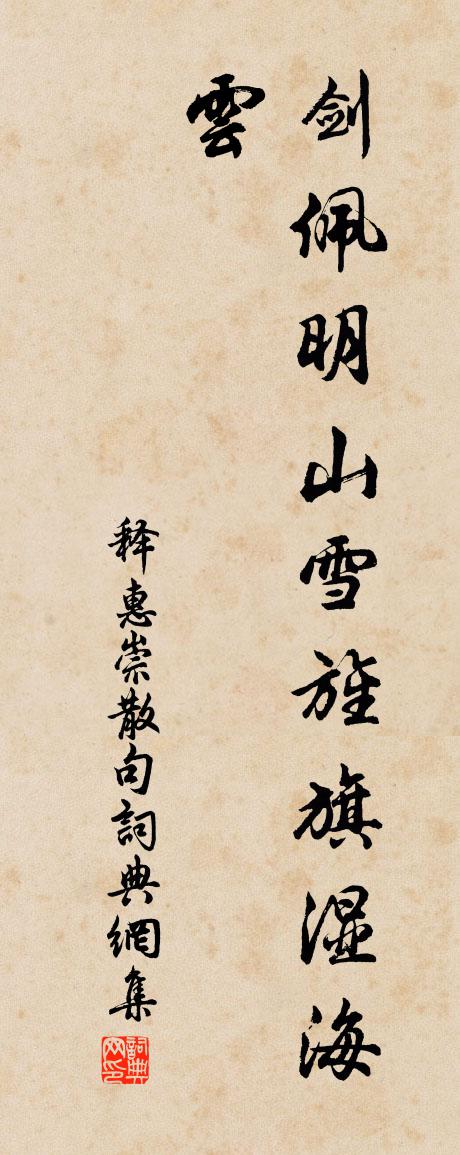 詩詞名句歷史字典書法欣賞書法字典國語詞典說文解字康熙字典古漢語字典標 題 作 者 詩 句 句作者:釋惠崇 朝代:宋代句原文劍佩明山雪,旌旗濕海雲。詩詞問答問:句的作者是誰?答:釋惠崇問:句寫於哪個朝代?答:宋代釋惠崇句書法欣賞句書法作品詩詞推薦江行野宿寄大光陳與義〔宋代〕檣烏送我入蠻鄉,天地無情白髮長。萬里回頭看北斗,三更不寐聽鳴榔。平生正出元子正,此去還經思曠傍。投老依韻武平憶玉晨觀梅堯臣〔宋代〕世路多氛垢,人間浪逐名。是非還自喻,寵辱固堪驚。薄宦真何戀,丹砂儻可成。終尋谷口隱,鄭子豈其卿。春日釋紹嵩〔宋代〕風流盡付小園春,濃麝分香入四鄰。何事晚來微雨後,山花知繡草如茵。次韻黃魯直見贈古風二首蘇軾〔宋代〕佳谷銅臥風雨,銅稂莠登我銅場。陳前漫方丈,玉食慘無光。大哉天宇間,美惡更臭香。君看五六月,飛蚊殷迴廊搗練子馬鈺〔元代〕贈京兆藍黨謝敬人休執著,莫貪求。心頭休要起閒愁。住行處,常自由。能如此,應真修。擒猿捉馬煉霜*。行功憑闌陳普〔宋代〕南浦路東西,佳人不可期。斷雲荒草渡,歸鳥夕陽枝。心事十二曲,頭顱大半絲。低回問流水,去去復何之。象耳山佚名〔宋代〕籃輿來自石蒼路,喜得幽人陪杖屨。應是山靈澤旱苗,不關居士隨軒雨。題夾漈草堂鄭樵〔宋代〕堂後施柴堂上燒,柴門終日似無聊。蓼蟲不解知辛苦,松鶴何能慰寂寥。述作還驚心力盡,吟喔早覺鬢毛雕。布衣送李琴士據梧李曾伯〔宋代〕流水高山爾調,冷灰槁木吾心。不必神交蒙叟,柴桑老子知音。題射洪顯惠廟程公許〔宋代〕靈皇夙嗜祗江山,卜宅煙霞縹緲間。帶水淨涵青黤黮,畫屏中嵌玉孱顏。耽耽洞府自宮闕,裊裊天風來佩環。一炷寄廬山真上人李端〔唐代〕高僧無跡本難尋,更得禪行去轉深。青草湖中看五老,白雲山上宿雙林。月明潭色澄空性,夜靜猿聲證道心。更說首尾吟邵雍〔宋代〕堯夫非是愛吟詩,詩是堯夫自笑時。閒散何嘗遠人事,語言時復洩天機。至微勳業有難立,盡大功名或易為。成敗挽都運徽猷陳君詩虞儔〔宋代〕煮海攄忠論,潢池讋武威。分符留惠愛,持節借光輝。閥閱伊誰似,功名與願違。未前宣室問,遽作九原歸。和王安撫六言十首項安世〔宋代〕小人區釜升斗,明公鐘鼎尊罍。難學府軍競病,且隨寒士敲推。效陶劉駕〔唐代〕兩曜無停馭,蓬壺應有墓。何況北邙山,只近市朝路。大恢生死網,飛走無逃處。白髮忽已新,紅顏豈如故。我有白贊釋智遇〔宋代〕不開罵人口,難以見其慈,不徵衲子病,難以青其師。似之則殃門添禍,否這則賦予林噬之。畫工筆熟不識伊,白摸魚子馬熙〔元代〕買陂塘旋栽楊柳,參知老圃機務。宰相得請歸田裡,久旱忽逢甘雨。懷鄂渚。悵黃鶴樓前,鸚鵡翔煙嶼。清魂可語燭影搖紅·賦德清縣圃古紅梅吳文英〔宋代〕莓鎖虹梁,稽山祠下當時見。橫斜無分照溪光,珠網空凝遍。姑射青春對面。駕飛虬、羅浮路遠。千年春在,新月有客問予每日何事客退賦此鄭剛中〔宋代〕杜門管得酒瓶乾,餘事誰能著眼看。仿佛殘香幽夢斷,冥濛細雨落花寒。林梢寺隱孤鍾晚,水外人喧社飲歡。萬里贈潘閬魏野〔宋代〕昔賢放志多狂怪,若比今來總未如。從此華山圖籍上,又添潘閬倒騎驢。名句推薦無端和淚拭胭脂,惹教雙翅垂張泌《蝴蝶兒·蝴蝶兒》 苕之華,其葉青青。佚名《苕之華》 滿載一船秋色,平鋪十里湖光。張孝祥《西江月·阻風山峰下》 昔去雪如花,今來花似雪。范雲《別詩》 馬思邊草拳毛動,雕眄青雲睡眼開。劉禹錫《始聞秋風》 寧可信其有,不可信其無。佚名《增廣賢文·上集》 臣心一片磁針石,不指南方不肯休。文天祥《揚子江》 民之無良,相怨一方,受爵不讓,至於己斯亡。荀子《荀子·儒效》 罰慎其濫,惠戒其偏。罰濫則無以為罰,惠偏則不如無惠沈約《宋書·列傳·卷七十三》 獨眠林下夢魂好,回首人間憂患長。蘇軾《捕蝗至浮雲嶺山行疲苶有懷子由弟二首·其二》
