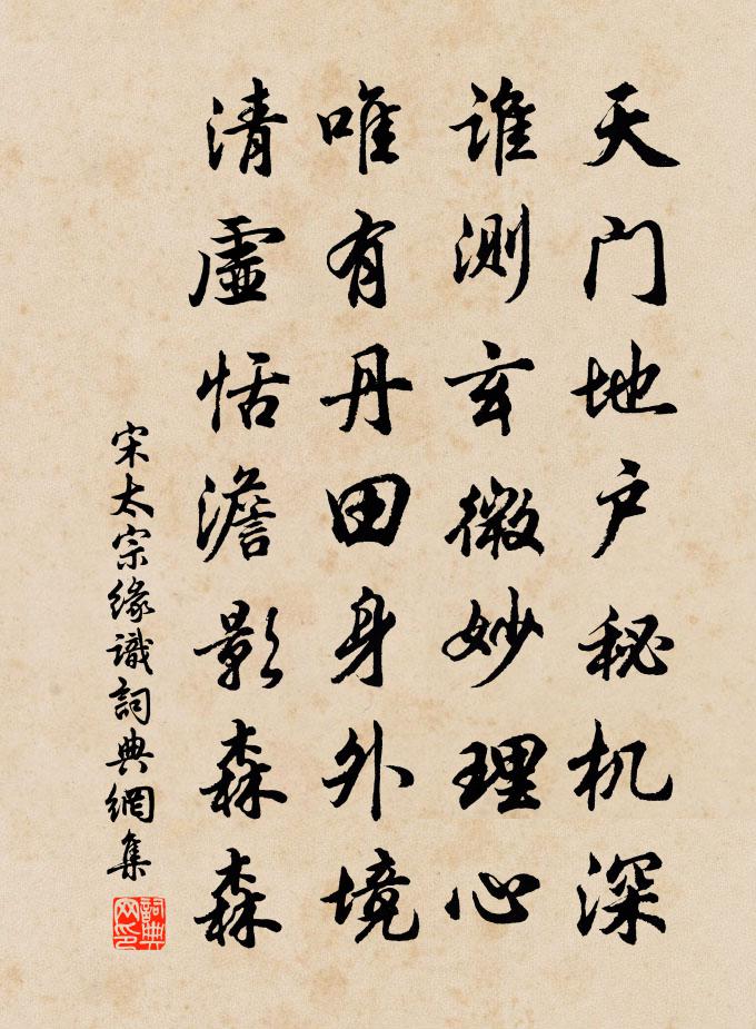 詩詞名句歷史字典書法欣賞書法字典國語詞典說文解字康熙字典古漢語字典標 題 作 者 詩 句 緣識作者:宋太宗 朝代:宋代緣識原文天門地戶秘機深,誰測玄微妙理心。唯有丹田身外境,清虛恬澹影森森。詩詞問答問:緣識的作者是誰?答:宋太宗問:緣識寫於哪個朝代?答:宋代宋太宗緣識書法欣賞緣識書法作品詩詞推薦金陵雜興二百首蘇泂〔宋代〕壓架荼醾百萬枝,月邊花下更漣漪。三更比屋皆高枕,如此清涼棄不知。雙松堂張舜民〔宋代〕嘆息前人布政優,手栽松竹助清幽。當年撥土人何在,今日捎雲勢未休。直幹幾排雷雨怒,細聲常伴管弦愁。若為和憂陸二祠書仲並〔宋代〕年來疏見驚人句,入手遽回如許春。幾日異科收異士,百年吾道付吾人。執鞭少也嘗求富,擊柝老來非為貧。寄語鷓鴣天室人降日以此奉寄魏初〔元代〕去歲今辰卻到家,今年相望又天涯。一春心事閒無處,兩鬢秋霜細有華。山接水,水明霞。滿林殘照見歸鴉。何時和端式十題幽谷泉司馬光〔宋代〕深谷窅無底,空聞泉水哀。時因秋日照,微見碧縈迴。谷里非人境,胡麻何處來。簡沖牆庵中故人曹勛〔宋代〕寄跡臨安久,思歸夕夢頻。愁多難強醉,病苦故禁人。夜短無清夢,年高嘆幻身。出中有道伴,雲壑擅余春。浪淘沙(和上元王仇香猷、含山邵梅仙有煥敘別)張榘〔宋代〕風色轉東南。翠擁層巒。杏花疏雨逗清寒。鍾阜石城何處是,煙靄漫漫。行旆已西關。一霎時間。芳樽聊復挽餘歡旅懷黃滔〔唐代〕蕭颯聞風葉,驚時不自堪。宦名中夜切,人事長年諳。古畫僧留與,新知客遇談。鄉心隨去雁,一一到江南。經費拾遺舊隱胡駢〔唐代〕林下茅齋已半傾,九華幽徑少人行。不將冠劍為榮事,只向煙蘿寄此生。松竹漸荒池上色,琴書徒立世間名。白楊扇子詩李石〔宋代〕三召三逐去之,老眼已不識路。偶然得個漁家,此是桃溪西渡。舟中李流謙〔宋代〕大小孤山專絕險,上中水府柄幽權。行人投栗船頭拜,小艇橫江來覓錢。春夜溫故六言二十首劉克莊〔宋代〕門前客已去矣,屋裡人安在哉。寒雀張羅可得,春燕銜泥不來。菩薩蠻馮延巳〔唐代〕金波遠逐行雲去,疏星時作銀河渡。花影臥鞦韆,更長人不眠。玉箏彈未徹,鳳髻黃釵脫。憶夢翠蛾低,微風吹繡題五泄瀑布四首喻良能〔宋代〕瀑雨霏霏濕翠嵐,來從天半許誰探。凌空踏盡崚嶒石,始到峰頭第一潭。以詩句詠梅老枝橫出數花新方蒙仲〔宋代〕荒山俄積玉,老蚌忽明珠。惟是據枯槁,年來一字無。漢宮曲二首韓翃〔唐代〕駿馬繡障泥,紅塵撲四蹄。歸時何太晚,日照杏花西。繡幕珊瑚鉤,春開翡翠樓。深情不肯道,嬌倚鈿箜篌。病中得樊大書白居易〔唐代〕荒村破屋經年臥,寂絕無人問病身。唯有東都樊著作,至今書信尚殷勤。輞川集二十首宮槐陌裴迪〔唐代〕門前宮槐陌,是向欹湖道。秋來山雨多,落葉無人掃。鳳池小飲鄧肅〔宋代〕愁見孤城萬馬屯,山行飄若出塵樊。臨池想鳳心皆妄,據檻觀魚道更尊。笑吸百川淋酒渴,旁看三峽倒詞源。人生戲彩堂前海棠楊萬里〔宋代〕露揉兩漬柳方濃,日曬風矄杏政烘。秪有海棠非旋染,粟來大小便鮮紅。名句推薦柔情似水,佳期如夢,忍顧鵲橋歸路。秦觀《鵲橋仙·纖雲弄巧》 君子安禮樂利,謹慎而無斗怒,是以百舉而不過也。荀子《荀子·臣道》 鳥銜野田草,誤入枯桑里。李白《樹中草》 月照城頭烏半飛,霜淒萬樹風入衣。李頎《琴歌》 若耶溪傍採蓮女,笑隔荷花共人語。李白《採蓮曲》 草色青青柳色黃,桃花歷亂李花香。賈至《春思二首·其一》 勝人者有力,自勝者強。老子《老子·道經·第三十三章》 今夜鄜州月,閨中只獨看。杜甫《月夜》 日暮蒼山遠,天寒白屋貧。劉長卿《逢雪宿芙蓉山主人》 以繩墨取木,則宮室不成矣。呂不韋《呂氏春秋·覽·離俗覽》