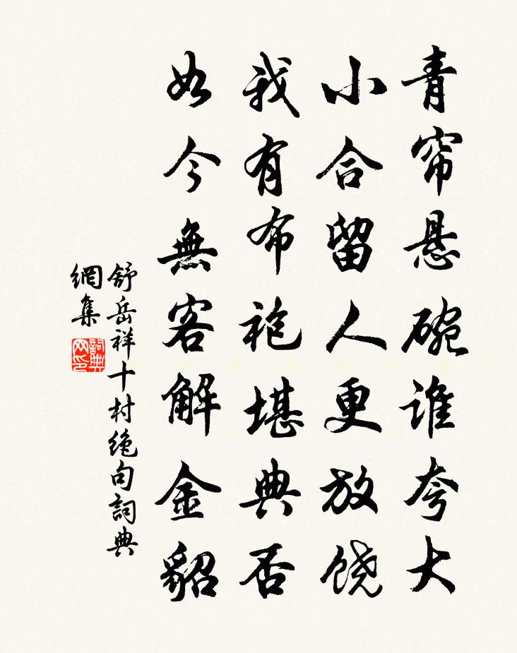 詩詞名句歷史字典書法欣賞書法字典國語詞典說文解字康熙字典古漢語字典標 題 作 者 詩 句 十村絕句作者:舒岳祥 朝代:宋代十村絕句原文青簾懸碗誰誇大,小合留人更放饒。我有布袍堪典否,如今無客解金貂。詩詞問答問:十村絕句的作者是誰?答:舒岳祥問:十村絕句寫於哪個朝代?答:宋代舒岳祥十村絕句書法欣賞十村絕句書法作品詩詞推薦次韻程機宜感懷曹勛〔宋代〕北塞草色黃,吹作邊風駛。惟公發蹤謀,莫並橫經士。【正宮】甘草子薛昂夫〔元代〕金鳳發,颯颯秋香,冷落在闌乾下。萬柳稀,重陽暇,看紅葉賞黃花。促織兒啾啾添瀟灑,陶淵明歡樂煞。耐冷迎秀山霜晴晚眺與趙賓暘黃惟月聯句方回〔宋代〕一峰何崢嶸,萬象翻匍匐。心包元氣並,影立太空獨。遙瞻極乾端,俯瞰際坤軸。飄飄凌雲身,杳杳送鴻目。揮袖上元夜效小庾體韓仲宣〔唐代〕他鄉月夜人,相伴看燈輪。光隨九華出,影共百枝新。歌鐘盛北里,車馬沸南鄰。今宵何處好,惟有洛城春。小桃王珪〔唐代〕小桃常憶破正紅,今日相逢二月中。自是粉闈人未識,莫因花晚笑春風。布袋贊釋師範〔宋代〕肉重千斤,智無半星。回頭轉腦,昧卻天真。一處尤堪笑,街頭等個人。我當時若見,只緩緩地向他道,謝三娘秤題壁二首福州僧〔宋代〕當初只欲轉頭銜,轉得頭銜轉不堪。何似仁王高閣上,倚欄閒唱望江南。謁金門·花滿院陳克〔宋代〕花滿院。飛去飛來雙燕。紅雨入簾寒不捲。曉屏山六扇。翠袖玉笙淒斷。脈脈兩娥愁淺。訊息不知郎近遠。一春長送廣信山長趙然明方回〔宋代〕宅本詞人傑,祠今學者宗。才華明斧藻,師範服章縫。竭力鑽書蠹,乘時補袞龍。勉旃企鄉達,徽國荷堯封。漁父吳鎮〔元代〕紅葉村西夕照餘。黃蘆灘畔月痕初。輕撥棹,且歸歟。掛起漁竿不釣絕賊臣胡謙光閻爾梅〔清代〕賊臣不自量,稱予是故人。敢以書招予,冀予與同塵。一笑置弗答,蕭然湖水濱。湖水經霜碧,樹光翠初勻。妻子同元使君舂陵行杜甫〔唐代〕遭亂髮盡白,轉衰病相嬰。沈綿盜賊際,狼狽江漢行。嘆時藥力薄,為客羸瘵成。吾人詩家秀,博採世上名。粲粲答李任道謝分豆粥黃庭堅〔宋代〕豆粥能驅晚瘴寒,與公同味更同餐。安知天上養賢鼎,且作山中煮菜看。游洞霄釋法照〔宋代〕天柱華心結蕊宮,翠蛟飛玉滾溪風。岩生洞穴非人世,不到那知造化功。次韻子瞻將之吳興贈孫莘老蘇轍〔宋代〕宦遊莫向長城窟,冬冰折膠弦亦絕。吳中臘月百事便,蟹煮黃金鱸會雪。京城舊友一分散,近憶吳興須滿頰。世游金山寄揚州鮮于子駿從事邵光蘇轍〔宋代〕揚州望金山,隱隱大如幞。朅來長江上,孤高二千尺。僧居厭山小,面面貼蒼石。虛樓三百間,正壓江潮白。清風促漏李商隱〔唐代〕促漏遙鍾動靜聞,報章重疊杳難分。舞鸞鏡匣收殘黛,睡鴨香爐換夕熏。歸去定知還向月,夢來何處更為雲。南塘贈外科醫者熊禾〔宋代〕男兒踏地誌四方,出門大路行康莊。況為馹使期令速,千里萬里瞬息將。雲胡邂逅遭一跌,頗覺平陸成羊腸。古雲雜興鄭剛中〔宋代〕不似張蒼作瓠肥,衰顏折發就昏痴。近來終日扃柴戶,靜盾微風過竹枝。視旱憩鏡田店楊萬里〔宋代〕走檄堪頻捧,嚴程敢少徐。雖晴恐非久,猶熱未全無。憩息翻增倦,馳驅減壯圖。詩成兼利害,失悶得清臞。名句推薦聖人之治民也,先治者強,先戰者勝。韓非及後人《韓非子·心度》 峨嵋山下少人行,旌旗無光日色薄。白居易《長恨歌》 立身成敗,在於所染吳兢《貞觀政要·卷十·論慎終》 思其艱以圖其易佚名《尚書·周書·君牙》 殷勤昨夜三更雨,又得浮生一日涼。蘇軾《鷓鴣天·林斷山明竹隱牆》 林斷山明竹隱牆。亂蟬衰草小池塘。蘇軾《鷓鴣天·林斷山明竹隱牆》 酷憐嬌易散,燕子學偎紅。納蘭性德《臨江仙·絲雨如塵雲著水》 晝短苦夜長,何不秉燭游!佚名《生年不滿百》 分明小像沉香縷,一片傷心欲畫難。納蘭性德《於中好·送梁汾南還為題小影》 思親堂上茱初插,憶妹窗前句乍裁。秋瑾《九日感賦》