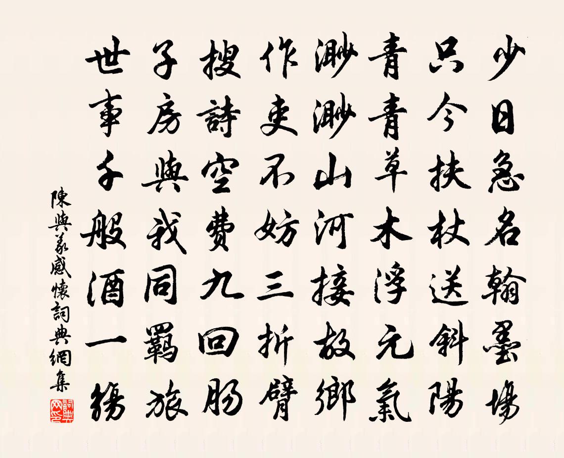 詩詞名句歷史字典書法欣賞書法字典國語詞典說文解字康熙字典古漢語字典標 題 作 者 詩 句 感懷作者:陳與義 朝代:宋代感懷原文少日急名翰墨場,只今扶杖送斜陽。青青草木浮元氣,渺渺山河接故鄉。作吏不妨三折臂,搜詩空費九迴腸。子房與我同羈旅,世事千般酒一觴。詩詞問答問:感懷的作者是誰?答:陳與義問:感懷寫於哪個朝代?答:宋代問:陳與義的名句有哪些?答:陳與義名句大全陳與義感懷書法欣賞感懷書法作品詩詞推薦次韻謝王君方回〔宋代〕妙年富才藻,亹亹迫淵雲。逸勢波瀾闊,神功混沌分。百為爭細故,一笑付微醺。天地江河在,終垂萬古文。規禪停雲齋陳師道〔宋代〕淨居眾天人,宮殿隨所適。少仕老不歸,重門閉榛棘。道人秀叢林,妙語出禪寂。是身如浮雲,隨處同建立。平生內集閣鄧深〔宋代〕畫閣深明雪壓冬,團欒宴常酒樽同。獸爐香霧辟寒氣,翠幙妓圍回暖風。起絮撒鹽酬唱外,清歌妙舞笑談中。寧無六言五首為倉部弟壽劉克莊〔宋代〕幼道一生第五,文淵萬里建侯。假令加驃騎號,何如騎款段游。題象鼻岩張汝鍇〔宋代〕曾入蒼舒萬斛舟,至今鼻準蘸清流。君玉玉輅催行駕,安得身閒伴白鷺。睡鴨黃庭堅〔宋代〕山雞照影空自愛,孤鸞舞鏡不作雙。天下真成長會合,兩鳧相倚睡秋江。早起偶成仲並〔宋代〕晨光起天末,微風動林杪。披衣初夢回,卷書卷清曉。隱几欲無寐,百念自憂悄。簞瓢舊獨樂,樂意今亦少。豈但宿閶門范成大〔宋代〕五更潮落水鳴船,霜送新寒到枕邊。報導霧收紅日上,野翁猶蓋短篷眠。聞侯方兒來寇慧偘〔唐代〕羊皮贖去士,馬革斂還屍。天下方無事,孝廉非哭時。好離鄉 余隱居崑崙山清神洞。常習不睡。因王丹桂〔元代〕溜半溶,似乎有聲。俄然而起,出戶視之,四圍山色,盡為更變。因倚松而作是詞坐久欲朧晴。不覺天公祥瑞呈。元豐壬戌歲暮書事楊時〔宋代〕閩陬地力盡,種藝被山谷。涵濡一雨潤,鬱郁原野綠。春風忽雲徂,舒景變炎燠。涼飈動地軸,揫斂何神速。坐愁蕭灑桐廬郡十絕范仲淹〔宋代〕蕭灑桐廬郡,嚴陵舊釣台。江山如不勝,光武肯教來。詠練川王子昭〔宋代〕吳淞江上流來水,鴨綠粼粼漾清泚。東風無力藹清光,一片縠紋吹不起。夜來雨漲三尺深,鵁鶄鸂鶒爭浮沉。芹芽浣溪沙(賦春雪追和東坡韻四首)王之道〔宋代〕陽氣初升土脈蘇。東郊人散欲回車。一時春雪十年無。魚枕蕉深浮酒蟻,鹿胎冠子粲歌珠。題詩不覺燭然須。風入松沈禧〔元代〕溪山如洗雨才乾。蘆荻暗江湍。沙明水碧嵐光淨,似丹青、圖畫宜看。風卷浪花翻雪,□飄金粉生寒。老翁終日把生公講堂何麟〔宋代〕平地涌岩壑,稜層驚大雄。何曾遠人世,直欲傍天宮。 * 威靈在,赤烏緣影空。生公能說法,音與塔鈴同。賦得聽邊鴻白居易〔唐代〕驚風吹起塞鴻群,半拂平沙半入雲。為問昭君月下聽,何如蘇武雪中聞?觀放魚歌盧仝〔唐代〕常州賢刺史,從諫議大夫除。天地好生物,刺史性與天地俱。見山客,狎魚鳥。坐山客,北亭湖。命舟人,駕舫子醉落魄/一斛珠張炎〔宋代〕柳侵闌角。畫簾風軟紅香泊。引人蝴蝶翻輕薄。已自關情,和夢近來惡。眉梢輕把閒愁著。如今愁重眉梢弱。雙眉清明日青龍寺上方賦得多字皇甫冉〔唐代〕上方偏可適,季月況堪過。遠近水聲至,東西山色多。夕陽留徑草,新葉變庭柯。已度清明節,春秋如客何。名句推薦可憐日暮嫣香落,嫁與春風不用媒。李賀《南園十三首》 嗚呼!楚雖三戶能亡秦,豈有堂堂中國空無人陸游《金錯刀行》 旦別河橋楊柳風,夕臥伊川桃李月。宋之問《寒食還陸渾別業》 數枝門柳低衣桁,一片山花落筆床。岑參《山房春事二首》 且夫義者,政也。無從下之政上,必從上之政下。墨子《墨子·26章 天志(上)》 霜風搗盡千林葉,閒倚筇枝數鸛巢。范成大《冬日田園雜興》 兒童強不睡,相守夜歡嘩。蘇軾《守歲》 己欲立而立人,己欲達而達人。孔子弟子《論語·雍也篇》 美色不同面,皆佳於目;悲音不共聲,皆快於耳王充《論衡·卷三十·自紀篇》 鳥宿池邊樹,僧敲月下門。賈島《題李凝幽居》
