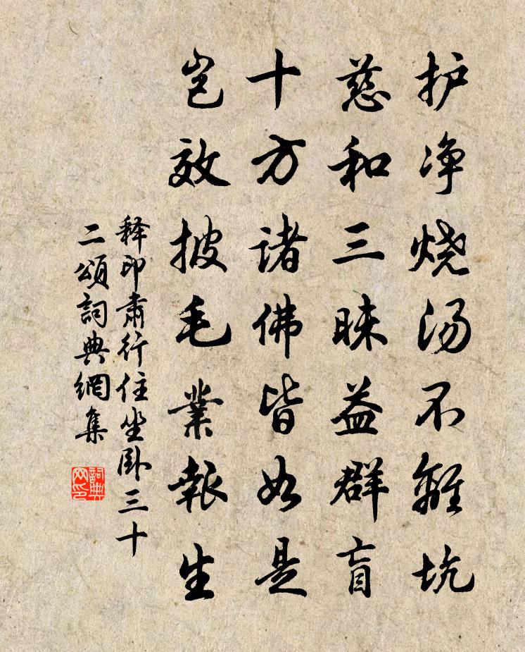 詩詞名句歷史字典書法欣賞書法字典國語詞典說文解字康熙字典古漢語字典標 題 作 者 詩 句 行住坐臥三十二頌作者:釋印肅 朝代:宋代行住坐臥三十二頌原文護淨燒湯不離坑,慈和三昧益群盲。十方諸佛皆如是,豈效披毛業報生。詩詞問答問:行住坐臥三十二頌的作者是誰?答:釋印肅問:行住坐臥三十二頌寫於哪個朝代?答:宋代釋印肅行住坐臥三十二頌書法欣賞行住坐臥三十二頌書法作品詩詞推薦餘乾史子固本知縣趨朝便舟見訪以四絕句敘舊曹彥約〔宋代〕再拜新篇極主臣,詠真何必更尋真。論心十八年前事,詩律交情更可人。謝劉相寄天柱茶薛能〔唐代〕兩串春團敵夜光,名題天柱印維揚。偷嫌曼倩桃無味,搗覺嫦娥藥不香。惜恐被分緣利市,盡應難覓為供堂。粗官四月十五日飯於因勝吳則禮〔宋代〕老子端有衲子緣,獨喜時時聽三下。莫向諸方說久參,白頭且結淮南夏。夜雨元稹〔唐代〕水怪潛幽草,江雲擁廢居。雷驚空屋柱,電照滿床書。竹瓦風頻裂,茅檐雨漸疏。平生滄海意,此去怯為魚。郊園即事寄蕭侍郎(一作呈蕭常州復)戴叔倫〔唐代〕衰鬢辭餘秩,秋風入故園。結茅成暖室,汲井及清源。鄰里桑麻接,兒童笑語喧。終朝非役役,聊寄遠人言。頌古釋道顏〔宋代〕風頭稍硬難安立,暖氣才通瞌睡來。卻笑明招閒費力,無端兩處強差排。出山追術所見張鎡〔宋代〕我家正對風煙住,飽看陰晴變朝暮。清秋非但入詩脾,挽向溪山深處去。溪山深處是湖州,水合雲凝不斷頭。曬稻一百五日同周越陳永錫游吉祥僧舍穆修〔宋代〕痛飲方期數百杯,尋芳何事又空回。花愁酒困春無著,卻訪野僧蕭寺來。游定林寺即荊公讀書處四首楊萬里〔宋代〕蹈月敲門訪病夫,問來還是雪堂蘇。不知把燭高談許,曾舉烏台詩帳無。大理正任二十和江淹擬古詩二十章寄示無可〔唐代〕不啻回青眼,應疑似碧雲。古風真往哲,雅道濫朝聞。活獄威豪右,銷時賴典墳。如何經濟意,未克致吾君。郊廟朝會歌辭紹熙元年恭上壽星聖皇太后至尊佚名〔宋代〕玉璽瑤編,禮容畢具。穆穆至尊,華殿是御。德配有虞,紹唐授禹。於萬斯年,受天之祜。劉邦直送早梅水仙花四首黃庭堅〔宋代〕簸船綪纜北風嗔,霜落千林憔悴人。欲問江南近訊息,喜君貽我一枝春。衢右道中喻良能〔宋代〕漸喜家居近,相望六驛間。脫身江左役,洗眼浙東山。鄉味初充饌,慈闈亦破顏。經過縠溪水,應笑鬢毛斑。龍游寺南屏軒和宋寵父韻李新〔宋代〕平日江乾過,南屏首重回。不妨圖里見,曾是夢中來。近市樓台逼,高城鼓角催。老年知涉世,臨事卻銜枚。倉部弟生日五絕劉克莊〔宋代〕爵並開鄉邑,官皆視大蓬。年齒高略似,鬚髮黑難同。宴清都·初春盧祖皋〔宋代〕春訊飛瓊管。風日薄、度牆啼鳥聲亂。江城次第,笙歌翠合,綺羅香暖。溶溶澗淥冰泮。醉夢裡、年華暗換。料黛大熱五首 其五戴復古〔宋代〕天嗔吾面白,曬作鐵色深。天能黑我面,豈能黑我心。我心有冰雪,不受暑氣侵。推去北窗枕,思鼓南風琴。千古詠竹徐庭筠〔宋代〕不論台閣與山林,愛爾豈惟千畝陰。未出土時先有節,便凌雲去也無心。葛陂始與龍俱化,嶰谷聊同鳳一吟。月朗望江南楊無咎〔宋代〕鍾陵好,和氣滿江城。憶昨旌麾初至止,到今政令只寬平。仍歲兆豐登。稱慶旦,遐邇一般情。共信我公躋壽考,慶壽寺 其一王冕〔元代〕寶剎都城內,今朝曠野中。浮圖瞻寶志,書記憶劉聰。畫屋煙花繞,青松雨露濃。徘徊增感慨,歷落問英雄。名句推薦把酒祝東風,且共從容。歐陽修《浪淘沙·把酒祝東風》 欲寫彩箋書別怨。淚痕早已先書滿。晏幾道《蝶戀花· * 開時傷聚散》 軍合力不齊,躊躇而雁行。曹操《蒿里行》 積學以儲寶,酌理以富才劉勰《文心雕龍·神思》 及茲春未深,數畝猶足佃。王守仁《謫居糧絕請學於農將田南山詠言寄懷》 大鵬一日同風起,扶搖直上九萬里。李白《上李邕》 何處望神州?滿眼風光北固樓。辛棄疾《南鄉子·登京口北固亭有懷》 蜀江水碧蜀山青,聖主朝朝暮暮情。白居易《長恨歌》 山寺月中尋桂子,郡亭枕上看潮頭。白居易《憶江南·江南憶》 明月照高樓,流光正徘徊。曹植《七哀》