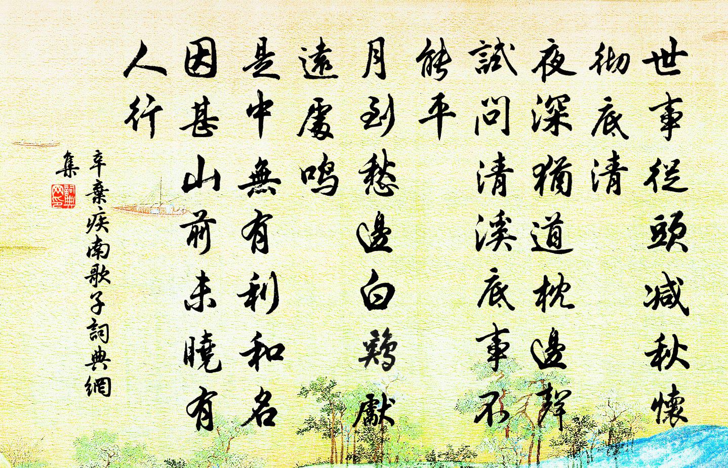 詩詞名句歷史字典書法欣賞書法字典國語詞典說文解字康熙字典古漢語字典標 題 作 者 詩 句 南歌子作者:辛棄疾 朝代:宋代南歌子原文世事從頭減,秋懷徹底清。夜深猶道枕邊聲。試問清溪底事、不能平。月到愁邊白,雞先遠處鳴。是中無有利和名。因甚山前未曉、有人行。詩詞問答問:南歌子的作者是誰?答:辛棄疾問:南歌子寫於哪個朝代?答:宋代問:南歌子是什麼體裁?答:詞問:辛棄疾的名句有哪些?答:辛棄疾名句大全辛棄疾南歌子書法欣賞南歌子書法作品詩詞推薦七夕韓元吉〔宋代〕銀河翻浪拍空流,玉女停梭清露秋。天上一年真一日,人間風月自生愁。雪中尋梅陸游〔宋代〕幽香淡淡影疏疏,雪虐風饕亦自如。正是花中巢許輩,人間富貴不關渠。雪九首傅察〔宋代〕天公亦戲人,奇幻驚倏忽。朝來檐霤間,一一綴明月。浣溪沙·楊柳千條送馬蹄納蘭性德〔清代〕楊柳千條送馬蹄,北來征雁舊南飛,客中誰與換春衣。終古閒情歸落照,一春幽夢逐遊絲,信回剛道別多時。朝南以詩送巴石研屏香幾用韻香幾洪咨夔〔宋代〕玉版橫陳醉眼邊,尚余金鴨水沉煙。客窗寂寂那消得,祗有南豐一瓣緣。送楊仲博歸蜀魏了翁〔宋代〕江頭送客雪初晴,木葉脫盡山空明。天高地迥著行客,昂昂野鶴相似清。曉空霜唳三兩聲,扶木枝上陽烏驚。豈無早春即事呈劉員外楊巨源〔唐代〕明朝晴暖即相隨,肯信春光被雨欺。且任文書堆案上,免令杯酒負花時。馬蹄經歷須應遍,鶯語叮嚀已怪遲。更待蘭錢時〔宋代〕繞亭埋石種蘭芽,生怕花開不在家。此日溶溶春滿院,柔風初破一枝花。夢中詠醉人蘇轍〔宋代〕城中醉人舞連臂,城外醉人相枕睡。此人心中未必空,暫爾頹然似無事。我生從來不解飲,終日騰騰少憂累。昔年金陵雜興二百首蘇泂〔宋代〕城西二里楚金陵,吳帝名為石首城。如今土塢無青草,笑殺當時所必爭。滿江紅吳潛〔宋代〕“對一川平野,數間茅屋”九字分韻,以餞行色,蓋反騷也。余得對字,就賦。把手西園,有山色、波光相對。金送薛經李覯〔宋代〕多能未必有相知,況是東南義士稀。京洛路長何日到,風塵依書化人衣。再用前韻贈高司理共八首陳造〔宋代〕帥幕群才賴激揚,衰遲猶喜後升堂。雷封局縮聊償債,袞字褒嘉但寸長。再試真成不龜藥,九言終佩辟邪香。龍門奉送杜中丞赴洪州暢當〔唐代〕詔出鳳凰宮,新恩連帥雄。江湖經戰陣,草木待仁風。豪右貪威愛,紆繁德簡通。多慚君子顧,攀餞路塵中。登泰山二首陳夢良〔宋代〕何處鸞笙鳳管清,覺來身世在蓬瀛。龜蒙島嶧爭趨勢,恆霍嵩華共仰兄。封禪幸無書獻納,洞天尚有路通名。自慚詩二首釋惟謹〔宋代〕看了青燈夢不成,東風混雪落寒聲。半生客里無窮恨,告訴梅花說到明。玉女搖仙輩王哲〔元代〕終南一遇,醴邑相蓬,兩次凡心蒙滌。便話修持,重談調攝,莫使暗魔偷滴。養氣全神寂。稟消遙自在,閒閒遊歷寄鄧道士蘇軾〔宋代〕一杯羅浮春,遠餉採薇客。遙知獨酌罷,醉臥松下石。幽人不可見,清嘯聞月夕。聊戲庵中人,空飛本無跡。西軒寓居陳與義〔宋代〕牢落西軒客,巡檐費獨吟。桃花明薄暮,燕子鬧微陰。辛苦元吾事,淹留更此心。小窗隨意寫,蛇蚓起相尋。侍宴長寧公主東莊應制李嶠〔唐代〕別業臨青甸,鳴鸞降紫霄。長筵鵷鷺集,仙管鳳皇調。樹接南山近,煙含北渚遙。承恩鹹已醉,戀賞未還鑣。名句推薦騎牛遠遠過前村,短笛橫吹隔隴聞。黃庭堅《牧童詩》 海上生明月,天涯共此時。張九齡《望月懷遠》 黃昏院落,淒悽惶惶,酒醒時往事愁腸。李清照《行香子·天與秋光》 飛鴻過也。萬結愁腸無晝夜。蔣氏女《減字木蘭花·題雄州驛》 欲持一瓢酒,遠慰風雨夕。韋應物《寄全椒山中道士》 四月南風大麥黃,棗花未落桐葉長。李頎《送陳章甫》 又有牆頭千葉桃,風動落花紅蔌蔌。元稹《連昌宮詞》 千山鳥飛絕,萬徑人蹤滅。柳宗元《江雪》 狎浪兒童,橫江士女,笑指漁翁一葉輕。吳偉業《沁園春·觀潮》 問弄雪飄枝,無雙亭上,何日重遊。鄭覺齊《揚州慢·瓊花》