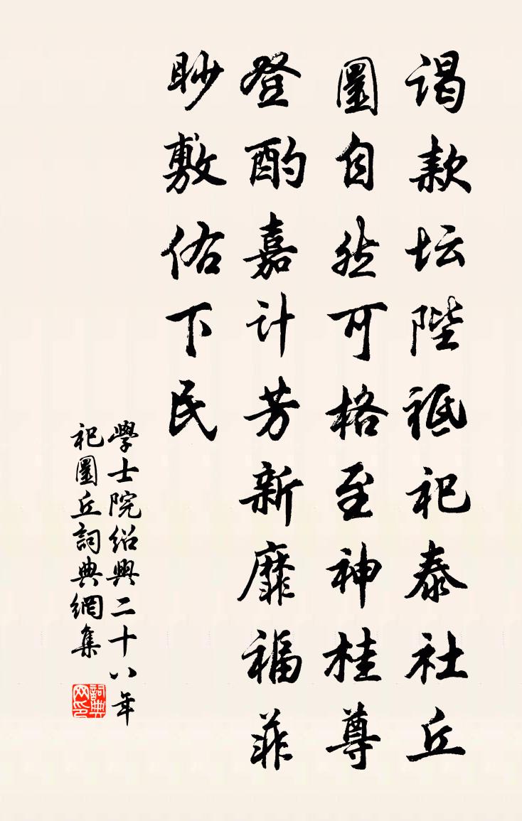 詩詞名句歷史字典書法欣賞書法字典國語詞典說文解字康熙字典古漢語字典標 題 作 者 詩 句 紹興二十八年祀圜丘作者:學士院 朝代:宋代紹興二十八年祀圜丘原文謁款壇陛,祗祀泰社。丘圜自然,可格至神。桂尊登酌,嘉計芳新。靡福菲眇,敷佑下民。詩詞問答問:紹興二十八年祀圜丘的作者是誰?答:學士院問:紹興二十八年祀圜丘寫於哪個朝代?答:宋代學士院紹興二十八年祀圜丘書法欣賞紹興二十八年祀圜丘書法作品詩詞推薦離騷屈原〔先秦〕帝高陽之苗裔兮,朕皇考曰伯庸;攝提貞於孟陬兮,惟庚寅吾以降;皇覽揆余於初度兮,肇錫余以嘉名;名余曰正辭世頌釋寶曇〔宋代〕平生灑灑落落,末後哆哆啝啝。殷勤覓一把火,莫教辜負澄波。姚江釋曇瑩〔宋代〕沙尾鱗鱗水退潮,柳行出沒見漁樵。客船自載鐘聲去,落日殘僧立寺橋。琵琶亭周弼〔宋代〕蕭蕭楓林青,要出間椅檟。尚思送行舟,系此木葉下。雲開星垂山,水盪月在野。江空夜棖棖,淚復誰滿把。汀洲陪王員外北樓宴待月獨孤及〔唐代〕勸酒論心夜不疲,含情有待問誰思。佇看晴月澄澄影,來照江樓酩酊時。文公故居有懷方回〔宋代〕慷慨懷人獨倚樓,定應故國此神遊。共知道派傳洙灑,猶覺文星貫鬥牛。八佾舞移誰有魯,兩楹夢斷已無周。先生曝書袁說友〔宋代〕紅日庭初熭,青編手自摩。烏踆浮竹簡,魚蠹眩陽和。眼恨頻催老,書慚未觸多。相看不相棄,同老故山阿。挽林侍郎二首劉克莊〔宋代〕玉殿龍墀元會日,千官拜舞奉堯樽。問周大老今安在,嘆魯靈光尚獨存。次對職清褒橐從,中書君禿愧□□。自憐即席送江夏茂才林逋〔宋代〕與君未別且酣飲,別後令人空倚樓。一點風帆若為望,海門平闊鷺濤秋。送知殿釋慧空〔宋代〕西天鬍子沒髭鬚,南北禪和苦覓渠。合眼相逢開眼笑,君山點破洞庭湖。頤齋聯日有事於琛亭賦詩聊為解嘲胡仲弓〔宋代〕詩人有公事,日日走琛亭。紫翠和衣重,香塵滿面生。蚌還江月濕,龍起浪雲腥。薏苡亦何有,奚囊澈底清。孫殿帥從魏公出師汪元量〔宋代〕我宋麒麟閣,公當向上名。出師休背主,誓死莫偷生。社稷逢今日,英雄在此行。忽為兒女態,一笑欲傾城。奉陪顏使君修《韻海》畢,東溪泛舟餞諸文士皎然〔唐代〕諸侯崇魯學,羔雁日成群。外史刊新韻,中郎定古文。菁華兼百氏,縑素備三墳。國語思開物,王言欲致君。研精戊辰元日到南華詩朱翌〔宋代〕清曉匆匆賀歲歸,又隨微雨渡曹溪。禱晴原見五色羽,揭戶方占一日雞。沙水半搖新略彴,雲煙深護古伽黎。曹源予初到筠即於酒務庭中種竹四叢杉二本及今三蘇轍〔宋代〕種竹成叢杉出檐,三年慰我病厭厭。剪除亂葉風初好,封植孤根筍自添。高節不知塵土辱,堅姿試待雪霜沾。屬君謁蔣帝祠過鐘山下二首張耒〔宋代〕溶溶野水戲鳧鷖,壟麥初長午景遲。盡日綠楊閒照水,臨風自愛好腰支。秋醉歌張為〔唐代〕金風颯已起,還是招漁翁。攜酒天姥岑,自彈嶧陽桐。脫卻登山履,赤腳翹青筇。泉聲掃殘暑,猿臂攀長松。翠微題嵩山逸人元丹丘山居李白〔唐代〕家本紫雲山,道風未淪落。沉懷丹丘志,沖賞歸寂寞。朅來游閩荒,捫涉窮禹鑿。夤緣泛潮海,偃蹇陟廬霍。憑雷蟹井陳藻〔宋代〕此山鰲不動,此井蟹如何。小阜為拳石,晴田看盡波。俯知雲障下,卻放日輪過。一上一回首,層層眼界多。戲題酒家壁陸游〔宋代〕漫道江南倚寺樓,豈如煙雨弄扁舟。並刀不翦清愁斷,楚練難縻白日留。湖上采菰甘似蜜,街頭買酒滑如油。金丹名句推薦借得山東煙水寨,來買鳳城春色施耐庵《念奴嬌·天南地北》 荷芰風輕簾幕香,繡衣鸂鶒泳回塘,小屏閒掩舊瀟湘。顧敻《浣溪沙·荷芰風輕簾幕香》 善將者,其剛不可折,其柔不可卷,故以弱制強,以柔制剛。諸葛亮《將苑·卷一·將剛》 我有功於人不可念,而過則不可不念;人有恩於我不可忘,而怨則不可不忘。洪應明《菜根譚·概論》 餘霞散成綺,澄江靜如練。謝朓《晚登三山還望京邑》 芳洲拾翠暮忘歸,秀野踏青來不定。張先《木蘭花·乙卯吳興寒食》 皎皎窗中月,照我室南端。潘安《悼亡詩三首》 春風旍旗擁萬夫,幕下諸將思草枯。黃庭堅《送范德孺知慶州》 故國神遊,多情應笑我,早生華髮。蘇軾《念奴嬌·赤壁懷古》 山雪河冰野蕭瑟,青是烽煙白人骨。杜甫《悲青坂》