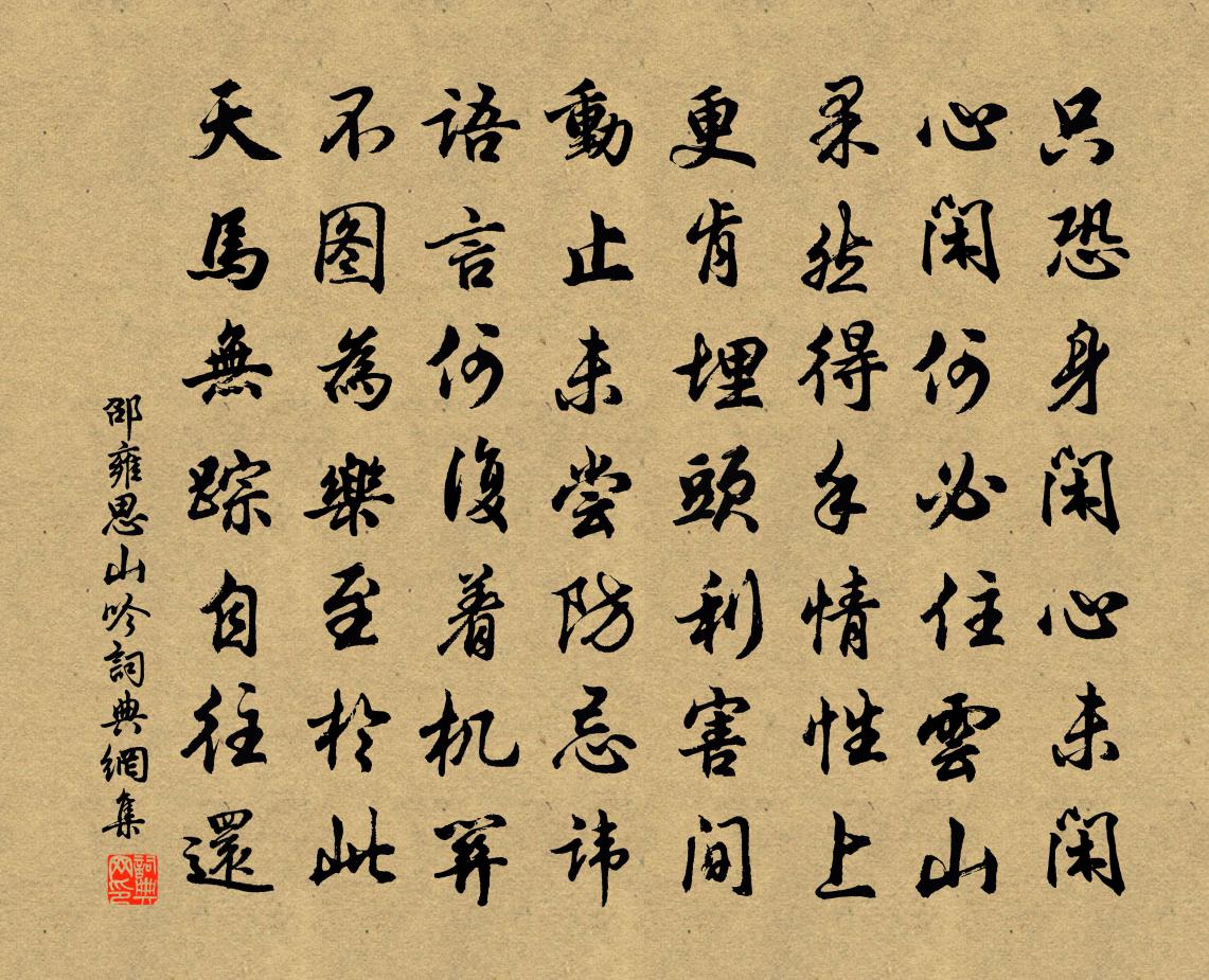 詩詞名句歷史字典書法欣賞書法字典國語詞典說文解字康熙字典古漢語字典標 題 作 者 詩 句 思山吟作者:邵雍 朝代:宋代思山吟原文只恐身閒心未閒,心閒何必住雲山,果然得手情性上,更肯埋頭利害間。動止未嘗防忌諱,語言何復著機關。不圖為樂至於此,天馬無蹤自往還。詩詞問答問:思山吟的作者是誰?答:邵雍問:思山吟寫於哪個朝代?答:宋代邵雍思山吟書法欣賞思山吟書法作品詩詞推薦季父知并州梅堯臣〔宋代〕捧詔出明光,飛軒陟太行。玉墀分近侍,虎綬給新章。笳吹喧行陌,旌旗卷夜霜。雁歸汾水綠,城壓代雲黃。土屋點絳唇(贈別李唐卿)廖行之〔宋代〕秋興連天,又還不分秋光老。蓴鱸猶好。莫落秋歸後。有底從人,上馬皆東首。君知否。陽關三奏。消黯情多少。次韻謝公定王世弼贈答二絕句黃庭堅〔宋代〕酒因咀嚼還知味,詩就呻吟不要工。王謝風流看二妙,病夫直欲臥牆東。臨江仙·千里長安名利客劉彤〔宋代〕千里長安名利客,輕離輕散尋常。難禁三月好風光。滿階芳草綠,一片杏花香。記得年時臨上馬,看人眼淚汪汪。讀禪經白居易〔唐代〕須知諸相皆非相,若住無餘卻有餘。言下忘言一時了,夢中說夢兩重虛。空花豈得兼求果,陽焰如何更覓魚。攝動愛山堂趙蕃〔宋代〕朝從日掛鉦,暮至月吐璧。坐得少文圖,不資康樂屐。贈趙當可王灼〔宋代〕晚交得王孫,每見心輒醉。平生虎豹韜,近者詩酒累。流光迫壯懷,撫事我亦欷。不如從君飲,此外談無味。次韻黃魯直效進蘇軾〔宋代〕士作歲寒知松柏詩龍蟄雖高臥,雞鳴不廢時。炎涼徒自變,茂悅兩相知。已負棟樑質,肯為兒女姿。那憂霜貿貿,陪西山游鼓山一首劉克莊〔宋代〕先生廊廟姿,非直藩翰才。南州彩旗留,北闕丹詔催。重臣方暑行,停驂小裴回。客中載枚鄒,物外尋宗雷,遂窮趙宗道歸輦下胡宿〔唐代〕沿牒相逢楚水湄,竹林文酒此攀嵇。半氈未暖還傷別,一臂初交又解攜。江浦嘔啞風送櫓,河橋勃窣柳垂堤。明年句趙師民〔宋代〕露台枉惜千金費,卻把銅山錫幸臣。答從叔愈韓湘〔唐代〕舉世都為名利醉,伊予獨向道中醒。他時定是飛升去,衝破秋空一點青。雨師雷神七首佚名〔宋代〕作解之德,形聲一兮。爰展獻侑,酌則三兮。我興有假,雲胡有私。下土是冒,庶其遠而。木狀元惠示近詩一卷作詩為謝喻良能〔宋代〕洪都通守詞華溢,漢殿文章元第一。萬卷落落蟠胸中,三江袞袞懸吟筆。贈我玉佩聯玦環,未數大鵬兼小山。欲知過田家宅杜牧〔唐代〕安邑南門外,誰家板築高。奉誠園裡地,牆缺見蓬蒿。白鹿寺劉克莊〔宋代〕歲晚霜林落葉稠,攜家來作鹿門游。偈言恍似前生說,詩稾猶煩侍者收。身上征衫拋未得,山中靈藥采無由。十年次以道韻寄范子夷子默黃庭堅〔宋代〕鼓缶多秦聲,琵琶作胡語。是中非神奇,根器如此故。范公秉文德,斷國極可否。至今筦樞機,大度而少與。蟬嫣次韻知縣三兄蘇泂〔宋代〕楊柳依依萬縷絲,梅花無計與扶衰。十分酒滿悶如昨,一半春休雨未知。安得詩書成保社,略容岩壑有心期。扁舟念奴嬌·斷虹霽雨黃庭堅〔宋代〕八月十七日,同諸生步自永安城樓,過張寬夫園待月。偶有名酒,因以金荷酌眾客。客有孫彥立,善吹笛。援筆作仙岩行白玉蟾〔宋代〕醉攜七尺霜前行,雲錦山前灣幾曲。溪頭秋雨添寒綠,蛟龍冷浸一壺玉。蓼花錦岸紅欲流,稻田高下鋪棋局。碧岩名句推薦寒波淡淡起,白鳥悠悠下。元好問《潁亭留別》 長風破浪會有時,直掛雲帆濟滄海。李白《行路難·其一》 中山人予之貓,貓善捕鼠及雞。劉基《乞貓》 一年三百六十日,多是橫戈馬上行。戚繼光《馬上作》 涓涓不壅,終為江河佚名《孔子家語·觀周》 吞舟之魚,陸處則不勝螻蟻呂不韋《呂氏春秋·覽·審分覽》 平皋行雁下,曲渚雙鳧出。崔元翰《奉和聖制重陽旦日百寮曲江宴示懷》 順天者存,逆天者亡。孟子《孟子·離婁章句上·第七節》 天時人事日相催,冬至陽生春又來。杜甫《小至》 何因不歸去?淮上有秋山。韋應物《淮上喜會梁川故人 / 淮上喜會梁州故人》