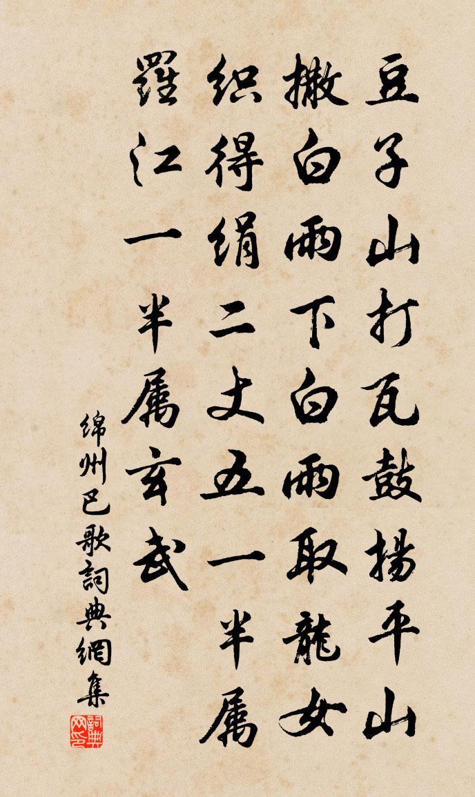 詩詞名句歷史字典書法欣賞書法字典國語詞典說文解字康熙字典古漢語字典標 題 作 者 詩 句 綿州巴歌作者:佚名 朝代:隋代綿州巴歌原文豆子山,打瓦鼓。揚平山,撒白雨。下白雨,取龍女。織得絹,二丈五。一半屬羅江,一半屬玄武。詩詞問答問:綿州巴歌的作者是誰?答:佚名問:綿州巴歌寫於哪個朝代?答:隋代問:佚名的名句有哪些?答:佚名名句大全佚名綿州巴歌書法欣賞綿州巴歌書法作品注釋綿州:今為綿陽縣,屬四川省。豆子山:即豆圌山,在綿州。揚平山:未詳。羅江:縣名,在四川省北部。又是水名,在羅江縣東。玄武:縣名,即今四川省中江縣。標籤:民謠,詠物,瀑布詩詞推薦昌谷北園新筍四首李賀〔唐代〕籜落長竿削玉開,君看母筍是龍材。更容一夜抽千尺,別卻池園數寸泥。斫取青光寫楚辭,膩香春粉黑離離。無情櫻桃花元稹〔唐代〕櫻桃花,一枝兩枝千萬朵。花磚曾立摘花人,窣破羅裙紅似火。鸚鵡賦禰衡〔兩漢〕時黃祖太子射,賓客大會。有獻鸚鵡者,舉酒于衡前曰:“禰處士,今日無用娛賓,竊以此鳥自遠而至,明彗聰善齊天樂·蟬王沂孫〔宋代〕一襟余恨宮魂斷,年年翠陰庭樹。乍咽涼柯,還移暗葉,重把離愁深訴。西窗過雨。怪瑤佩流空,玉箏調柱。鏡暗聞鵲喜·吳山觀濤周密〔宋代〕天水碧。染就一江秋色。鰲戴雪山龍起蟄。快風吹海立。 數點菸鬟青滴。一杼霞綃紅濕。白鳥明邊帆影直。隔江十一月二十六日松風亭下梅花盛開蘇軾〔宋代〕春風嶺上淮南村,昔年梅花曾斷魂。(予昔赴黃州,春風嶺上見梅花,有兩絕句。明年正月往岐亭,道中賦詩云:巴女謠於鵠〔唐代〕巴女騎牛唱竹枝,藕絲菱葉傍江時。不愁日暮還家錯,記得芭蕉出槿籬。疏影·芭蕉納蘭性德〔清代〕湘簾卷處,甚離披翠影,繞檐遮住。小立吹裙,常伴春慵,掩映繡床金縷。芳心一束渾難展,清淚裹、隔年愁聚。酒箴揚雄〔兩漢〕子猶瓶矣。觀瓶之居,居井之眉。處高臨深,動而近危。酒醪不入口,臧水滿懷。不得左右,牽於纆徽。一旦叀礙十一月中旬至扶風界見梅花李商隱〔唐代〕匝路亭亭艷,非時裊裊香。素娥惟與月,青女不饒霜。贈遠虛盈手,傷離適斷腸。為誰成早秀?不待作年芳。解語花·雲容冱雪施岳〔宋代〕雲容冱雪,暮色添寒,樓台共臨眺。翠叢深窅。無人處、數蕊弄春猶小。幽姿謾好。遙相望、含情一笑。花解語,生查子 軟金杯 以上二首見歸潛志卷一完顏璟〔元代〕風流紫府郎,痛飲烏紗岸。柔軟九迴腸,冷怯玻璃碗。纖纖白玉蔥,分破黃金彈。借得洞庭春,飛上桃花面。詠菊白居易〔唐代〕一夜新霜著瓦輕,芭蕉新折敗荷傾。耐寒唯有東籬菊,金粟初開曉更清。鷓鴣天·賞荷蔡松年〔金代〕秀樾橫塘十里香,水花晚色靜年芳。胭脂雪瘦薰沉水,翡翠盤高走夜光。山黛遠,月波長。暮雲秋影照瀟湘。醉魂憶秦娥·楊花宋徵輿〔清代〕黃金陌,茫茫十里春雲白。春雲白,迷離滿眼,江南江北。來時無奈珠簾隔,去時著盡東風力。東風力,留他如夢浣溪沙·題李中齋舟中梅屏吳文英〔宋代〕冰骨清寒瘦一枝。玉人初上木蘭時。懶妝斜立澹春姿。月落溪窮清影在,日長春去畫簾垂。五湖水色掩西施。湖口望廬山瀑布泉 / 湖口望廬山瀑布水張九齡〔唐代〕萬丈紅泉落,迢迢半紫氛。奔流下雜樹,灑落出雲天。日照虹霓似,天清風雨聞。靈山多秀色,空水共氤氳。回中牡丹為雨所敗二首李商隱〔唐代〕下苑他年未可追,西州今日忽相期。水亭暮雨寒猶在,羅薦春香暖不知。舞蝶殷勤收落蕊,佳人惆悵臥遙帷。章台詠路鄒浩〔宋代〕赤路如龍蛇,不知幾千丈。出沒出水間,一下復一上。伊予獨何為,與之同俯仰。齊天樂(螢)王沂孫〔宋代〕碧痕初化池塘草,熒熒野光相趁。扇薄星流,盤明露滴,零落秋原飛磷。練裳暗近。記穿柳生涼,度荷分暝。誤我名句推薦釣者之恭,非為魚賜也;餌鼠以蟲,非愛之也。墨子《墨子·49章 魯問》 阿香秋夢起嬌啼,玉女傳幽素。吳文英《燭影搖紅·越上霖雨應禱》 人悄悄,簾外月朧明。岳飛《小重山·昨夜寒蛩不住鳴》 芳草斷煙南浦路,和別淚,看青山朱淑真《江城子·賞春》 誰知萬里客,懷古正躊躕。陳子昂《峴山懷古》 百結愁腸郁不開,此生惆悵異鄉來。秋瑾《九日感賦》 春城無處不飛花,寒食東風御柳斜。韓翃《寒食 / 寒食日即事》 誰憐散髻吹笙,天涯芳草關情。納蘭性德《清平樂·孤花片葉》 此心隨去馬,迢遞過千峰。方乾《送從兄郜 / 韋郜 / 途中別孫璐》 臣強則死,念妄則亡。來俊臣《羅織經·事上卷第二》
