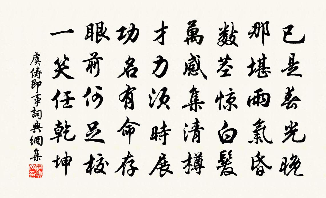 詩詞名句歷史字典書法欣賞書法字典國語詞典說文解字康熙字典古漢語字典標 題 作 者 詩 句 即事作者:虞儔 朝代:宋代即事原文已是春光晚,那堪雨氣昏。數莖驚白髮,萬感集清樽。才力須時展,功名有命存。眼前何足校,一笑任乾坤。詩詞問答問:即事的作者是誰?答:虞儔問:即事寫於哪個朝代?答:宋代虞儔即事書法欣賞即事書法作品詩詞推薦新筍梅堯臣〔宋代〕挑筍春雷後,晴坡過雨時。何言江外早,已比洛陽遲。園客自偷賣,主人那得知。徒令養新竹,待與作藩籬。題僧子溫畫水墨蒲萄周弼〔宋代〕裊裊多應半熟時,落斜高掛冷攢枝。分明記得山窗下,一架寒藤帶雨垂。題存思庵壁舒岳祥〔宋代〕香飯炊魚白,新醅擘蟹黃。秋風元不惡,鄉思自難忘。田水閒無用,山雲薄有光。篆畦訊息好,一路木樨香。雉山章峴〔宋代〕營邱水墨師,不識桂林山。半世閱渠畫,今始陋堅頑。嶺邊千奇峰,濃紺梳雲鬢。肩輿兀醉夢,所窺才一斑。偶投喜涼章甫〔宋代〕暑氣今全減,人心始少蘇。客愁生海燕,秋意入庭梧。歲月真虛擲,詩書只自娛。荊山誰獻玉,齊國正吹竽。和令狐相公南齋小宴聽阮鹹劉禹錫〔唐代〕阮巷久蕪沉,四弦有遺音。雅聲發蘭室,遠思含竹林。座絕眾賓語,庭移芳樹陰。飛觴助真氣,寂聽無流心。影似霜天曉月樓槃〔宋代〕翦雪裁冰。有人嫌太清。又有人嫌太瘦,都不是、我知音。誰是我知音。孤山人姓林。一自西湖別後,辜負我、到農難梅堯臣〔宋代〕稂莠非所殖,嘉禾共一田。老農實惡之,豈共時稼捐。管蔡與盜跖,同氣詎能遷。周公不妨聖,柳惠不妨賢。賢哉見淮東制帥趙南仲侍郎相待厚甚特送買山錢又戴復古〔宋代〕如公當向古人求,識面何須萬戶侯。浪說釣鰲游瀚海,真成騎鶴上揚州。受恩多處難為別,宿酒醒時始覺愁。回首夜聽妓詩 二謝朓〔南北朝〕上客光四座。佳麗直千金。掛釵報纓絕。墮珥答琴心。蛾眉已共笑。清香復入襟。歡樂夜方靜。翠帳垂沉沉。中秋不見月得斯遠所寄詩有懷兼呈遠父成父趙蕃〔宋代〕中秋不見月,空傳江左詩。陰晴定俱爾,離合政關茲。亦復婆娑否,還成賦詠為。溪南舊遊地,誰與共襟期。游鹿頂山陳著〔宋代〕茲庵擅佳境,一到願方償。鐘鼓江湖笠,琴棋水竹房。相逢多故舊,小憩得清涼。自笑因級淺,又催行路忙。雪意陸游〔宋代〕風吼江郊雪意濃,雲如雨陣決雌雄。山寒酒過平時量,窗黑書虧半日功。閒話更端茶灶熟,清詩分韻地爐紅。不須長門失寵蕭意〔唐代〕自從別鑾殿,長門幾度春。不知金屋裡,更貯若為人。送韋處士老舅王建〔唐代〕憶昨痴小年,不知有經籍。常隨童子游,多向外家劇。偷花入鄰里,弄筆書牆壁。照水學梳頭,應門未穿幘。人前人日飯昭覺陸游〔宋代〕天涯羈旅逢人日,病起消搖集寶坊。雪水初融錦江漲,梅花半落綠苔香。家山松桂年年長,幕府文書日日忙。自笑自妙相歸將至杜浦堰舟中作陸游〔宋代〕斜陽發東郭, * 轉西城。寺閣疏鍾動,漁村遠火明。蒼茫林靄滅,撲漉水禽驚。漸喜吾廬近,遙聞過埭聲。竹溪直院盛稱起予草堂詩之善暇日覽之多有可劉克莊〔宋代〕齊魯多方士,荒唐競自媒。微茫隔煙霧,向望祀蓬萊。甲帳雲旗下,離宮月戶開。海難架橋渡,風易引船回。求藥示黃岡長老二絕胡寅〔宋代〕落日溪橋佇寧時,溪雲歸盡月生遲。溪聲漏泄真訊息,借問溪翁卻不知。京兆杜嬰大醇能讀書其言近莊其為人曠達而廉王安石〔宋代〕蕭瑟野衣巾,能忘至老貧。避囂依市井,蒙垢出埃塵。接物工齊物,勞身恥為身。傷心宿昔地,不復見斯人。名句推薦紫燕一雙嬌語碎,翠屏十二晚峰齊,夢魂消散醉空閨。毛熙震《浣溪沙·花榭香紅煙景迷》 千年史冊恥無名,一片丹心報天子。陸游《金錯刀行》 不見又思量,見了還依舊。李之儀《謝池春·殘寒銷盡》 棗花至小能成實,桑葉雖柔解吐絲。王溥《詠牡丹》 槲葉落山路,枳花明驛牆。溫庭筠《商山早行》 桃花落。閒池閣。山盟雖在,錦書難托。陸游《釵頭鳳·紅酥手》 在天願作比翼鳥,在地願為連理枝。白居易《長恨歌》 賴其力者生,不賴其力者不生。墨子《墨子·32章 非樂(上)》 繞遍迴廊還獨坐。月籠雲暗重門鎖。蘇軾《蝶戀花·雨霰疏疏經潑火》 縱被春風吹作雪,絕勝南陌碾成塵。王安石《北陂杏花》