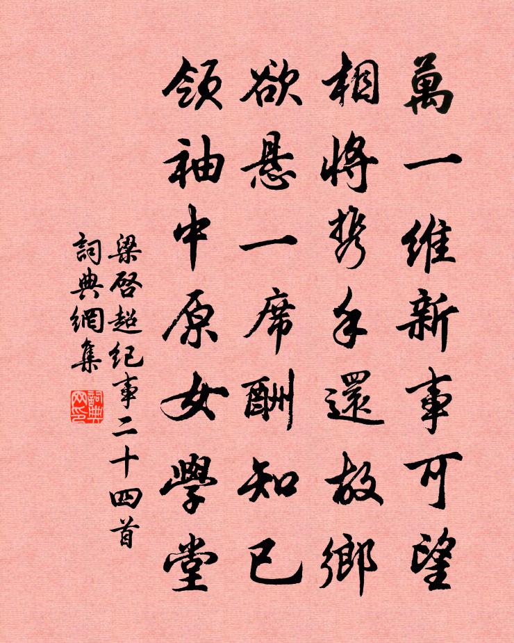 詩詞名句歷史字典書法欣賞書法字典國語詞典說文解字康熙字典古漢語字典標 題 作 者 詩 句 紀事二十四首作者:梁啓超 朝代:清代紀事二十四首原文萬一維新事可望,相將攜手還故鄉。欲懸一席酬知已,領袖中原女學堂。詩詞問答問:紀事二十四首的作者是誰?答:梁啓超問:紀事二十四首寫於哪個朝代?答:清代梁啓超紀事二十四首書法欣賞紀事二十四首書法作品詩詞推薦暮春即事魚玄機〔唐代〕深巷窮門少侶儔,阮郎唯有夢中留。香飄羅綺誰家席,風送歌聲何處樓。街近鼓鼙喧曉睡,庭閒鵲語亂春愁。安能春日道中白玉蟾〔宋代〕洞口鳥呼鳥,山頭花戴花。風篁蒼韻玉,煙樹晚籠紗。懷白一樽酒,邀盧七椀茶。春光索彈壓,萬象曉排衙。答二郭詩 其一嵇康〔兩漢〕天下悠悠者。不能趨上京。二郭懷不羣。超然來北征。樂道托萊廬。雅志無所營。良時遘其願。遂結歡愛情。君子魏鵬負期醉臥戲題練裙賈雲華〔宋代〕暮雨朝雲少定蹤,空勞神女下巫峰。襄王自是無情緒,醉臥明月花影中。桃李吟邵雍〔宋代〕桃李因風花滿枝,因風桃李卻離披。慘舒相繼不離手,憂喜兩般都在眉。泰到盛時須人蠱,否當極處卻成隨。今人送僧歸護國寺張師德〔宋代〕喜陪人傑論三乘,岩室經年鎖翠稜。六代有師傳法印,萬緣無象監心燈。赤城道遠明霞畫,瀑布聲寒月照冰。跡似偈頌一百零二首釋慧遠〔宋代〕老胡誕生四月八,韶陽亂棒打不殺。如今縱得十分全,頂門正眼依前瞎。送韋判官歸薊門於鵠〔唐代〕桑乾歸路遠,聞說亦愁人。有雪常經夏,無花空到春。下營雲外火,收馬月中塵。白首從戎客,青衫未離身。題馬遠畫冊五首宋高宗〔宋代〕月午江空桂花落,華陽道士雲衣薄。石壇香散步虛聲,杉露清泠滴棲鶴。西湖晚歸宋伯仁〔宋代〕風力尖纖酒力微,重添脫下薄綿衣。心忙愈覺蘇堤遠,趁得漁船載得歸。題中山出遊圖龔開〔宋代〕髯君家本住中山,駕言出遊安所適。謂為小獵無鷹犬,以為意行有家室。阿妹韶容見靚妝,五色臙脂最宜黑。道逢禪人並化主寫真求贊釋正覺〔宋代〕心空月高,發白雪饒。氣吞百川兮其口如海,浪卷萬里兮其舌翻潮。一句直指,三乘獨超。忽雷破蟄起平地,赤腳掩役夫張進骸柳宗元〔唐代〕生死悠悠爾,一氣聚散之。偶來紛喜怒,奄忽已復辭。為役孰賤辱,為貴非神奇。一朝纊息定,枯朽無妍媸。生平送韓九高適〔唐代〕惆悵別離日,裴回歧路前。歸人望獨樹,匹馬隨秋蟬。常與天下士,許君兄弟賢。良時正可用,行矣莫徒然。句晁說之〔宋代〕煩君一日殷勤意,示我十年感遇詩。尋郭道士不遇白居易〔唐代〕郡中乞假來相訪,洞裡朝元去不逢。看院只留雙白鶴,入門唯見一青松。藥爐有火丹應伏,雲碓無人水自舂。[廬卯飲白居易〔唐代〕短屏風掩臥床頭,烏帽青氈白毳裘。卯飲一杯眠一覺,世間何事不悠悠?虞美人陳允平〔宋代〕夕陽樓上都憑遍。柳下風吹面。強搴羅袖倚重門。懶傍玉台鸞鏡、暗塵昏。離情脈脈如飛絮。此恨憑誰語。一天明臘月二十二夜漏下數刻小飲徑醉坐小合睡傍無劉克莊〔宋代〕黠鬼機械惡毒,老 * 肉麻頑。且摩麟肪止血,不須獺髓滅瘢。公邁何遄曾豐〔宋代〕公之南矣,潭人是懷,洪人是留。議奪朱幡,亟哉還休。御者既靷,錢者既挽。俄馳頃驅,僄其未返。洪人曰{左名句推薦繡袂捧琴兮,登君子堂。貫休《善哉行·傷古曲無知音》 有心為善,雖善不賞。無心為惡,雖惡不罰。蒲松齡《聊齋志異·卷一·考城隍》 東門之楊,其葉牂牂。佚名《東門之楊》 可惜流年,憂愁風雨,樹猶如此!辛棄疾《水龍吟·登建康賞心亭》 眾里尋他千百度,驀然回首,那人卻在,燈火闌珊處。辛棄疾《青玉案·元夕》 范增一去無謀主,韓信原來是逐臣。嚴遂成《烏江項王廟》 明朝又是孤舟別,愁見河橋酒幔青。竇叔向《夏夜宿表兄話舊》 其出彌遠,其知彌少。老子《老子·德經·第四十七章》 何日請纓提銳旅,一鞭直渡清河洛。岳飛《滿江紅·登黃鶴樓有感》 夜如何其夜漫漫,鄰雞未鳴寒雁度。劉禹錫《更衣曲》