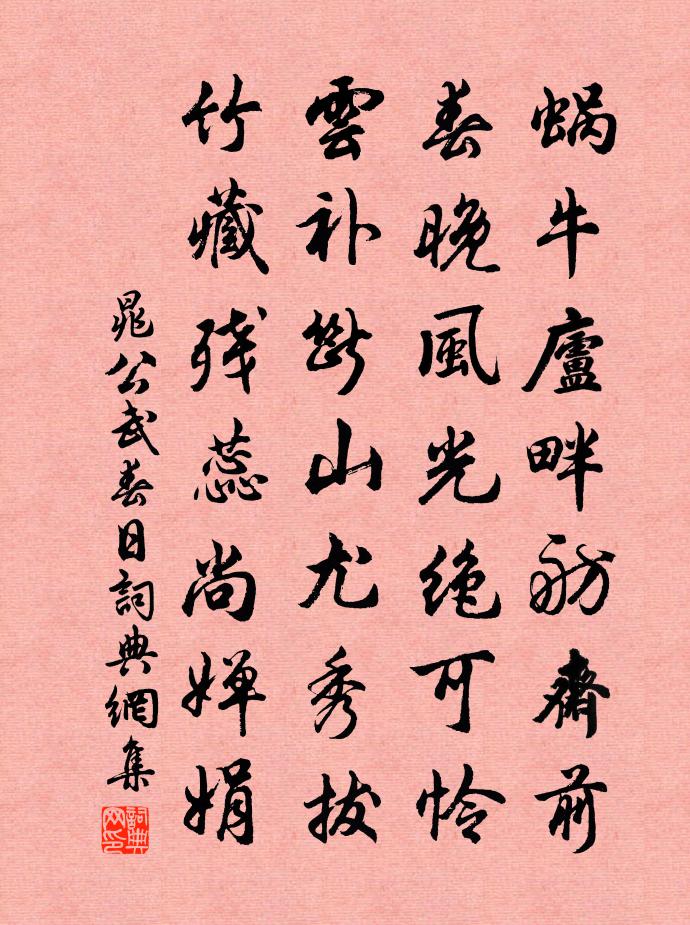 詩詞名句歷史字典書法欣賞書法字典國語詞典說文解字康熙字典古漢語字典標 題 作 者 詩 句 春日作者:晁公武 朝代:宋代春日原文蝸牛廬畔舫齋前,春晚風光絕可憐。雲補斷山尤秀拔,竹藏殘蕊尚嬋娟。詩詞問答問:春日的作者是誰?答:晁公武問:春日寫於哪個朝代?答:宋代晁公武春日書法欣賞春日書法作品詩詞推薦奉和魯望漁具十五詠藥魚皮日休〔唐代〕吾無竭澤心,何用藥魚藥。見說放溪上,點點波光惡。食時競夷猶,死者爭紛泊。何必重傷魚,毒涇猶可作。田舍雜興懷長兄四首廖行之〔宋代〕去城靳靳路一驛,故歲迢迢今甫來。桃李陰成真綠野,溪山清絕勝章台。青衫手板徒勞爾,竹杖芒鞋亦快哉。莫向嵩山黃庶〔宋代〕峨峨鎮中夏,峻極萬尋隮。突兀磨天頂,窈窕入地臍。中林興夏雹,半壑臥秋霓。泉恐連清漢,峰疑擁碧圭。雲高過欽止趙蕃〔宋代〕一飯肯留我,群書容恣繙。雨收還摵摵,雲破復昏昏。山水琴中趣,桑麻野外論。淡交真有味,炎附卒成燔。送楊義甫訪雲林子王冕〔元代〕公子翩翩孰與儔?雲林清氣逼高秋。牙籤耀日書充屋,彩筆凌煙畫滿樓。既是有樽開北海,豈雲無榻下南州?相逢和王安之六老詩呂公著〔宋代〕六老播然鬢似霜,縱心年至又非狂。園池共避何方勝,樽酒相歡未始忙。杖屨爛游千載運,衣巾濃惹萬花香。過從前山尋蘭鄭剛中〔宋代〕眼債未全無,惜春心尚有。喜聞幽蘭臭,尋過東出口。披叢見孤芳,正似得佳友。小鍤破蒼蘚,護致歸座右。秀色偈頌一百四十一首釋師範〔宋代〕瞿曇瞬目,迦葉破顏。山僧聞得,咬定牙關。送客山行楊萬里〔宋代〕嶺云為作小涼天,山店重來憶去年。獨樹丹楓誰不見,何須更立萬松前。頌古十七首釋道行〔宋代〕枯樹雲棄葉,凋梅雪作花。擊桐成木響,蘸雪吃冬瓜。長天秋水,孤鶩落霞。鄉人羅朝宗與兵部尚書京公有舊將往見之遇予裘萬頃〔宋代〕四時成歲秋雲暮,九月肅霜天漸寒。有客褰裳涉鄱水,逢人劇口話長安。懸知欲聽星辰履,厭見從來苜蓿盤。姑舉宿江店張籍〔唐代〕野店臨西浦,門前有橘花。停燈待賈客,賣酒與漁家。夜靜江水白,路回山月斜。閒尋泊船處,潮落見平沙。贊歷代天師第八代諱迥字彥超白玉蟾〔宋代〕丹篆才書泣鬼神,年逾九十脫紅塵。至今岩上結廬處,夜半鳳凰棲綠筠。判命坡范成大〔宋代〕鑽天嶺上已飛魂,判命坡前更駭聞。側足三分垂壞磴,舉頭一握到孤雲。微生敢列千金子,後福猶幾萬石君。早晚即事杜甫〔唐代〕暮春三月巫峽長,皛皛行雲浮日光。雷聲忽送千峰雨,花氣渾如百和香。黃鶯過水翻回去,燕子銜泥濕不妨。飛閣次徐隆慶壽詩韻二首洪咨夔〔宋代〕史君筆斡萬牛回,腳底春風舌底雷。一夜劇談逢野閬,百年高誼見鷗梅。客心袞袞江流去,老色翩翩歲事來。墮地文燕潤卿不至鄭璧〔唐代〕已知羽駕朝金闕,不用燒蘭望玉京。應是易遷明月好,玉皇留看舞雙成。和答孫推官入病新起見過錢塘之什二首蔡襄〔宋代〕於世無機是海翁,客情醒醉任鄰鍾。廉纖雨意還侵夜,料峭春期未減冬。寶氣上浮難掩玉,歲寒中立不凋松。君王次韻曠翁四時村居樂艾性夫〔宋代〕雁雲漠漠梧桐秋,風露颯颯生平疇。芭蕉葉黃夜氣濕,老壁屈曲行蝸牛。林外炊煙暗青樹,牆頭涼月驚鳴杵。柴門送楚丘麴少府赴官岑參〔唐代〕青袍美少年,黃綬一神仙。微子城東面,梁王苑北邊。桃花色似馬,榆莢小於錢。單父聞相近,家書早為傳。名句推薦河水縈帶,群山糾紛。李華《弔古戰場文》 三月休聽夜雨,如今不是催花。張炎《清平樂·采芳人杳》 禍與福相貫,生與亡為鄰劉向《戰國策·楚四·或謂楚王》 自知者英,自勝者雄。王通《中說·卷四·事君篇》 老翁逾牆走,老婦出門看。杜甫《石壕吏》 記取江湖泊船處,臥聞新雁落寒汀。陸游《夜泊水村》 暗燈涼簟怨分離,妖姬,不勝悲。閻選《河傳·秋雨》 可憐報國無路,空白一分頭。楊炎正《水調歌頭·登多景樓》 菩薩應如是布施。不住於相。鳩摩羅什譯《金剛經·妙行無住》 蕭蕭江上荻花秋,做弄許多愁。賀鑄《眼兒媚·蕭蕭江上荻花秋》