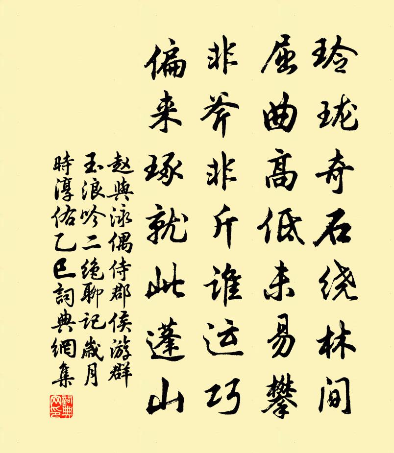 詩詞名句歷史字典書法欣賞書法字典國語詞典說文解字康熙字典古漢語字典標 題 作 者 詩 句 偶侍郡侯游群玉浪吟二絕聊記歲月時淳佑乙巳作者:趙與泳 朝代:宋代原文玲瓏奇石繞林間,屈曲高低未易攀。非斧非斤誰運巧,偏來琢就此蓬山。詩詞問答問:《偶侍郡侯游群玉浪吟二絕聊記歲月時淳佑乙巳》的作者是誰?答:趙與泳問:該詩寫於哪個朝代?答:宋代書法欣賞偶侍郡侯游群玉浪吟二絕聊記歲月時淳佑乙巳書法作品詩文賞析【原題】:偶侍郡侯游群玉浪吟二絕聊記歲月時淳佑乙巳菊節前一日詩詞推薦日暖萬年枝蔣防〔唐代〕新陽歸上苑,嘉樹獨含妍。散漫添和氣,曈曨卷曙煙。流輝宜聖日,接影貴芳年。自與恩光近,那關煦嫗偏。結根壬子七月釋行海〔宋代〕茫茫宇宙事如何,夕菊朝蘭宛轉歌。陌上柳條誰折盡,客中秋思夜來多。陽春欲奏朱弦斷,江水長流白鳥過。一自祁國正獻公輓歌三首司馬光〔宋代〕舟楫才猷大,冰霜德操堅。陶鈞成茂業,書史樂高年。瞻望簪紳共,吁嗟館舍捐。舉時無異論,方信令名全。多病戲書,因示長孺權德輿〔唐代〕行年未四十,已覺百病生。眼眩飛蠅影,耳厭遠蟬聲。甘辛敗六藏,冰炭交七情。唯思曲肱枕,搔首擲華纓。挽國史侍讀李公仁父喻良能〔宋代〕大名垂宇宙,秀氣發岷峨。學比淵雲贍,才方賈馬過。九朝資直筆,二子振賢科。已矣流芳在,千秋保不磨。夜坐郭印〔宋代〕永夜不可寐,霜風恓北窗。一室何所有,書帙對寒釭。當今苦乏才,九鼎從敵扛。翠華塵屢蒙,南北分大江。有酒和新鄉二十一兄華嚴水亭五首晃沖之〔宋代〕荷蓋點溪三數葉,藤梢繞樹幾千層。投閒更與高人約,重抱琴來聽廣陵。為陸思遠婦作詩陸機〔魏晉〕二合兆嘉偶。女子禮有行。潔己入德門。終遠母與兄。如何耽時寵。遊宦忘歸寧。雖為三載婦。顧景媿虛名。歲暮策師南遊過三峽見予求施以詩會余憂悲苦惱無馮時行〔宋代〕策骨寒瘦枯梅枝,梅花開時徵我詩。我詩悲瘁作無意,借梅代我陳其詞。梅雲最先得春意,桃花亂攙作佛事。千年書郭判官幽齋壁李中〔唐代〕不妨公退尚清虛,創得幽齋興有餘。要引好風清戶牖,旋栽新竹滿庭除。傾壺待客花開後,煮茗留僧月上初。更有重訪草堂汪元量〔宋代〕放櫂花豀去,重來訪草堂。菰蒲依靜渚,楊柳繞回塘。野暫棕高下,山牆竹短長。槁梧含古色,瘦菊減清香。鼙鼓和江如晦王洋〔宋代〕蕭寺姑分一日光,人生同調穩相當。空齋夜語規前哲,帶酒論文恐老狂。三獻三休真琬琰,一前一卻笑螳螂。君家楊柳枝侯善淵〔元代〕孰見西明畫錦妝。景非常。煙波柳岸映斜陽。水雲鄉。咫尺家山人不到,好風光。步虛升入碧雲房。洞天長。氐州第一·波落寒汀周邦彥〔宋代〕波落寒汀,村渡向晚,遙看數點帆小。亂葉翻鴉,驚風破雁,天角孤雲縹緲。官柳蕭疏,甚尚掛微微殘照?景物關桐廬暑夜馮坦〔宋代〕中流有行舟,似亦得清致。只恐乘舟人,未識月中意。壬寅仲秋二十有五日哭東萊先生之墓徐暄〔宋代〕庚子秋中憶請違,先生溫語扣還期。去年匍匋雙溪路,迨似當年失母時。銅雀台劉庭琦〔唐代〕銅台宮觀委灰塵,魏主園林漳水濱。即今西望猶堪思,況復當時歌舞人。再次韻贈俞德瑞陳造〔宋代〕珠軒繡轂輾香塵,回首西湖羅綺春。便合行歌訪花柳,可辭買笑費金銀。清吟自屬當千客,勸醉那無第一人。肯學頌古釋道顏〔宋代〕江西一喝動乾坤,大用全機是滅門。三日耳聾風過樹,累他黃檗喪兒孫。送長安羅少府朱慶餘〔唐代〕科名再得年猶少,今日休官更覺賢。去國已辭趨府伴,向家還入渡江船。雪晴新雁斜行出,潮落殘雲遠色鮮。在處名句推薦赤壁磯頭落照,肥水橋邊衰草,渺渺喚人愁張孝祥《水調歌頭·和龐佑父》 江山易改,稟性難移。馮夢龍《醒世恆言·卷三十五》 今日漢宮人,明朝胡地妾。李白《王昭君二首》 起來搔首,梅影橫窗瘦。汪藻《點絳唇·新月娟娟》 雖至親亦忍絕,縱為惡亦不讓。來俊臣《羅織經·事上卷第二》 牛鳴而馬不應,非不聞牛聲也,異類故也。劉向《列女傳·辯通傳·齊孤逐女》 菩提本無樹,明鏡亦非台。惠能《菩提偈》 驪宮高處入青雲,仙樂風飄處處聞。白居易《長恨歌》 身勞而心安,為之;利少而義多,為之荀子《荀子·修身》 三十功名塵與土,八千里路雲和月。岳飛《滿江紅·寫懷》