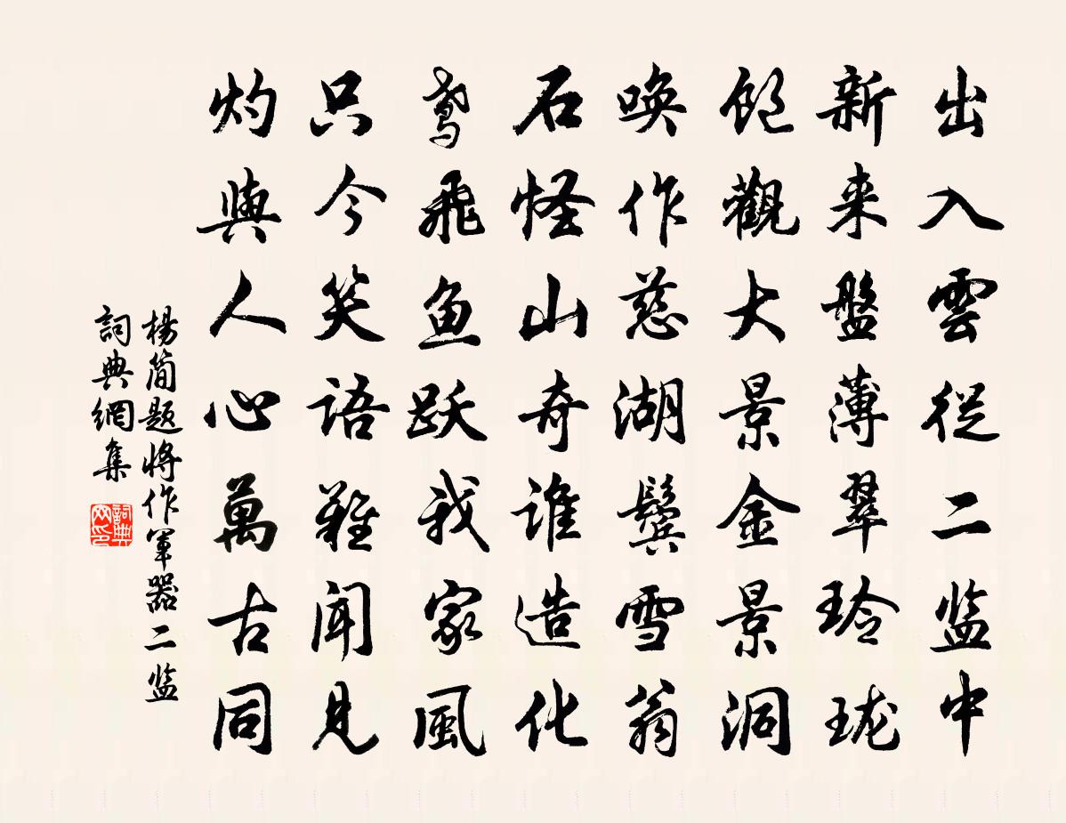 詩詞名句歷史字典書法欣賞書法字典國語詞典說文解字康熙字典古漢語字典標 題 作 者 詩 句 題將作軍器二監作者:楊簡 朝代:宋代題將作軍器二監原文出入雲從二監中,新來盤薄翠玲瓏。飽觀大景金景洞,喚作慈湖鬢雪翁。石怪山奇誰造化,鳶飛魚躍我家風。只今笑語難聞見,灼與人心萬古同。詩詞問答問:題將作軍器二監的作者是誰?答:楊簡問:題將作軍器二監寫於哪個朝代?答:宋代楊簡題將作軍器二監書法欣賞題將作軍器二監書法作品詩詞推薦和三鄉詩劉谷〔唐代〕蘭蕙芬香見玉姿,路傍花笑景遲遲。薴蘿山下無窮意,並在三鄉惜別時。書懷四首胡宏〔宋代〕秋風送盡炎威,日色淒涼半掩。皇天不斷春工,紅我芙蓉萬點。漢宮春(九日登豐樂樓)佚名〔宋代〕手捻黃花,對西風無語,雙鬢蕭蕭。韶華暗中過眼,零落心交。登臨把酒,更誰伴、破橘持螯。惟只有,湖邊鷗鷺送晁美叔發運右司年兄赴闕蘇軾〔宋代〕我年二十無朋儔,當時四海一子由。君來扣門如有求,頎然病鶴清而修。醉翁遣我從子游,翁如退之蹈軻丘。尚欲行見月王建〔唐代〕月初生,居人見月一月行。行行一年十二月,強半馬上看盈缺。百年歡樂能幾何,在家見少行見多。不緣衣食相驅次韻泮宮直宿早秋四首傅察〔宋代〕一方明月落長空,萬里餘輝鎖玉櫳。蟬韻啾啾來遠木,槐雲裊裊弄清風。共邀載酒陶彭澤,走訪談經載侍中。景物滿江紅葉夢得〔宋代〕雪後郊原,煙林靜、梅花初坼。春欲半,猶自探春訊息。一眼平蕪看不盡,夜來小雨催新碧。笑去年、攜酒折花人殘句:陳師道〔宋代〕早晚望夫能化石,盡分人世作支機。和蔣夔寄茶蘇軾〔宋代〕我生百事常隨緣,四方水陸無不便。扁舟渡江適吳越,三年飲食窮芳鮮。金齏玉膾飯炊雪,海螯江柱初脫泉。臨風幽思陸游〔宋代〕雲際茅茨一兩間,春來幽春日相關。臨窗靜試下岩硯,欹枕臥看靈壁山。紅練帶飛俱意得,錦熏籠暖尚香慳。今朝元夕偶成蘇籀〔宋代〕里唱塗謳鐃吹轟,軟塵梁苑記前生。寶珠穿蟻嬉遊肆,蓮蕊然犀 * 。透碗燈繁人晝繡,隔羅光醖酒澠清。春娃次友人韻題墨梅李若水〔宋代〕南枝春色弄微溫,記得清香撲酒樽。今日相逢隔煙霧,揚州殘夢足銷魂。徐制準輓辭方回〔宋代〕紛紜鐘鼎誤公卿,孰與山林保令名。不共鵠袍爭舉業,早令熊轡紹詩聲。人間倏忽驚興廢,物外從容了死生。何限偈頌二百零五首釋正覺〔宋代〕玉女依稀夜動機,錦絲歷歷吐梭臍。水天湛碧全功墮,雪月寒清一色迷。憶平泉山居,贈沈吏部一首(中書作)李德裕〔唐代〕昔聞羊叔子,茅屋在東渠。豈不念歸路,徘徊畏簡書。乃知軒冕客,自與田園疏。歿世有遺恨,精誠何所如。嗟予次韻趙養民碧虛坐上范成大〔宋代〕已將山色染眉黛,更挽江波添酒罍。珍重江山勸人醉,笑人驅馬惺惺回。翠鳥詩蔡邕〔兩漢〕庭陬有若榴。綠葉含丹榮。翠鳥時來集。振翼修形容。回顧生碧色。動搖揚縹青。幸脫虞人機。得親君子庭。馴心龍泉山中釋善珍〔宋代〕自墾屋頭三四畦,得閒時復事鉏犁。花粘蛛網礙蜂度,樹帶鷹巢無雀棲。嘯罷半山聞逸響,詩成絕壁見新題。老來留別王昌齡〔唐代〕秦林映陂水,雨過宛城西。留醉楚山別,陰雲暮淒淒。連州吟孟郊〔唐代〕春風朝夕起,吹綠日日深。試為連州吟,淚下不可禁。連山何連連,連天碧岑岑。哀猿哭花死,子規裂客心。蘭芷名句推薦休問梁園舊賓客,茂陵秋雨病相如。李商隱《寄令狐郎中》 一晌凝情無語,手捻梅花何處。王之道《如夢令·一晌凝情無語》 千山鳥飛絕,萬徑人蹤滅。柳宗元《江雪》 斜陽流水推篷坐,翠色隨人慾上船紀昀《富春至嚴陵山水甚佳》 看萬山紅遍,層林盡染;漫江碧透,百舸爭流。 * 《沁園春·長沙》 貂不足,狗尾續。房玄齡《晉書·列傳·第二十九章》 典盡客衣三尺雪,煉精詩句一頭霜。王建《維揚冬末寄幕中二從事》 念月榭攜手,露橋聞笛。周邦彥《蘭陵王·柳》 小舟橫截春江,臥看翠壁紅樓起。蘇軾《水龍吟·閭丘大夫孝終公顯嘗守黃州》 聖人之救危國也,以忠拂耳。韓非及後人《韓非子·安危》