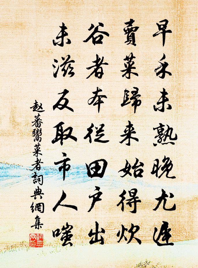 詩詞名句歷史字典書法欣賞書法字典國語詞典說文解字康熙字典古漢語字典標 題 作 者 詩 句 鬻菜者作者:趙蕃 朝代:宋代鬻菜者原文早禾未熟晚尤遲,賣菜歸來始得炊。谷者本從田戶出,未滋反取市人嗤。詩詞問答問:鬻菜者的作者是誰?答:趙蕃問:鬻菜者寫於哪個朝代?答:宋代趙蕃鬻菜者書法欣賞鬻菜者書法作品詩詞推薦滿江紅葉夢得〔宋代〕雪後郊原,煙林靜、梅花初坼。春欲半,猶自探春訊息。一眼平蕪看不盡,夜來小雨催新碧。笑去年、攜酒折花人江夏春感舊李頻〔唐代〕東風出海門,處處動林園。澤國雪霜少,沙汀花木繁。暖魚依水淺,晴雁入空翻。何處陽和力,生萍不駐根。送思齊上人之宣城林逋〔宋代〕林嶺藹春暉,程程入翠微。泉聲落坐石,花氣上行衣。詩正情懷澹,禪高論語稀。蕭閒水西寺,駐錫莫忘歸。漢陽林頵〔宋代〕西來漢水接江流,大別山前舊沔州。看到夕陽無盡興,一行飛鷺下汀洲。曉來胡仲弓〔宋代〕曉來對雪看唐詩,自暖茅柴酒一卮。絕勝五陵貴公子,銷金帳下飲羔兒。送黃吟隱游吳門盛烈〔宋代〕寒江買櫂催遄征,何如緩泛六橋尋鷗盟。侯門懷刺謁掌儐,何如散策孤山探梅信。吟隱豫章之耳孫,調高琢句期顓落石廟崔復初〔宋代〕廟門金字額,壁畫半凋零。殘日掛紅樹,晚猿吟翠屏。村深僧村實,歲久石英靈。聞受河汾業,老成猶典刑。次韻梅山弟陳著〔宋代〕掛畫燒香書滿前,丰標清出剡溪源。平坡肘腋眠牛壟,小屋規模放鶴園。外事任如黃葉寂,閒心暗與白雲論。應須晚秋郊居八首趙蕃〔宋代〕鄰父疑為三徑孫,一生辛苦在田園。近來交友誰相顧,渠獨頻沾菜把恩。庶幾吟邵雍〔宋代〕以聖責人,固未完備。以人望人,自有餘地。責人無難,受責非易。其殆庶幾,猶望顏子。句釋曉瑩〔宋代〕倒拄烏藤乘逸興。臨江仙(陳守美任)陳韡〔宋代〕三十四年台榭,八千餘里江津。去時楊柳正輕顰。重來桃李少,不似舊時春。風掃半空煙雨,玉虹翠浪如新。可憐點絳唇蘇庠〔宋代〕冰勒輕谷,綠痕初漲回塘水。柳洲煙際。白鷺翹沙嘴。B272笠青蓑,未減貂蟬貴。雲濤里。醉眠篷底。不屬人句曹唐〔唐代〕斬蛟青海上,射虎黑山頭。簫聲欲盡月色苦,依舊漢家宮樹秋。一曲哀歌茂陵道,漢家天子葬秋風。誰知漢武無仙宿卓水許衡〔元代〕寒釭挑盡火重生,竹有清聲月自明。一夜客窗眠不穩,卻聽山犬吠柴荊。折墨陸游〔宋代〕鸞膠搗松煙,成此金石姿,雖以剛故折,挺特終不移。微功在簡冊,敢惜身蹈危。雖非破硯文,永世亦有辭。項羽之死司馬遷〔兩漢〕項王軍壁垓下,兵少食盡,漢軍及諸侯兵圍之數重。夜聞漢軍四面皆楚歌,項王乃大驚曰:“漢皆已得楚乎?是何焦山范同〔宋代〕客星底事犯宸居,輸與焦君臥草廬。萬樹遮山難覓寺,百川入海此歸墟。浮沉心事盟鷗鳥,獻替功名愧{上制下魚論語絕句一百首張九成〔宋代〕若於君子能修敬,敬外無緣復有餘。子路不思三致問,病猶堯舜果何如。壽程宰三首洪咨夔〔宋代〕愛民如緣竿,百尺頭進步。未到百尺頭,努力莫回顧。當場萬人看,亭亭碧霄住。名句推薦乍暖還輕冷。張先《青門引·春思》 親愛我,孝何難。親憎我,孝方賢。李毓秀《弟子規·入則孝》 海畔風吹凍泥裂,枯桐葉落枝梢折。陳羽《從軍行》 文章憎命達,魑魅喜人過。杜甫《天末懷李白》 一場幽夢同誰近,千古情人獨我痴。曹雪芹《紅樓夢·第五回》 非得賢之難,用 之難。非用之難,信之難。房玄齡《晉書·列傳·第二十二章》 萬一禪關砉然破,美人如玉劍如虹。龔自珍《夜坐二首》 城外蕭蕭北風起,城上健兒吹落耳。劉基《北風行》 教民禮順,莫善於悌。孔子及其弟子《孝經·廣要道》 冰肌玉骨,自清涼無汗。蘇軾《洞仙歌·冰肌玉骨》