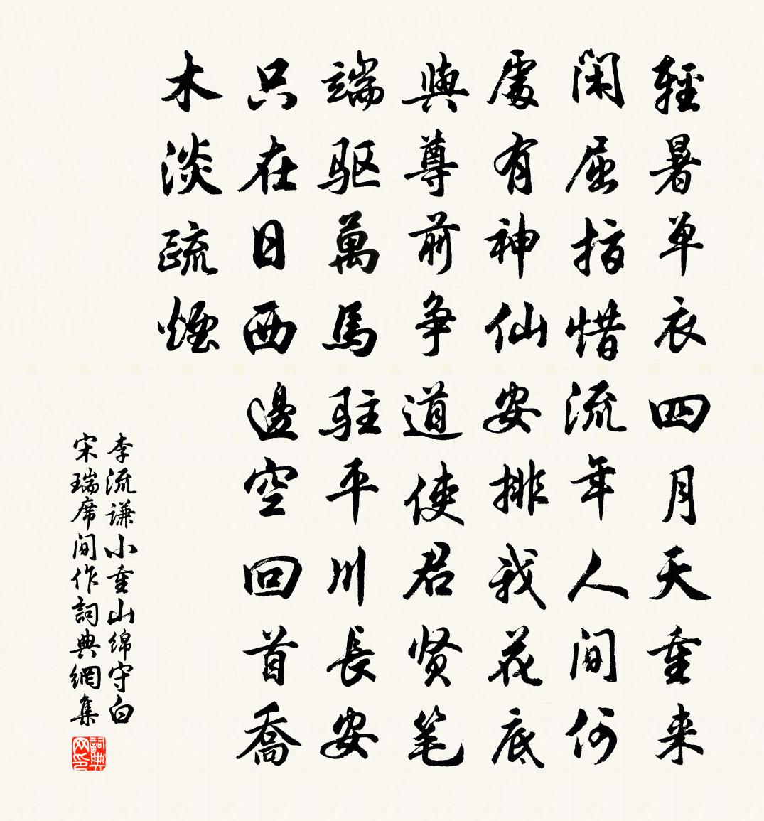 詩詞名句歷史字典書法欣賞書法字典國語詞典說文解字康熙字典古漢語字典標 題 作 者 詩 句 小重山(綿守白宋瑞席間作)作者:李流謙 朝代:宋代原文輕暑單衣四月天。重來閒屈指,惜流年。人間何處有神仙。安排我,花底與尊前。爭道使君賢。筆端驅萬馬,駐平川。長安只在日西邊。空回首,喬木淡疏煙。詩詞問答問:《小重山(綿守白宋瑞席間作)》的作者是誰?答:李流謙問:該詩寫於哪個朝代?答:宋代書法欣賞小重山(綿守白宋瑞席間作)書法作品詩詞推薦十二月一日因出小憩愉閣而歸趙蕃〔宋代〕昨宵已辨雪中燈,今日晴來聊記曾。病骨可堪風似刮,衰眸自喜句如冰。雁因就暖長為客,魚為逃寒返墜罾。北去止酒示圭陳起〔宋代〕一病杯中物致危,翰林何事酷耽之。酒經若果通仙道,不向青山立斷碑。依韻和御製秋晚曲宴詩韓元吉〔宋代〕巍巍舜漢浹嘉生,宴俎豐年萬寶成。禁幄雲深開曉色,上林風迥起秋聲。威加鼉鼓雷霆轉,喜動龍旗日月明。應手寒食日毛空路示侄晦及從簡元稹〔唐代〕我昔孩提從我兄,我今衰白爾初成。分明寄取原頭路,百世長須此路行。後天易吟三十首方回〔宋代〕易經之下卷,何以始恆鹹。貞女家人得,如詩有二南。皇后廟十五首真宗〔宋代〕牙獻有終,禮容斯穆。以奉嘉觴,以膺多福。晚過元老吳則禮〔宋代〕煮茗月才上,觀棋興未央。綸巾墮清夜,羽扇委初涼。玉露飛蓮沼,銀河帶草堂。聊憑明淨幾,那覺是他鄉。曉發富陽縣方回〔宋代〕長山礲石片帆斜,小雨初晴日眩沙。回首遙看富陽縣,青煙低罩一叢花。讀史二首張耒〔宋代〕區區奸智終何補,不悟身猶弄伎兒。蛇斷楚郊秦未覺,鬼謀曹社夢先知。燕歸梁(書水仙扇)吳文英〔宋代〕白玉搔頭墜髻松。怯冷翠裙重。當時離佩解丁東。澹雲低、暮江空。青絲結帶鴛鴦盞,歲華晚、又相逢。綠塵湘水贈人佚名〔唐代〕平生才不足,立身信有餘。自嘆無大故,君子莫相疏。小庭寒夜寄夢得白居易〔唐代〕庭小同蝸舍,門閒稱雀羅。火將燈共盡,風與雪相和。老睡隨年減,衰情向夕多。不知同病者,爭奈夜長何。和許表民湔江驛四題李新〔宋代〕筍成森碧玉,麥熟斂黃雲。村酒不堪酌,一杯能易醺。重來毛滂〔宋代〕出門聊作書生詠,倚馬猶能梁父吟。汾不寧無注書地,秦關已老棄繻心。重來樵釣深相識,未遍湖山擬細尋。白眼游近村陸游〔宋代〕行歷茶岡到藥園,卻從釣瀨入樵村。半衰半健意蕭散,不雨不晴天晏溫。薯蕷傍籬寒引蔓,菖蒲絡石瘦生根。參差看梅趙庚夫〔宋代〕竟日梅花側,枝枝入肺肝。濕疑霜旋剪,清比玉堪餐。臨水嚴光釣,吟風東野寒。年來難取友,珍重莫吹殘。到任明年結晶罷官有作司馬光〔宋代〕恬然如一夢,分竹守長安。雲日冰猶壯,歸時花未闌。風光經目少,惠愛及民難。可惜終南色,臨行子細看。題洗馬池釋道濟〔宋代〕昔日曾聞洗馬池,悠然此景在西溪。風生水面波紋細,日上堤邊樹影低。水底青天沈翡翠,波中明月浸琉璃。何如題四賢像魏處士劉克莊〔宋代〕曾箴王太尉,亦諷寇萊公。無端兩丞相,有愧一山翁。江北梅開殊晚和林實之別駕韻孫應時〔宋代〕楚江橫月一枝明,想見江南半落英。等是春風有先後,不妨調鼎看功成。名句推薦欲窮千里目,更上一層樓。王之渙《登鸛雀樓》 君若清路塵,妾若濁水泥;曹植《明月上高樓》 黃雲隴底白雲飛,未得報恩不能歸。李頎《古意》 閒來無事不從容,睡覺東窗日已紅。程顥《秋日》 白水明田外,碧峰出山後。王維《新晴野望》 待小人不難於嚴,而難於不惡;待君子不難於恭,而難於有禮。洪應明《菜根譚·概論》 楝花飄砌。蔌蔌清香細。謝逸《千秋歲·詠夏景》 人逢喜事精神爽,月到中秋分外明。馮夢龍《醒世恆言·卷十八》 訪戴歸來,尋梅懶去,獨釣無聊。薛昂夫《蟾宮曲·雪》 大雪壓青松,青松挺且直。陳毅《青松》