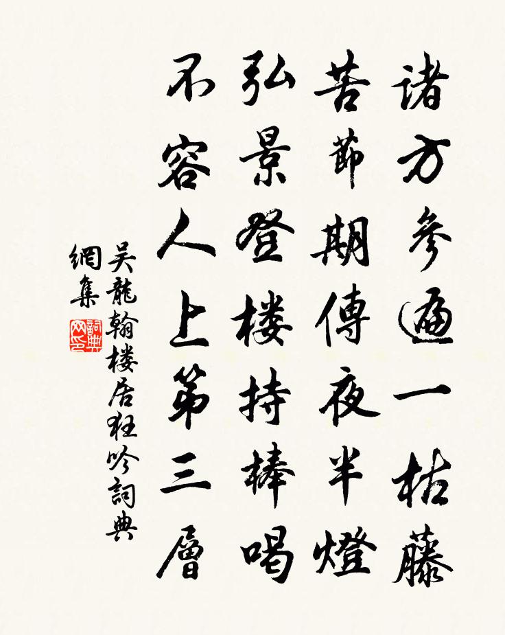 詩詞名句歷史字典書法欣賞書法字典國語詞典說文解字康熙字典古漢語字典標 題 作 者 詩 句 樓居狂吟作者:吳龍翰 朝代:宋代樓居狂吟原文諸方參遍一枯藤,苦節期傳夜半燈。弘景登樓持棒喝,不容人上第三層。詩詞問答問:樓居狂吟的作者是誰?答:吳龍翰問:樓居狂吟寫於哪個朝代?答:宋代吳龍翰樓居狂吟書法欣賞樓居狂吟書法作品詩詞推薦偈頌十八首釋道璨〔宋代〕漏盡夜沉沉,山房風露深。無雲生嶺上,有月落波心。贈天目吳君實林景熙〔宋代〕詩興翩翩度雪溪,岩雲猶護舊留題。夢回殘月蒼梧曉,家在春風秀麥西。萱草堂深衣屢寄,桃花觀冷酒重攜。故山偈頌三十首釋印肅〔宋代〕打折達磨西來腳,莫令有誤本來人。當處得心非向背,九年面壁寂光明。庭中立雪憨痴漢,海裹口乾渴愛津。如今頌古四十四首釋師範〔宋代〕頑皮老虎臥林丘,一任傍人放滴油。滿肚只因曾飽肉,縱加呼喚懶抬頭。驛舍見故屏風畫海棠有感陸游〔宋代〕厭煩只欲長面壁,此心安得頑如石。杜門復出嘆習氣,止酒還開慚定力。成都二月海棠開,錦繡裹城迷巷陌。燕宮次答邦直、子由五首蘇軾〔宋代〕五斗塵勞尚足留,閉關卻欲治幽憂。羞為毛遂囊中穎,未許朱雲地下游。無事會須成好飲,思歸時欲賦登樓。羨君感寓三首戴復古〔宋代〕自覺心無愧,何須座右銘。人將金作塢,吾雙石為屏。年老醫難療,天寒酒易醒。菊花香到死,不肯就飄零。句仇遠〔宋代〕螢火惟知夜,燈花不待春。應詔詠巢烏楊師道〔唐代〕桂樹春暉滿,巢烏刷羽儀。朝飛麗城上,夜宿碧林陲。背風藏密葉,向日逐疏枝。仰德還能哺,依仁遂可窺。驚鳴送韓玉汝曾鞏〔宋代〕野岸漲流水,名園紛雜英。旭景冠蓋集,清談樽酒傾。重此台省秀,駕言江海行。已喜懷抱粹,況推材實精。眾許偈傾一百六十九首釋智朋〔宋代〕雪山六載自欺瞞,耿耿明星碧漢間。開眼更無迴避處,普天匝地黑漫漫。古今日月,古今星辰。若教頻下淚,滄海雜題陸游〔宋代〕野花紅碧自爭春,村酒酸甜也醉人。解放船頭便千里,不愁無處著閒身。杜宇釋行海〔宋代〕蜀水蜀山歸路迷,煙林春晚草萋萋。野花如血無人管,空向長安枝上啼。旌李嶠〔唐代〕告善康莊側,求賢市肆中。擁麾分彩雉,持節曳丹虹。影麗天山雪,光搖朔寒風。方知美周政,抗旆賦車攻。定情曲賀鑄〔宋代〕瀋水濃熏,眉粉淡妝,露華鮮映春曉。淺顰輕笑。真物外,一種閒花風調。可待合歡翠被,不見忘憂芳草。擁膝渾同李秘校譚員外宿月華上方余靖〔宋代〕上方逢夏夕,月色遍千山。但覺星河近,偶同江海閒。事拋興廢外,談極有無間。卻笑明朝俗,紅塵隨馬還。古冢曹松〔唐代〕代遠已難問,累累次古城。民田侵不盡,客路踏還平。作穴蛇分蟄,依岡鹿繞行。唯應風雨夕,鬼火出林明。三月晦日與客小酌張耒〔宋代〕天教老景變芳菲,晨起衰翁換袷衣。盡日綠陰鶯懶囀,有時芳草蝶爭飛。最憐永日身無事,所嘆佳時客未歸。雖老句釋曉瑩〔宋代〕晚來供望眼。晚舟泊長河吳龍翰〔宋代〕詩客行裝少,孤舟一葉輕。寒鴉隨日落,秋雁破霜鳴。山色攢心事,江聲咽世情。故鄉無百里,酤酒話歸程。名句推薦幽音變調忽飄灑,長風吹林雨墮瓦李頎《聽董大彈胡笳聲兼寄語弄房給事》 驟雨過,珍珠亂撒,打遍新荷。元好問《驟雨打新荷》 出塞入塞寒,處處黃蘆草。王昌齡《塞下曲四首》 蕭蕭梧葉送寒聲,江上秋風動客情。葉紹翁《夜書所見》 花開又被風吹落,月皎那堪雲霧遮。施耐庵《水滸傳·第一百一十二回》 語之所貴者意也,意有所隨。意之所隨者,不可言傳也。莊子《莊子·外篇·天道》 秋菊有佳色,裛露掇其英。陶淵明《飲酒·其四》 心有疑,隨札記。就人問,求確義。李毓秀《弟子規·餘力學文》 謂女子,先生為姊,後生為妹。佚名《爾雅·釋親》 本來無一物,何處惹塵埃!惠能《菩提偈》