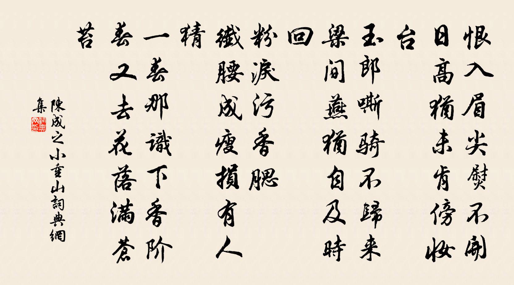 詩詞名句歷史字典書法欣賞書法字典國語詞典說文解字康熙字典古漢語字典標 題 作 者 詩 句 小重山作者:陳成之 朝代:宋代小重山原文恨入眉尖熨不開。日高猶未肯,傍妝檯。玉郎嘶騎不歸來。梁間燕,猶自及時回。粉淚污香腮。纖腰成瘦損,有人猜。一春那識下香階。春又去,花落滿蒼苔。詩詞問答問:小重山的作者是誰?答:陳成之問:小重山寫於哪個朝代?答:宋代問:小重山是什麼體裁?答:詞陳成之小重山書法欣賞小重山書法作品詩詞推薦尋梅洪咨夔〔宋代〕搖落園林一再霜,梅梢葉剩兩三黃。蕾紅包裹春猶密,隔壠枇杷得擅香。墨梅三絕張子文〔宋代〕逸少池邊發興新,管城別作一家春。臨風玉笛無人會,鬢髮空歸想太真。送楊君之任永康歐陽修〔宋代〕◇峰雲棧未嘗行,圖畫曾看已可驚。險若登天懸鳥道,下臨無地瀉江聲。折腰莫以微官恥,為政須通異俗情。況子陽台曲楊維楨〔元代〕月落望夫山,高台十二鬟。楚宮多妒女,雲雨夢中還。牧兒吳伯凱〔宋代〕磊塊胸懷漫不平,牧兒橫草耤功名。韓彭不載貂蟬死,牛背斜陽且意行。洛陽道王貞白〔唐代〕喧喧洛陽路,奔走爭先步。唯恐著鞭遲,誰能更回顧。覆車雖在前,潤屋何曾懼。賢哉只二疏,東門掛冠去。阻風韓偓〔唐代〕平生情趣羨漁師,此日煙江愜所思。肥鱖香粳小艛艓,斷腸滋味阻風時。送程公明李新〔宋代〕玉鐙驚驦趁早朝,天香成陣暗蟬貂。平雲無復偷閒到,溪闊煙深鎖市橋。西河吳潛〔宋代〕都會地。東南盛府堪記。蓬萊縹緲十洲中,雉城擁起。憑高一盼大江橫,遙連滄海無際。壁同眾山翠倚。赤龍、白又示宗武杜甫〔唐代〕覓句新知律,攤書解滿床。試吟青玉案,莫羨紫羅囊。假日從時飲,明年共我長。應須飽經術,已似愛文章。十五晴郊意行到梅山示弟茝陳著〔宋代〕安排聚首易參差,信意行來始是奇。山色堪餐饒有菊,樵歌相應自成詩。危時杯酌旱雲雨,老境襟期春水澌。醉里十月二三日嫩晴薄寒山房新構書閣去年此日北舒岳祥〔宋代〕霧重月無色,夜來寒有情。牆根余宿莽,大末弄初晴。去歲那知有,新冬得此生。擁爐談往事,鸜鵒報三更。送劉牧推官之兗州范仲淹〔宋代〕相國鎮束魯,開合多英豪。羨子賦從軍,壯思如波濤。當有非常遇,所得連六鰲。故人孫復之,臥雲生二毛。或作和曾守祈雪二首曹勛〔宋代〕天其或使不輕飛,有待隨軒故作心。風靜圓虛才半夜,雪隨精意若前期。影藏寂寂沙頭鷺,寒入青青壠首岐。千里江南五首劉克莊〔宋代〕已報行營入,猶夸僭壘堅。何曾陵谷變,但見市朝遷。次前韻二首司馬光〔宋代〕南園莫笑獨追尋,明日未知晴與陰。揮手一朝辭逆旅,滿堂安用累千金。題蓋竹廟六絕陳淳〔宋代〕夢生於想本來非,一自魂交百感隨。漠漠茫茫無定準,若何據此卜前達。尉氏道中孔武仲〔宋代〕江且花已繁,天畿草初茁。春風動地來,萬鼓相應發。長郊不敢進,環坐借藁秸。前村應稍近,時有駝鳴{囗里加過清涼寺王導墓下唐彥謙〔唐代〕江左風流廊廟人,荒墳拋與梵宮鄰。多年羊虎猶眠石,敗壁貂蟬只貯塵。萬古雲山同白骨,一庭花木自青春。永思壽星明/沁園春佚名〔宋代〕玉露迎寒,金風薦冷,正蘭桂香。覺秋光過半,日臨三九,蔥蔥佳氣,藹藹琴堂。見說當年,申生穀旦,夢葉長庚名句推薦柔情似水,佳期如夢,忍顧鵲橋歸路。秦觀《鵲橋仙·纖雲弄巧》 大難不死,必有後祿。馮夢龍《喻世明言·卷二十一》 寒鴉飛數點,流水繞孤村。楊廣《失題》 長江悲已滯,萬里念將歸。王勃《山中》 蕭蕭梧葉送寒聲,江上秋風動客情。葉紹翁《夜書所見》 何當擊凡鳥,毛血灑平蕪。杜甫《畫鷹》 用仁義以治天下,行禮樂以變海內,公賞罰以定干戈。施耐庵《水滸傳·第八十二回》 自勝之謂強。韓非及後人《韓非子·喻老》 老子有見於詘,無見於信。荀子《荀子·天論》 酒已都醒,如何消夜永!周邦彥《關河令·秋陰時晴漸向暝》