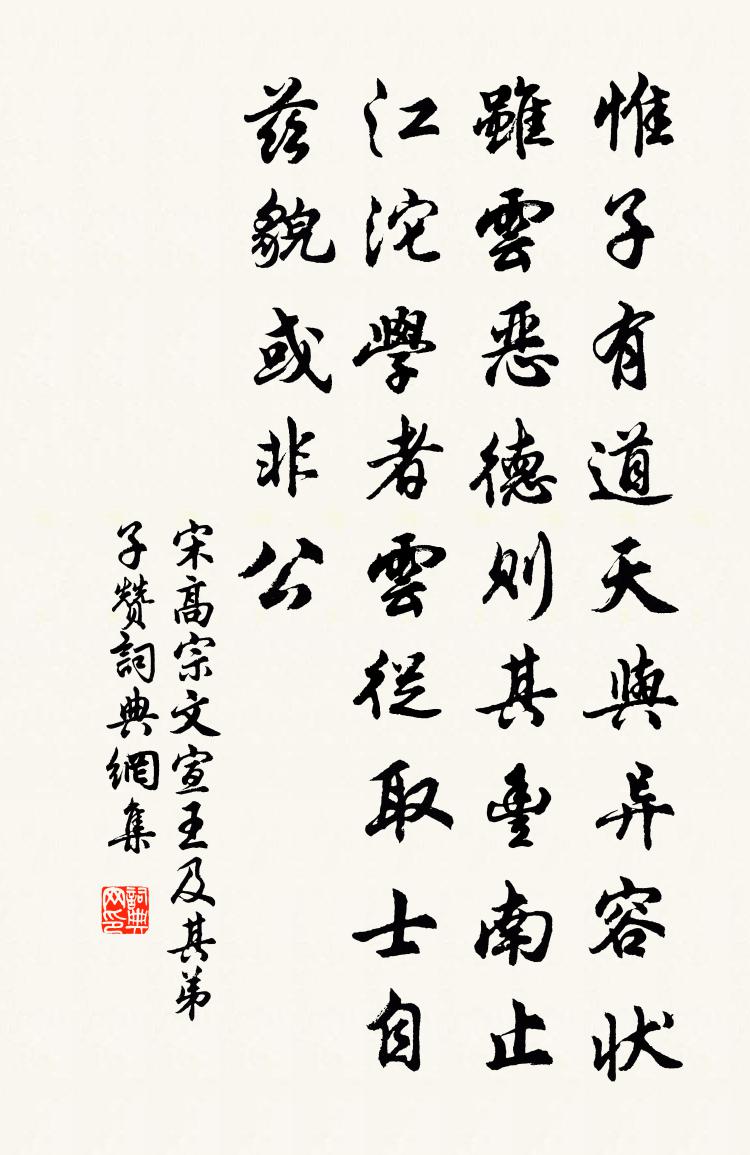 詩詞名句歷史字典書法欣賞書法字典國語詞典說文解字康熙字典古漢語字典標 題 作 者 詩 句 文宣王及其弟子贊作者:宋高宗 朝代:宋代文宣王及其弟子贊原文惟子有道,天與異容。狀雖雲惡,德則其豐。南止江沱,學者雲從。取士自茲,貌或非公。詩詞問答問:文宣王及其弟子贊的作者是誰?答:宋高宗問:文宣王及其弟子贊寫於哪個朝代?答:宋代宋高宗文宣王及其弟子贊書法欣賞文宣王及其弟子贊書法作品詩詞推薦句吳炯〔宋代〕誰知吾子被棱粥,壓倒東坡玉糝羹。七賢廟朱灣〔唐代〕常慕晉高士,放心日沈冥。湛然對一壺,土木為我形。下馬訪陳跡,披榛詣荒庭。相看兩不言,猶謂醉未醒。長嘯次韻舍弟題牛氏園二首黃庭堅〔宋代〕春與園林共晚,人將蜂蝶俱來。樽前鳥歌花舞,歸路星翻漢回。無漏子 景金本注云,三首本名更漏子 樂道丘處機〔元代〕去年禾,今歲麥。陸地如雲充塞。豐稔世,太平年。黎民各坦然。眾心安,閒客易。到處逍遙無事。昏告宿,餒求秋夜郭印〔宋代〕萍梗何時定,愁懷與夜長。新秋猶逆旅,故國似他鄉。老馬頻嘶草,寒蛩空殷床。思歸不成夢,展轉及晨光。貴游杜牧〔唐代〕朝回珮馬草萋萋,年少恩深衛霍齊。斧鉞舊威龍塞北,池台新賜鳳城西。門通碧樹開金鎖,樓對青山倚玉梯。南陌再用才子富文華校讎天祿閣韻贈周教授陳造〔宋代〕仙人藤陰夢,金骨窖黃埃。當年晁張雙,縮手推其才。陳編且千載,萬蟄聽春雷。偕公閒弔古,文游但荒台。詠史六首司馬相如樂雷發〔宋代〕狗監無端薦薄情,鸘裘犢鼻帝鄉塵。當時最有文君恨,不識長門買賦人。挽劉學諭玗廖行之〔宋代〕詩禮家傳舊,箕裘世襲良。蚤同花萼秀,晚並桂椿芳。方恨違同氣,那知嘆肯堂。斯文今已矣,繼踵屬賢郎。酬夢得秋夕不寐見寄(次用本韻)白居易〔唐代〕碧簟絳紗帳,夜涼風景清。病聞和藥氣,渴聽碾茶聲。露竹偷燈影,煙松護月明。何言千里隔,秋思一時生。和昌言官舍十題甘菊司馬光〔宋代〕野菊細瑣物,籬間私自全。徒因氣味殊,不為庖人捐。采升白玉堂,蘆以黃金盤。願若南陽守,永扶君子的。寄謙上人張嵲〔宋代〕屋裡迷家張處士,上門指路上人謙。如今線索都齊露,拍手呵呵未是忺。挽王季海丞相孫應時〔宋代〕海量真無滿,天和得大全。朝儀覿麟鳳,仙骨稱貂昱。分陝初聊爾,騎箕遂窅然。平生融洩樂,端不捨黃泉。雜詠一百首梁丘據劉克莊〔宋代〕國漸移田氏,人誰悟景公。牛山兩行淚,據與寡人同。送黃岩二陳秀才葉適〔宋代〕一雙璞玉稟天和,遠向東州就琢磨。待得永無痕鋟相,莫言功用不須多。句杜敏求〔宋代〕農夫苦相問,燮理是何人。聞南陽呂諫議長逝鄭獬〔宋代〕子文三仕去何頻,一臥南陽竟沒身。明主自應容直道,皇天何事殺忠臣。拄天力屈空留草,貫日心存不化塵。黃壤贈浮梁汪易數錢時〔宋代〕君詩袞袞生蓍後,吾事昭昭未畫前。一笑相逢秋色裹,雙溪風月蜀溪邊。江行寫望賀鑄〔宋代〕斜照侵疏箔,微涼逗小窗。青蒲故依渚,白鳥屢橫江。遣興詩三百,煎愁櫓一雙。前舟定未遠,疊鼓聽逢逢。病足歌彭龜年〔宋代〕馬有足,疲馳驅。牛有足,勞畲菑。不如大閽無更好,終日兀坐如黏黐。人言猶有深意存,螣蛇無足終能飛。此心名句推薦一去無訊息,那能惜馬蹄。薛道衡《昔昔鹽》 生則盡力,死則死耳!張廷玉《明史·列傳·卷二十》 窮猿投林,豈暇擇木!房玄齡《晉書·列傳·第六十二章》 雁聲遠過瀟湘去,十二樓中月自明。溫庭筠《瑤瑟怨》 綺席凝塵,香閨掩霧。晏殊《踏莎行·碧海無波》 借問江潮與海水,何似君情與妾心?白居易《浪淘沙·借問江潮與海水》 李白乘舟將欲行,忽聞岸上踏歌聲。李白《贈汪倫》 人怕出名豬怕壯曹雪芹《紅樓夢·第八十三回》 吏不治則亂,農事緩則貧。墨子《墨子·39章 非儒(下)》 河冰結合,非一日之寒;積土成山,非斯須之作。王充《論衡·卷十四·狀留篇》