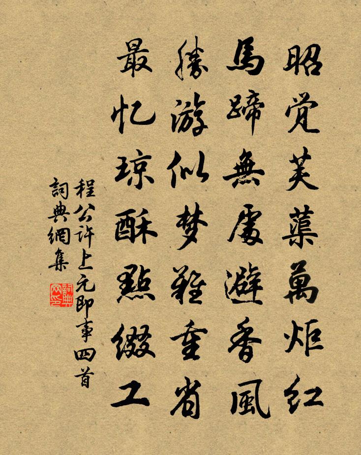 詩詞名句歷史字典書法欣賞書法字典國語詞典說文解字康熙字典古漢語字典標 題 作 者 詩 句 上元即事四首作者:程公許 朝代:宋代上元即事四首原文昭覺芙蕖萬炬紅,馬蹄無處避香風。勝游似夢難重省,最憶瓊酥點綴工。詩詞問答問:上元即事四首的作者是誰?答:程公許問:上元即事四首寫於哪個朝代?答:宋代程公許上元即事四首書法欣賞上元即事四首書法作品詩詞推薦龍泉山中釋善珍〔宋代〕夜半岩間坐看星,千年老樹有精靈。前山月上青楓頂,照見白鷳來聽經。台城雜詩七首曹勛〔宋代〕老境光陰怯雨霜,怕寒窒隙似猜防。養生飽悟風中燭,卜宅閒尋肘後方。明世漁樵終混跡,故山猿鶴怨循牆。天台秋日雜感(十首選一)陳子龍〔明代〕行吟坐嘯獨悲秋,海霧江雲引暮愁。不信有天常似醉,最憐無地可埋憂。荒荒葵井多新鬼,寂寂瓜田識故侯。見說青玉案陳亮〔宋代〕武陵溪上桃花路。見征騎、匆匆去。嘶入斜陽芳草渡。讀書窗下,彈琴石上,留得銷魂處。落花冉冉春將暮。空寫讀漢老弟中秋前一夕之詩似太淒切輒次韻勉釋虞儔〔宋代〕秋與詩人著意清,不平寧作候蟲鳴。間愁有底能千斛,久雨終當快一晴。富貴時來何足道,英雄天亦不徒生。來宵新春道中口占李新〔宋代〕榆莢已吹鵝眼去,柳綿不帶繭香來。輕霜未度劉郎鬢,更看春桃幾度開。軍中樂劉克莊〔宋代〕行營面面設刁斗,帳門深深萬人守。將軍貴重不據鞍,夜夜發兵防隘口。自言虜畏不敢犯,射麋捕鹿來行酒。更闌郡齋無訟春物寂然書所見宋庠〔宋代〕閣鈴無響晝輝遲,短髮山巾盡日欹。戰蟻群行開蟄後,暝禽相語欲棲時。遙通竇水添新溜,密數庭花記落枝。訟息隋門獨孤後周曇〔唐代〕腹生奚強有親疏,憐者為賢棄者愚。儲貳不遭讒構死,隋亡寧便在江都。新樓詩二十首城上薔薇李紳〔唐代〕薔薇繁艷滿城陰,爛熳開紅次第深。新蕊度香翻宿蝶,密房飄影戲晨禽。竇閨織婦慚詩句,南國佳人怨錦衾。風月偈頌三十首釋慧暉〔宋代〕綠岩枯木,不落人間。紅谷芳草,不厭溫寒。西南東北,各不相關。再用前韻贈高司理共八首陳造〔宋代〕詩語庸非自播揚,流傳朋舊定鬨堂。儒書投老空成癖,舞袖平生不解長。黃鳥啄殘丹杏顆,清風搖動綠筠香。山城點絳唇李萊老〔宋代〕綠染春波,袖羅金縷雙鸂鶒。小桃勻碧。香襯蟬雲濕。舞帶歌鈿,閒傍鞦韆立。情何極。燕鶯塵跡。芳草斜陽笛。獨游虎跑泉小庵范成大〔宋代〕苔徑彎環入,茅齋取次成。蔓花緣壁起,閒草上階生。宿雨松篁色,新晴燕雀聲。筒泉烹御米,聊共老僧傾。雨後元稹〔唐代〕倦寢數殘更,孤燈暗又明。竹梢餘雨重,時復拂簾驚。春詞毛滂〔宋代〕瑞日暉暉上,非煙冉冉收。晴川蠶可浴,翠瀲荇初流。奉使契丹二十八首其二十二學士院端午帖子二蘇轍〔宋代〕揚子江心瀉鏡龍,波如細縠不搖風。宮中禁捧秋天月,長照人心助至公。雪後月窗戲題曾幾〔宋代〕青女翻空一笑開,天花散盡更徘徊。嫦娥相與有瓜葛,也向讀書窗下來。詠懷張籍〔唐代〕老去多悲事,非唯見二毛。眼昏書字大,耳重覺聲高。望月偏增思,尋山易發勞。都無作官意,賴得在閒曹。小重山 喻牛子王哲〔元代〕堪嘆犢兒不喚牛。性如湍水急,碧波流。只知甘乳做膏油。長隨母,擺尾囗搖頭。漸漸騁無休。賓士山谷路,入溪名句推薦未知生,焉知死?孔子弟子《論語·先進篇》 勾引東風,也知芳思難禁。韓疁《高陽台·除夜》 門外綠陰千頃,兩兩黃鸝相應。曹組《如夢令·門外綠陰千頃》 疏懶意何長,春風花草香。黃庭堅《菩薩蠻·半煙半雨溪橋畔》 誰料蘇卿老歸國,茂陵松柏雨蕭蕭。李商隱《茂陵》 古人今人若流水,共看明月皆如此。李白《把酒問月·故人賈淳令予問之》 夫知人之性,莫難察焉。諸葛亮《將苑·卷一·知人性》 行路難!行路難!多歧路,今安在?李白《行路難三首》 日射人間五色芝,鴛鴦宮瓦碧參差。元好問《浣溪沙·日射人間五色芝》 可堪更近乾龍節,眼中淚盡空啼血向子諲《秦樓月·芳菲歇》